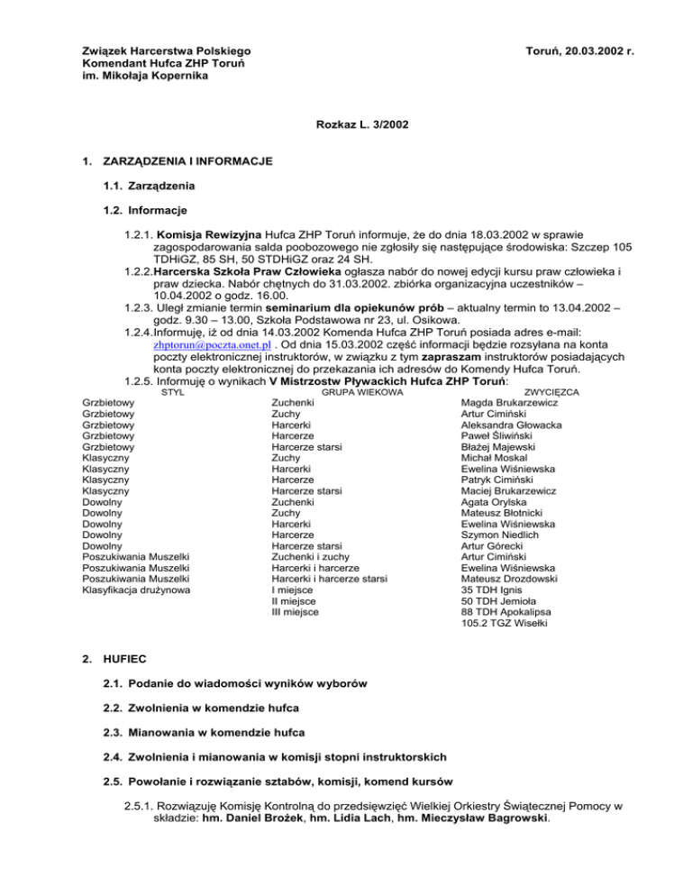 Związek Harcerstwa Polskiego Komendant Hufca ZHP Toruń im. Mikołaja Kopernika Toruń, 20.03.2002 r. Rozkaz L. 3/2002 1. ZARZĄDZENIA I INFORMACJE 1.1. Zarządzenia 1.2. Informacje 1.2.1. Komisja Rewizyjna Hufca ZHP Toruń informuje, że do dnia 18.03.2002 w sprawie zagospodarowania salda poobozowego nie zgłosiły się następujące środowiska: Szczep 105 TDHiGZ, 85 SH, 50 STDHiGZ oraz 24 SH. 1.2.2.Harcerska Szkoła Praw Człowieka ogłasza nabór do nowej edycji kursu praw człowieka i praw dziecka. Nabór chętnych do 31.03.2002. zbiórka organizacyjna uczestników – 10.04.2002 o godz. 16.00. 1.2.3. Uległ zmianie termin seminarium dla opiekunów prób – aktualny termin to 13.04.2002 – godz. 9.30 – 13.00, Szkoła Podstawowa nr 23, ul. Osikowa. 1.2.4.Informuję, iż od dnia 14.03.2002 Komenda Hufca ZHP Toruń posiada adres e-mail: [email protected] . Od dnia 15.03.2002 część informacji będzie rozsyłana na konta poczty elektronicznej instruktorów, w związku z tym zapraszam instruktorów posiadających konta poczty elektronicznej do przekazania ich adresów do Komendy Hufca Toruń. 1.2.5. Informuję o wynikach V Mistrzostw Pływackich Hufca ZHP Toruń: STYL Grzbietowy Grzbietowy Grzbietowy Grzbietowy Grzbietowy Klasyczny Klasyczny Klasyczny Klasyczny Dowolny Dowolny Dowolny Dowolny Dowolny Poszukiwania Muszelki Poszukiwania Muszelki Poszukiwania Muszelki Klasyfikacja drużynowa GRUPA WIEKOWA Zuchenki Zuchy Harcerki Harcerze Harcerze starsi Zuchy Harcerki Harcerze Harcerze starsi Zuchenki Zuchy Harcerki Harcerze Harcerze starsi Zuchenki i zuchy Harcerki i harcerze Harcerki i harcerze starsi I miejsce II miejsce III miejsce ZWYCIĘZCA Magda Brukarzewicz Artur Cimiński Aleksandra Głowacka Paweł Śliwiński Błażej Majewski Michał Moskal Ewelina Wiśniewska Patryk Cimiński Maciej Brukarzewicz Agata Orylska Mateusz Błotnicki Ewelina Wiśniewska Szymon Niedlich Artur Górecki Artur Cimiński Ewelina Wiśniewska Mateusz Drozdowski 35 TDH Ignis 50 TDH Jemioła 88 TDH Apokalipsa 105.2 TGZ Wisełki 2. HUFIEC 2.1. Podanie do wiadomości wyników wyborów 2.2. Zwolnienia w komendzie hufca 2.3. Mianowania w komendzie hufca 2.4. Zwolnienia i mianowania w komisji stopni instruktorskich 2.5. Powołanie i rozwiązanie sztabów, komisji, komend kursów 2.5.1. Rozwiązuję Komisję Kontrolną do przedsięwzięć Wielkiej Orkiestry Świątecznej Pomocy w składzie: hm. Daniel Brożek, hm. Lidia Lach, hm. Mieczysław Bagrowski. 2.5.2. Powołuję Kurs Zastępowych Hufca ZHP Toruń i mianuję komendę kursu w składzie: komendant kursu phm. Dominik Jan Domin, wykładowcy: Piotr Ryczkowski, Anna Węglewska, Katarzyna Wnuk – Lipińska, Kinga Marulewska, Ewa Długokencka, Urszula Orcholska, Michalina Wszelaki, Maciej Brukarzewicz, Radosław Ścisłowski, Miłosz Dybowski, instruktorzy: Wojciech Kardas, Marta Stanisławska, Wanda Brzezicka, Anna Chojnacka. 3. DRUŻYNY 3.1. Nadanie imion, nazw, sztandarów 3.1.1. Zmieniam nazwę 2 Gromady Zuchowej „Człapaje” na 2 Gromadę Zuchową „Płomyki”. 3.2. Zmiany organizacyjne 3.2.1. Otwieram okres próbny 9 Toruńskiej Drużynie Harcerskiej. 3.2.2. Otwieram okres próbny 105.2 Toruńskiej Drużynie Starszoharcerskiej. Nazwa zostanie drużynie nadana po poprawieniu błędu w pisowni zaproponowanej nazwy. 3.3. Zwolnienia i mianowania drużynowych 3.3.1. Mianuję drużynowym próbnej 9 Toruńskiej Drużyny Harcerskiej wyw. Wojciecha Kardasa. 3.3.2. Mianuję drużynowym próbnej 105.2 Toruńskiej Drużyny Starszoharcerskiej pwd. Tomasza Galubińskiego. 3.3.3. Zwalniam Krzysztofa Krzywińskiego z funkcji drużynowego 125 Toruńskiej Drużyny Harcerskiej „Aves”. 3.3.4.Mianuję drużynowym 125 Toruńskiej Drużyny harcerskiej „Aves” Wojciecha Bączka. 3.3.5.Zwalniam Krzysztofa Małysiaka z funkcji drużynowego 124 Toruńskiej Drużyny Harcerzy „Aqua”. 3.3.6.Mianuję drużynowym 124 Toruńskiej Drużyny harcerzy „Aqua” Piotra Ryczkowskiego. 3.3.7.Zwalniam Zofię Lewandowską z funkcji drużynowej 2 Gromady Zuchowej „Płomyki”. 3.3.8.Mianuję drużynową 2 Gromady Zuchowej „Płomyki” dh hm Halinę Dudlińską. 3.3.9.Zwalniam hm. Mirosławę Guz z funkcji drużynowej Drużyny Harcerskiej „Koniczynki”. 3.3.10. Mianuję drużynową Drużyny Harcerskiej „Koniczynki” dh Paulinę Kowalik. 4. KRĘGI 5. SZCZEPY I INNE ZWIĄZKI DRUŻYN 6. RUCHY PROGRAMOWO – METODYCZNE 7. HARCERSKA AKCJA LETNIA I ZIMOWA 8. MIANOWANIA INSTRUKTORÓW 8.1. Zamknięcie próby na stopień przewodnika 8.1.1. Na wniosek Komisji Stopni Instruktorskich z dnia 12.03.2002 zamykam próbę na stopień przewodnika z wynikiem negatywnym dh Emilii Karłowskiej. 8.1.2.Zamykam próbę na stopień przewodnika z wynikiem negatywnym dh Piotrowi Ziembikiewiczowi. 8.2. Otwarcie próby na stopień przewodnika 8.2.1. Na wniosek Komisji Stopni Instruktorskich z dnia 12.03.2002 otwieram próbę na stopień przewodnika sam. Michalinie Wszelaki, sam. Kindze Marulewskiej oraz sam. Marcie Stanisławskiej. 8.3. Zamknięcie próby na stopień podharcmistrza 8.4. Otwarcie próby na stopień podharcmistrza 8.4.1. Na wniosek Komisji Stopni Instruktorskich z dnia 12.03.2002 otwieram próbę na stopień podharcmistrza pwd. Joannie Matyasik oraz pwd. Żanecie Hinc. 9. ZALICZANIE SŁUŻBY INSTRUKTORSKIEJ 10. ZMIANY PRZYDZIAŁU 10.1. Informuję o zmianie przydziału pwd. Piotra Marka z Hufca ZHP Elbląg do Hufca ZHP Toruń. 11. WYSTĄPIENIA INSTRUKTORÓW, ZAWIESZENIA INSTRUKTORÓW, SKREŚLENIA Z LISTY CZŁONKÓW 12. KARY ORGANIZACYJNE 13. POCHWAŁY, WYRÓŻNIENIA, NAGRODY 13.1. Składam serdeczne podziękowanie Harcerskiemu Kręgowi Seniora „Bartek” oraz 85 Szczepowi Harcerskiemu „Bugaje” za zorganizowanie wyżywienia wolontariuszy podczas X Finału WOŚP. 13.2. Składam podziękowanie za zorganizowanie Wieczoru Kadrowego NHHT 86 TDH „Wega” oraz dh. Annie Węglewskiej za wzorowe pełnienie funkcji komendanta tej imprezy. 14. INNE 15. SPROSTOWANIA 15.1. Informuję, iż 