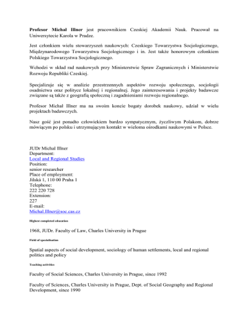 Profesor Michał Illner jest pracownikiem Czeskiej Akademii Nauk. Pracował na Uniwersytecie Karola w Pradze. Jest członkiem wielu stowarzyszeń naukowych: Czeskiego Towarzystwa Socjologicznego, Międzynarodowego Towarzystwa Socjologicznego i in. Jest takŜe honorowym członkiem Polskiego Towarzystwa Socjologicznego. Wchodzi w skład rad naukowych przy Ministerstwie Spraw Zagranicznych i Ministerstwie Rozwoju Republiki Czeskiej. Specjalizuje się w analizie przestrzennych aspektów rozwoju społecznego, socjologii osadnictwa oraz polityce lokalnej i regionalnej. Jego zainteresowania i projekty badawcze związane są takŜe z geografią społeczną i zagadnieniami rozwoju regionalnego. Profesor Michał Illner ma na swoim koncie bogaty dorobek naukowy, udział w wielu projektach badawczych. Nasz gość jest ponadto człowiekiem bardzo sympatycznym, Ŝyczliwym Polakom, dobrze mówiącym po polsku i utrzymującym kontakt w wieloma ośrodkami naukowymi w Polsce. JUDr Michal Illner Department: Local and Regional Studies Position: senior researcher Place of employment: Jilská 1, 110 00 Praha 1 Telephone: 222 220 728 Extension: 227 E-mail: [email protected] Highest completed education 1968, JUDr. Faculty of Law, Charles University in Prague Field of specialisation Spatial aspects of social development, sociology of human settlements, local and regional politics and policy Teaching activities Faculty of Social Sciences, Charles University in Prague, since 1992 Faculty of Sciences, Charles University in Prague, Dept. of Social Geography and Regional Development, since 1990 Foreign scholarships, fellowships or other academic study abroad 1967, Central Archive of Empirical Social Research, Cologne, Germany 1969-1970, Columbia University, New York City, USA, Bureau of Applied Social Research Membership or position in academic committees, boards, and institutions Masaryk Czech Sociological Association, since 1966 Czech Demographic Association, since 1974 Polish Sociological Association, since 1997 International Sociological Association, since 1990 European Urban Reseach Association, since 2001 Editorial Board, Sociologický časopis (Journal of Sociology, Czech), since 1991 Grant Agency of the Czech Republic, Sub-Committee for Sociology Scientific Council, Faculty of Social Sciences, Charles University in Prague Czech Statistical Council Scientific Council, The Ministry of Foreign Affairs of the Czech Republic Scientific Council, The Ministry of Environment of the Czech Republic