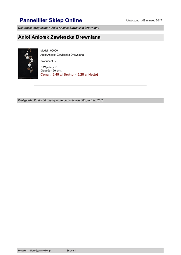 Pannelllier Sklep Online Dekoracje świąteczne > Anioł Aniołek Zawieszka Drewniana Anioł Aniołek Zawieszka Drewniana Model : 00000 Anioł Aniołek Zawieszka Drewniana Producent : �Wymiary :� Długość - 90 cm� Cena : 6,49 zł Brutto ( 5,28 zł Netto) Dostępność: Produkt dostępny w naszym sklepie od 08 grudzień 2016 kontakt : - [email protected] Strona 1 Utworzono : 08 marzec 2017