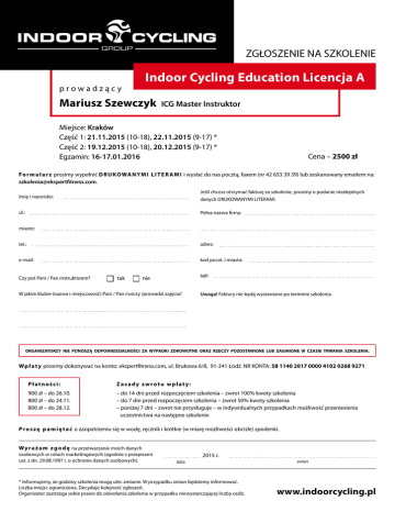ZGŁOSZENIE NA SZKOLENIE prowadzący Indoor Cycling Education Licencja A Mariusz Szewczyk ICG Master Instruktor Miejsce: Kraków Część 1: 21.11.2015 (10-18), 22.11.2015 (9-17) * Część 2: 19.12.2015 (10-18), 20.12.2015 (9-17) * Egzamin: 16-17.01.2016 Cena – 2500 zł Fo r m u l a r z prosimy wypełnić D R U KO WA N YM I L I T E R A M I i wysłać do nas pocztą, faxem (nr 42 653 39 39) lub zeskanowany emailem na: [email protected]. Imię i nazwisko: Jeśli chcesz otrzymać fakturę za szkolenie, prosimy o podanie niezbędnych danych DRUKOWANYMI LITERAMI. ul.: Pełna nazwa firmy: miasto: tel.: adres: e-mail: kod poczt. i miasto: Czy jest Pani / Pan instruktorem? tak NIP: nie W jakim klubie (nazwa i miejscowość) Pani / Pan ćwiczy /prowadzi zajęcia? Uwaga! Faktury nie będą wystawiane po terminie szkolenia. ORGANIZATORZY NIE PONOSZĄ ODPOWIEDZIALNOŚCI ZA WYPADKI ZDROWOTNE ORAZ RZECZY POZOSTAWIONE LUB ZAGINIONE W CZASIE TRWANIA SZKOLENIA. Wp ł a t y prosimy dokonywać na konto: ekspertfitness.com, ul. Brukowa 6/8, 91-341 Łódź. NR KONTA: 58 1140 2017 0000 4102 0268 9271 Płatności: Zasady zwrotu wpłaty: 900 zł – do 26.10. 800 zł – do 24.11. 800 zł – do 28.12. – do 14 dni przed rozpoczęciem szkolenia – zwrot 100% kwoty szkolenia – do 7 dni przed rozpoczęciem szkolenia – zwrot 50% kwoty szkolenia – poniżej 7 dni – zwrot nie przysługuje – w indywidualnych przypadkach możliwość przeniesienia uczestnictwa na następne szkolenie P r o s z ę p a m i ę t a ć o zaopatrzeniu się w wodę, ręcznik i krótkie (w miarę możliwości obcisłe) spodenki. W y r a ż a m z g o d ę na przetwarzanie moich danych osobowych w celach marketingowych (zgodnie z przepisami ust. z dn. 29.08.1997 r. o ochronie danych osobowych). 2015 r. data * Informujemy, że godziny szkolenia mogą ulec zmianie. W przypadku zmian będziemy informować. Liczba miejsc ograniczona. Decyduje kolejność zgłoszeń. Organizator zastrzega sobie prawo do odwołania szkolenia w przypadku niewystarczającej liczby osób. podpis www.indoorcycling.pl