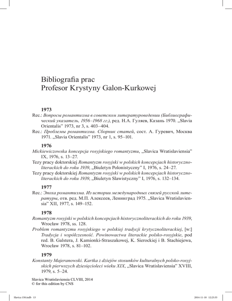 Bibliografia prac Profesor Krystyny Galon-Kurkowej 1973 Rec.: Вопросы романтизма в советском литературоведении (Библиографический указатель, 1956–1968 гг.), ред. Н.А. Гуляев, Казань 1970. „Slavia Orientalis” 1973, nr 3, s. 403–404. Rec.: Проблемы романтизма. Сборник статей, cост. А. Гуревич, Москва 1971. „Slavia Orientalis” 1973, nr 1, s. 95–101. 1976 Mickiewiczowska koncepcja rosyjskiego romantyzmu, „Slavica Wratislaviensia” IX, 1976, s. 13–27. Tezy pracy doktorskiej Romantyzm rosyjski w polskich koncepcjach historycznoliterackich do roku 1939, „Biuletyn Polonistyczny” I, 1976, s. 24–27. Tezy pracy doktorskiej Romantyzm rosyjski w polskich koncepcjach historycznoliterackich do roku 1939, „Biuletyn Slawistyczny” I, 1976, s. 132–134. 1977 Rec.: Эпоха романтизма. Из истории международных связей русской литературы, oтв. ред. М.П. Алексеев, Ленинград 1975. „Slavica Wratislaviensia” XII, 1977, s. 149–152. 1978 Romantyzm rosyjski w polskich koncepcjach historycznoliterackich do roku 1939, Wrocław 1978, ss. 128. Problem romantyzmu rosyjskiego w polskiej tradycji krytycznoliterackiej, [w:] Tradycja i współczesność. Powinowactwa literackie polsko-rosyjskie, pod red. B. Galstera, J. Kamionki-Straszakowej, K. Sierockiej i B. Stachiejewa, Wrocław 1978, s. 81–102. 1979 Konstanty Majeranowski. Kartka z dziejów stosunków kulturalnych polsko-rosyjskich pierwszych dziesięcioleci wieku XIX, „Slavica Wratislaviensia” XVIII, 1979, s. 5–24. Slavica Wratislaviensia CLVIII, 2014 © for this edition by CNS Slavica 158.indb 13 2014-11-18 12:23:35 14 • Bibliografia prac Profesor Krystyny Galon-Kurkowej Rec.: Е.А. Маймин, О русском романтизме. Книга для учителя, Москва 1975. „Slavica Wratislaviensia” XVI, 1979, s. 100–108. Rec.: N. Ejdelman, Łunin — adiutant Wielkiego Księcia Konstantego, przeł. W. i R. Śliwowscy, Warszawa 1976. „Slavica Wratislaviensia” XVI, 1979, s. 114–118. Rec.: Zwierciadło prasy. Czasopisma XIX wieku o literaturze rosyjskiej, pod red. B. Galstera, J. Kamionki-Straszakowej, K. Sierockiej, przy współudziale A. Piorunowej, Wrocław 1978. „Slavica Wratislaviensia” XVIII, 1979, s. 175–178. 1980 Malarski charakter percepcji świata w „Wadimie” Lermontowa, „Slavica Wratislaviensia” XX, 1980, s. 41–60. „Na wyżynach wolności…” (Z problematyki pobytu Piotra Wiaziemskiego w Krakowie), „Studia Polono-Slavica-Orientalia. Acta Litteraria” VI, 1980, s. 5–24. Rec.: H. Mazurek-Wita, Powieści Wasyla Narieżnego na tle prozy satyryczno-obyczajowej XVIII i początku XIX wieku, Wrocław 1978. „Slavica Wratislaviensia” XXI, 1980, s. 106–110. Rec.: Z. Mejszutowicz, Powieść obyczajowa Tadeusza Bułharyna, Wrocław 1978. „Slavica Wratislaviensia” XXI, 1980, s. 110–113. 1981 Piotr Wiaziemski a tradycja kościuszkowska, „Slavia Orientalis” 1981, nr 3, s. 263–280. 1982 Puszkinowska interpretacja ognia, „Slavica Wratislaviensia” XXII, 1982, s. 3–13. „Skwoz’ tuman kriemnistyj put’ blestit…” (Motyw wędrówki w liryce Michała Lermontowa), „Slavica Wratislaviensia” XXII, 1982, s. 3–25. Rec.: История романтизма в русской литературе. Возникновение и утверждение романтизма в русской литературе (1790–1825), oтв. ред. А.С. Курилов, Москва 1979. „Slavica Wratislaviensia” XXIII, 1982, s. 139–142. Rec.: От романтизма к реализму. Из истории международных связей русской литературы, oтв. ред. М.П. Алексеев, Ленинград 1978. „Slavica Wratislaviensia” XXII, 1982, s. 115–119. 1983 Rec.: Библиография литературы о М.Ю. Лермонтове (1917–1977 гг.), cост. О.В. Миллер, Ленинград 1970. „Slavica Wratislaviensia” XXV, 1983, s. 97–98. Rec.: B. Mucha, Dekabryści, Warszawa 1979. „Slavica Wratislaviensia” XXV, 1983, s. 96–97. Slavica Wratislaviensia CLVIII, 2014 © for this edition by CNS Slavica 158.indb 14 2014-11-18 12:23:35 Bibliografia prac Profesor Krystyny Galon-Kurkowej • 15 1984 Nad prozą Michała Lermontowa, Wrocław 1984, ss. 268. Kategoria „naszych czasów” w powieści Lermontowa „Księżna Ligowska”, [w:] Powieść rosyjska XIX i XX wieku, pod red. S. Poręby, Katowice 1984, s. 7–27. Świat poetycki Konstantego Batiuszkowa, „Slavica Wratislaviensia” XXXI, 1984, s. 3–28. Rec.: В.Н. Баскаков, Пушкинский Дом, 1905–1930–1980 (Исторический очерк), Ленинград 1980. „Slavica Wratislaviensia” XXIX, 1984, s. 114–116. Rec.: Лермонтовская энциклопедия, глав. ред. В.А. Мануйлов, Москва 1981. „Slavica Wratislaviensia” XXXI, 1984, s. 107–108. 1985 Z problematyki artystycznej „Bohatera naszych czasów” Michała Lermontowa („Dziennik Pieczorina” jako narzędzie i źródło samowiedzy), „Slavica Wratislaviensia” XXXIII, 1985, s. 29–56. Rec.: П.А. Вяземский, Сочинения, cоставление, подготовка текста, вступительная статья и примечания М.И. Гиллельсона, т. I–II, Москва 1982. „Slavica Wratislaviensia” XXXVI, 1985, s. 109–112. Rec.: „Zeszyty Naukowe Wyższej Szkoły Pedagogicznej w Bydgoszczy”. Studia Filologiczne 13, 1981. „Slavica Wratislaviensia” XXXVI, 1985, s. 112–116. Współautorka: D. Wieczorek. 1987 Mieszkańcy Krainy Czułości (Z problematyki antropologicznej rosyjskiej prozy sentymentalnej), „Slavica W