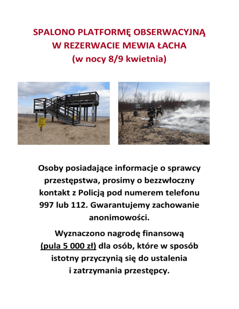 SPALONO PLATFORMĘ OBSERWACYJNĄ W REZERWACIE MEWIA ŁACHA (w nocy 8/9 kwietnia) Osoby posiadające informacje o sprawcy przestępstwa, prosimy o bezzwłoczny kontakt z Policją pod numerem telefonu 997 lub 112. Gwarantujemy zachowanie anonimowości. Wyznaczono nagrodę finansową (pula 5 000 zł) dla osób, które w sposób istotny przyczynią się do ustalenia i zatrzymania przestępcy.