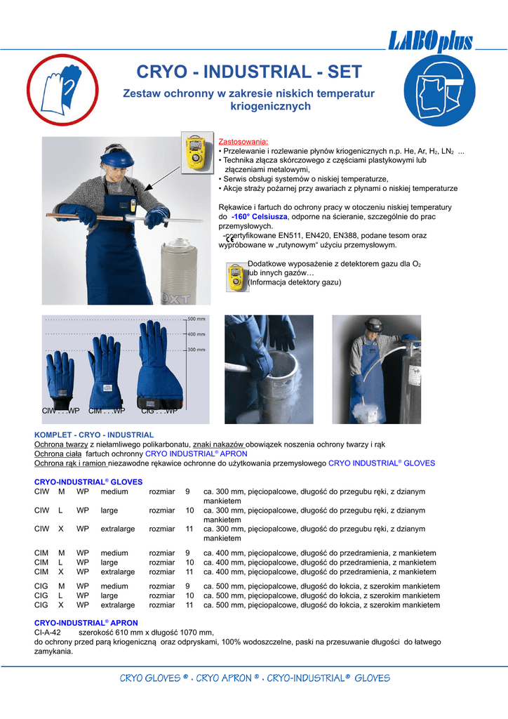 CRYO - INDUSTRIAL - SET Zestaw ochronny w zakresie niskich temperatur kriogenicznych Zastosowania: • Przelewanie i rozlewanie płynόw kriogenicznych n.p. He, Ar, H2, LN2 ... • Technika złącza skόrczowego z częściami plastykowymi lub złączeniami metalowymi, • Serwis obsługi systemόw o niskiej temperaturze, • Akcje straży pożarnej przy awariach z płynami o niskiej temperaturze Rękawice i fartuch do ochrony pracy w otoczeniu niskiej temperatury do -160° Celsiusza, odporne na ścieranie, szczegόlnie do prac przemysłowych. -ccertyfikowane EN511, EN420, EN388, podane tesom oraz wyprόbowane w „rutynowym“ użyciu przemysłowym. Dodatkowe wyposażenie z detektorem gazu dla O2 lub innych gazόw… (Informacja detektory gazu) CIW . . .WP CIM . . .WP CIG . . .WP KOMPLET - CRYO - INDUSTRIAL Ochrona twarzy z niełamliwego polikarbonatu, znaki nakazόw obowiązek noszenia ochrony twarzy i rąk Ochrona ciała fartuch ochronny CRYO INDUSTRIAL® APRON Ochrona rąk i ramion niezawodne rękawice ochronne do użytkowania przemysłowego CRYO INDUSTRIAL® GLOVES CRYO-INDUSTRIAL® GLOVES CIW M WP medium rozmiar 9 CIW L WP large rozmiar 10 CIW X WP extralarge rozmiar 11 CIM CIM CIM M L X WP WP WP medium large extralarge rozmiar rozmiar rozmiar 9 10 11 ca. 400 mm, pięciopalcowe, długość do przedramienia, z mankietem ca. 400 mm, pięciopalcowe, długość do przedramienia, z mankietem ca. 400 mm, pięciopalcowe, długość do przedramienia, z mankietem CIG CIG CIG M L X WP WP WP medium large extralarge rozmiar rozmiar rozmiar 9 10 11 ca. 500 mm, pięciopalcowe, długość do łokcia, z szerokim mankietem ca. 500 mm, pięciopalcowe, długość do łokcia, z szerokim mankietem ca. 500 mm, pięciopalcowe, długość do łokcia, z szerokim mankietem ca. 300 mm, pięciopalcowe, długość do przegubu ręki, z dzianym mankietem ca. 300 mm, pięciopalcowe, długość do przegubu ręki, z dzianym mankietem ca. 300 mm, pięciopalcowe, długość do przegubu ręki, z dzianym mankietem CRYO-INDUSTRIAL® APRON CI-A-42 szerokość 610 mm x długość 1070 mm, do ochrony przed parą kriogeniczną oraz odpryskami, 100% wodoszczelne, paski na przesuwanie długości do łatwego zamykania.