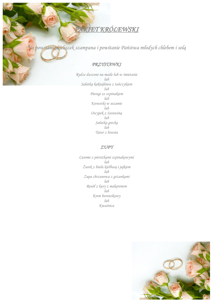 PAKIET KRÓLEWSKI Na powitanie kieliszek szampana i powitanie Państwa młodych chlebem i solą PRZYSTAWKI Rydze duszone na maśle lub w śmietanie lub Sałatka koktajlowa z tuńczykiem lub Pierogi ze szpinakiem lub Krewetki w sezamie lub Oscypek z żurawiną lub Sałatka grecka lub Tatar z łososia ZUPY Casome z pierożkami szpinakowymi lub Żurek z biała kiełbasą i jajkiem lub Zupa chrzanowa z grzankami lub Rosół z kury z makaronem lub Krem borowikowy lub Kwaśnica DANIA GŁÓWNE (jedna pełna porcja lub dwie połówki do wyboru z pozycji drób lub schab& wieprzowina) DRÓB Filet z indyka faszerowany morelami, marynowany w sosie pomarańczowymi lub Dramsztyki marynowane w sosie jabłkowo-miętowym lub Filet Faszerowany grzybami w sosie lub Filet z kurczaka w sosie czosnkowym lub Pierś panierowana płatkami lub Filet zapiekany z serem Kotlet Devolay SCHAB & WIEPRZOWINA Polędwica wieprzowa z sosem (do wyboru: borowikowy, kurkowy, biały, pieczeniowy...) lub Polędwica wieprzowa faszerowana ze szpinakiem lub Schab faszerowany pieczarkami i serem lub Schab duszony w sosie własnym lub Pieczeń faszerowana jarzynami lub Szaszłyk z polędwicy w sosie lub Schab ze śliwkami i morelami lub Karczek w sosie własnym lub Schab z pieczarkami lub Schab panierowany DODATKI (jedna z pozycji do wyboru) Ziemniaki: gotowane, pieczone, opiekane, puree lub Ryż biały, pilaw doprawiany, na słodko lub Kluski śląskie lub Dufinki lub Frytki SURÓWKI ( do wyboru) Kapusta pekińska z pomidorem i ogórkiem lub Buraczki\czerwona kapusta lub Surówka z białej kapusty lub Kapusta zasmażana lub Zestaw surówek lub Sałatka cezar DESER (jedna z pozycji do wyboru) Lody z dodatkami (owoce, bita śmietana, sos, advocat, czekolada) lub Jabłka pieczone nadziewane migdałami i żurawiną lub Bana pieczony w sosie pomarańczowym lub Suflet z lodami śmietankowymi lub Lody w pomarańczy lub Gruszki w szodonie lub Ciasto tortowe Po uroczystym obeidzie oferujemy zimny bufet PRZEKĄSKI (oferta obejmuje każdą pozycję) KORECZKI ŚLEDZIOWE ŁOSOŚ WĘDZONY Z KAPARAMI I CYTRYNĄ PSTRĄG WĘDZONY Z CYTRYNĄ GALARETKA DROBIOWA SCHAB FASZERWANY SZPINAKIEM KURCZAK FASZEROWANY INDYK W GALARECIE SANDACZ W GALARECIE SAŁATKA JARZYNOWA SAŁATKA GRECKA KOKTAIL Z KREWETEK SAŁATKA KRABOWA SOS TATARSKI SOS CHRZANOWY TALERZ WĘDLIN TALERZ SERÓW OLIWKI OWOCE Jako II, III i IV danie gorące oferujemy DANIA GORĄCE (trzy do wyboru) Barszcz z jajkiem, białą kiełbasą, uszkami, kołdunami, ziemniakami lub Filet z grilla na ryżu w warzywami i sosem czosnkowym lub Barszcz z krokietem, pasztecikiem, rogalem francuskim lub Żurek z jajkiem, biała kiełbasą lub ziemnakimi lub Kwaśnica z żeberkiem i ziemniakami lub Gulasz po burgundzku lub Fasolka po bretońsku lub Zupa gulaszowa lub Beuf Strogonof lub Borgacz lub Bigos Oferujemy pełną gamę napoi NAPOJE: Soki:pomarańczowy, brzoskwiniowy, jabłkowy.... Woda mineralna Herbata Kawa Coca-cola Fanta Sprite Dodatkowo polecamy: Stół góralski 2500zł: OSCYPKI KIEŁBASY WĘDLINY SMALEC OGÓRKI CHLEB WIEJSKI KWAŚNICA Z ŻEBERKIEM BEUF STROGONOF PIEROGI- MIX PROSIE PIECZONE FONTANNA CZEKOLADOWA + OWOCE – 600zł OFERTA OBEJMUJE : 1-PEŁNY POSIŁEK (ZUPA + DANIE GŁOWNE + SURÓWKI + DESER) 3-GORĄCE POSIŁKI (DO WYBORU Z POWYŻSZEJ PROPOZYCJI ) ZIMNA PŁYTA (CAŁA PROPOZYCJA Z KARTY „PRZEKĄSKI”) SOKI& NAPOJE - nielimitowane KAWA&HERBATA- nielimiotwane SZAMPAN POWITALNY PROFESJONALNĄ OBSŁUGĘ KELNERSKĄ WYNAJĘCIE EKSKLUZYWNEJ „SALI KRYSZTAŁOWEJ” ORAZ W PREZENCIE OD HOTELU APARTAMENT DLA PAŃSTWA MŁODYCH!!! DODATKOWO CIASTO 10ZŁ/OSOBĘ KOSZT PRZYJĘCIA WESELNEGO PRZY WYBORZE POWYŻSZEGO MENU NA ROK A.D. 2010 -190ZŁ*/OSOBĘ (GDY ZAMAWIAMY ALKOHOL) -200ZŁ*/OSOBĘ (GDY PAŃSTWO MŁODZI NA WŁASNĄ RĘKE ZAMAWIAJĄ ALKOHOL -wymagana faktura) DZIECI DO LAT 4 GRATIS DZIECI OD 4LAT DO 10 LAT POŁOWA CENY ZADATEK PRZYJMUJEMY W DNIU REZERWACJI,. WYSOKOŚĆ ZADATKU 1000ZŁ CAŁOŚCIOWE ROZLICZENIE DO DWÓCH DNI PO PRZYJĘCIU WESELNYM LICZBA GOŚCI POTWIERDZONA 5 DNI PRZED PRZYJĘCIEM WESELNYM * podana cena nie zawiera ahkoholu oraz ciasta