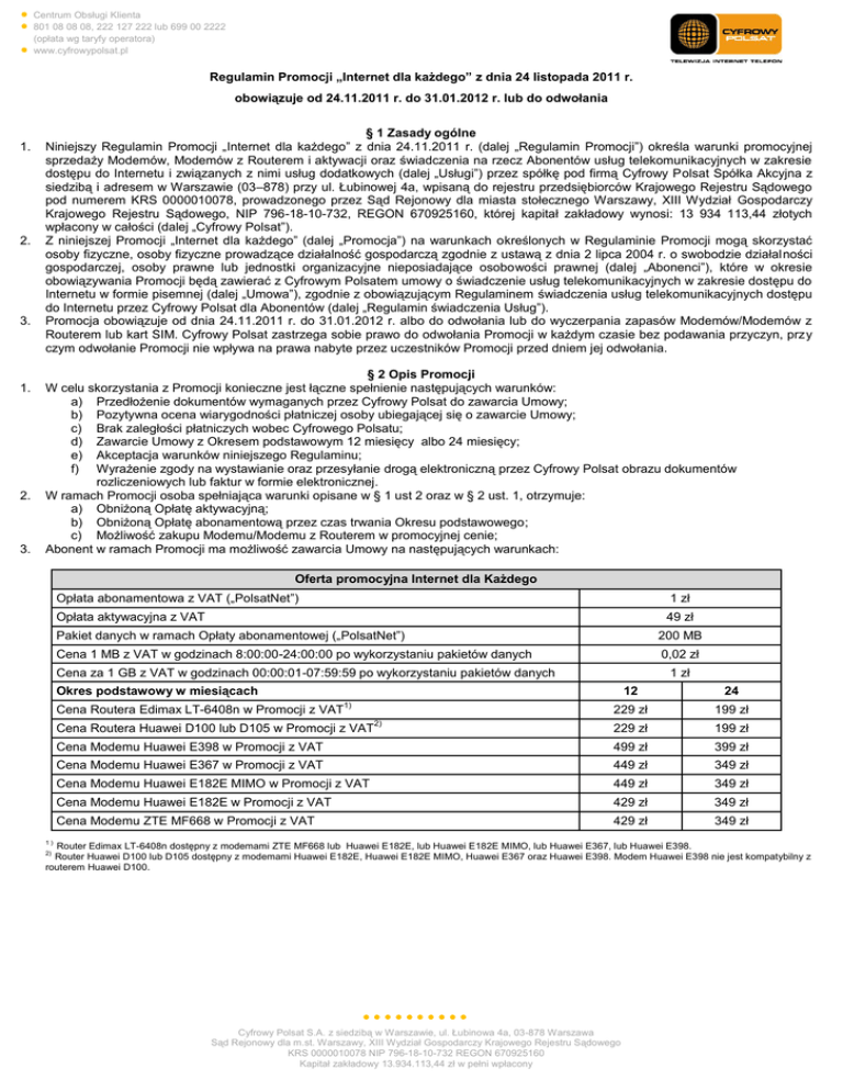 Centrum Obsługi Klienta 801 08 08 08, 222 127 222 lub 699 00 2222 (opłata wg taryfy operatora) www.cyfrowypolsat.pl Regulamin Promocji „Internet dla każdego” z dnia 24 listopada 2011 r. obowiązuje od 24.11.2011 r. do 31.01.2012 r. lub do odwołania 1. 2. 3. 1. 2. 3. § 1 Zasady ogólne Niniejszy Regulamin Promocji „Internet dla każdego” z dnia 24.11.2011 r. (dalej „Regulamin Promocji”) określa warunki promocyjnej sprzedaży Modemów, Modemów z Routerem i aktywacji oraz świadczenia na rzecz Abonentów usług telekomunikacyjnych w zakresie dostępu do Internetu i związanych z nimi usług dodatkowych (dalej „Usługi”) przez spółkę pod firmą Cyfrowy Polsat Spółka Akcyjna z siedzibą i adresem w Warszawie (03–878) przy ul. Łubinowej 4a, wpisaną do rejestru przedsiębiorców Krajowego Rejestru Sądowego pod numerem KRS 0000010078, prowadzonego przez Sąd Rejonowy dla miasta stołecznego Warszawy, XIII Wydział Gospodarczy Krajowego Rejestru Sądowego, NIP 796-18-10-732, REGON 670925160, której kapitał zakładowy wynosi: 13 934 113,44 złotych wpłacony w całości (dalej „Cyfrowy Polsat”). Z niniejszej Promocji „Internet dla każdego” (dalej „Promocja”) na warunkach określonych w Regulaminie Promocji mogą skorzystać osoby fizyczne, osoby fizyczne prowadzące działalność gospodarczą zgodnie z ustawą z dnia 2 lipca 2004 r. o swobodzie działal ności gospodarczej, osoby prawne lub jednostki organizacyjne nieposiadające osobowości prawnej (dalej „Abonenci”), które w okresie obowiązywania Promocji będą zawierać z Cyfrowym Polsatem umowy o świadczenie usług telekomunikacyjnych w zakresie dostępu do Internetu w formie pisemnej (dalej „Umowa”), zgodnie z obowiązującym Regulaminem świadczenia usług telekomunikacyjnych dostępu do Internetu przez Cyfrowy Polsat dla Abonentów (dalej „Regulamin świadczenia Usług”). Promocja obowiązuje od dnia 24.11.2011 r. do 31.01.2012 r. albo do odwołania lub do wyczerpania zapasów Modemów/Modemów z Routerem lub kart SIM. Cyfrowy Polsat zastrzega sobie prawo do odwołania Promocji w każdym czasie bez podawania przyczyn, przy czym odwołanie Promocji nie wpływa na prawa nabyte przez uczestników Promocji przed dniem jej odwołania. § 2 Opis Promocji W celu skorzystania z Promocji konieczne jest łączne spełnienie następujących warunków: a) Przedłożenie dokumentów wymaganych przez Cyfrowy Polsat do zawarcia Umowy; b) Pozytywna ocena wiarygodności płatniczej osoby ubiegającej się o zawarcie Umowy; c) Brak zaległości płatniczych wobec Cyfrowego Polsatu; d) Zawarcie Umowy z Okresem podstawowym 12 miesięcy albo 24 miesięcy; e) Akceptacja warunków niniejszego Regulaminu; f) Wyrażenie zgody na wystawianie oraz przesyłanie drogą elektroniczną przez Cyfrowy Polsat obrazu dokumentów rozliczeniowych lub faktur w formie elektronicznej. W ramach Promocji osoba spełniająca warunki opisane w § 1 ust 2 oraz w § 2 ust. 1, otrzymuje: a) Obniżoną Opłatę aktywacyjną; b) Obniżoną Opłatę abonamentową przez czas trwania Okresu podstawowego; c) Możliwość zakupu Modemu/Modemu z Routerem w promocyjnej cenie; Abonent w ramach Promocji ma możliwość zawarcia Umowy na następujących warunkach: Oferta promocyjna Internet dla Każdego Opłata abonamentowa z VAT („PolsatNet”) 1 zł Opłata aktywacyjna z VAT 49 zł Pakiet danych w ramach Opłaty abonamentowej („PolsatNet”) 200 MB Cena 1 MB z VAT w godzinach 8:00:00-24:00:00 po wykorzystaniu pakietów danych 0,02 zł Cena za 1 GB z VAT w godzinach 00:00:01-07:59:59 po wykorzystaniu pakietów danych 1 zł Okres podstawowy w miesiącach 1) Cena Routera Edimax LT-6408n w Promocji z VAT 2) 12 24 229 zł 199 zł 229 zł 199 zł Cena Modemu Huawei E398 w Promocji z VAT 499 zł 399 zł Cena Modemu Huawei E367 w Promocji z VAT 449 zł 349 zł Cena Modemu Huawei E182E MIMO w Promocji z VAT 449 zł 349 zł Cena Modemu Huawei E182E w Promocji z VAT 429 zł 349 zł Cena Modemu ZTE MF668 w Promocji z VAT 429 zł 349 zł Cena Routera Huawei D100 lub D105 w Promocji z VAT 1) Router Edimax LT-6408n dostępny z modemami ZTE MF668 lub Huawei E182E, lub Huawei E182E MIMO, lub Huawei E367, lub Huawei E398. Router Huawei D100 lub D105 dostępny z modemami Huawei E182E, Huawei E182E MIMO, Huawei E367 oraz Huawei E398. Modem Huawei E398 nie jest kompatybilny z routerem Huawei D100. 2) Cyfrowy Polsat S.A. z siedzibą w Warszawie, ul. Łubinowa 4a, 03-878 Warszawa Sąd Rejonowy dla m.st. Warszawy, XIII Wydział Gospodarczy Krajowego Rejestru Sądowego KRS 0000010078 NIP 796-18-10-732 REGON 670925160 Kapitał zakładowy 13.934.113,44 zł w pełni wpłacony Centrum Obsługi Klienta 801 08 08 08, 222 127 222 lub 699 00 2222 (opłata wg taryfy operatora) www.cyfrowypolsat.pl 4. Abonent, który zawierając Umowę zleci w ramach Promocji aktywację Cyklicznego pakietu danych, ma możliwość zawarcia Umowy na następujących warunkach: Pakiet Oplata abonamentowa z VAT („PolsatNet”) Opłata za Cykliczny pakiet danych z VAT Łączna opłata miesięczna z VAT Opłata aktywacyjna z VAT Cena za SMS wysłany z modemu (z VAT)3) Pakiet danych w ramach opłaty abonamentowej do wykorzystania tylko w godzinach 08:00:00-24:00:00 Darmowe Noce4) Cena 1 MB z VAT w godzinach 8:00:00-24:00:00 po wykorzystaniu pakietów danych Cena za 1 GB z VAT w godzinach 00:00:01-07:59:59 po wykorzystaniu pakietów danych Okres podstawowy w miesiącach Cena Routera Edimax LT-6408n w Promocji z VAT5) Cena Routera Huawei D100 lub D105 w Promocji z VAT6) Cena Modemu Huawei E398 w Promocji z VAT Cena Modemu Huawei E367 w Promocji z VAT Cena Modemu Huawei E182E MIMO w Promocji z VAT Cena Modemu Huawei E182E w Promocji z VAT Cena Modemu ZTE MF668 w Promocji z VAT Pakiet PolsatNet 3 GB Pakiet PolsatNet 5 GB Pakiet PolsatNet 10 GB Pakiet PolsatNet 25 GB 1 zł 29 zł 30 zł 1 zł 49 zł 50 zł 1 zł 69 zł 70 zł 1 zł 119 zł 120 zł 10 GB 25 GB 49 zł 0,20 zł 3 GB 5 GB BEZP