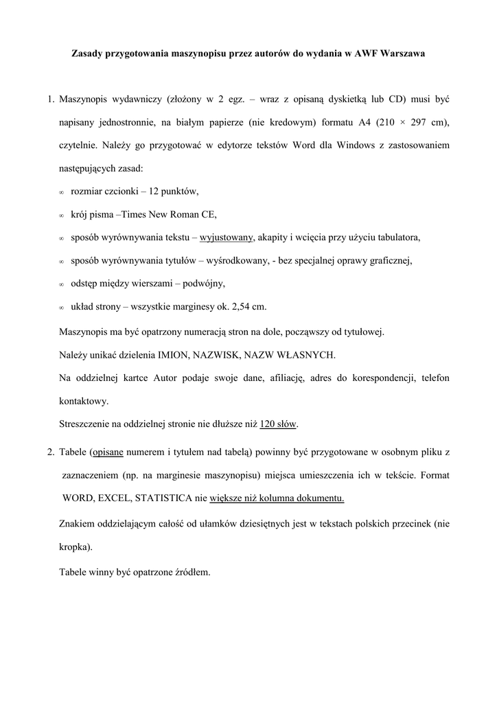 Zasady przygotowania maszynopisu przez autorów do wydania w AWF Warszawa 1. Maszynopis wydawniczy (złoŜony w 2 egz. – wraz z opisaną dyskietką lub CD) musi być napisany jednostronnie, na białym papierze (nie kredowym) formatu A4 (210 × 297 cm), czytelnie. NaleŜy go przygotować w edytorze tekstów Word dla Windows z zastosowaniem następujących zasad: • rozmiar czcionki – 12 punktów, • krój pisma –Times New Roman CE, • sposób wyrównywania tekstu – wyjustowany, akapity i wcięcia przy uŜyciu tabulatora, • sposób wyrównywania tytułów – wyśrodkowany, - bez specjalnej oprawy graficznej, • odstęp między wierszami – podwójny, • układ strony – wszystkie marginesy ok. 2,54 cm. Maszynopis ma być opatrzony numeracją stron na dole, począwszy od tytułowej. NaleŜy unikać dzielenia IMION, NAZWISK, NAZW WŁASNYCH. Na oddzielnej kartce Autor podaje swoje dane, afiliację, adres do korespondencji, telefon kontaktowy. Streszczenie na oddzielnej stronie nie dłuŜsze niŜ 120 słów. 2. Tabele (opisane numerem i tytułem nad tabelą) powinny być przygotowane w osobnym pliku z zaznaczeniem (np. na marginesie maszynopisu) miejsca umieszczenia ich w tekście. Format WORD, EXCEL, STATISTICA nie większe niŜ kolumna dokumentu. Znakiem oddzielającym całość od ułamków dziesiętnych jest w tekstach polskich przecinek (nie kropka). Tabele winny być opatrzone źródłem. 3. Rysunki, wykresy, schematy i inne pliki graficzne naleŜy określać jednym terminem, np. rys. lub ryc. Powinny być one wykonane w programach Excel, Statistica, Corel (maksymalnie 13 × 17 cm). Rysunki skanowane (o rozdzielczości min. 300dpi) powinny być zachowane w formacie *.TIFF, *.JPG, *BMP. Rysunki powinny być ponumerowane, opisane pod ryciną (na marginesie maszynopisu naleŜy zaznaczyć miejsce włączenia ich do tekstu). KaŜda rycina na oddzielnej stronie nie większa niŜ kolumna dokumentu. Odbitki fotograficzne (czarno-białe) powinny być przygotowane w formacie nie mniejszym niŜ późniejsze reprodukcje w ksiąŜce, na papierze błyszczącym, o odpowiednim kontraście. JeŜeli fotografie przedstawiają rozpoznawalne sylwetki naleŜy dołączyć zgodę osób fotografowanych na opublikowanie zdjęć z ich podobizną. Pod ryciną naleŜy podać źródło. 4. Do zrobienia indeksu nazwisk lub indeksu rzeczowego niezbędne jest przygotowanie przez autora wykazu haseł oraz zaznaczenie do jakiego obszaru tekstu mają się one odnosić. 5. Piśmiennictwo powinno być umieszczone na końcu pracy, ponumerowane i ustawione alfabetycznie według nazwisk autorów, a prace jednego autorstwa według lat wydania, od najstarszych do najnowszych dodatkowo odróŜnione literami (a, b, c..) przy roku wydania w przypadku tego samego roku wydania. W tekście jako odsyłacz występuje nazwisko autora i rok wydania ujęte w nawias okrągły, np. (Charzewski 1987, s. 15) lub w przypadku powołania na nr publikacji z listy piśmiennictwa, numer ujęty w nawias kwadratowy np. [16]. W pracach zbiorowych naleŜy szczególnie konsekwentnie przestrzegać jednolitego zapisu piśmiennictwa we wszystkich rozdziałach. Opis bibliograficzny powinien zawierać następujące elementy: – nazwisko i inicjał (lub inicjały) imienia autora (autorów) lub redaktora, – rok wydania, – tytuł pracy, tom, zeszyt, – wydawca lub pełny tytuł czasopisma (rocznik, numer i strony), – miejsce wydania (nie podaje się w przypadku czasopism). Przykłady opisów bibliograficznych: 1. Kutzner-Kozińska M. [red.] (2002): Proces korygowania wad postawy. AWF, Warszawa, ss. 394. 2. Norkowski H. (2002): Intensywność wysiłku meczowego w piłce ręcznej u zawodników pełniących róŜne funkcje w grze. Wychowanie Fizyczne i Sport Tom XLVI, vol. 46, nr 2, s. 197-208. 3. Stupnicki R., Przewęda R., Milde K. (2002): Centylowe siatki sprawności fizycznej polskiej młodzieŜy wg testów Eurofit. AWF, Studia i Monografie nr 87, Warszawa, ss. 67. 4. Trzcińska D. (2002): Gimnastyka osiowo-symetryczna trójpłaszczyznowa (GOST) – Metoda Hoppe. W: Kutzner-Kozińska M. [red.]: Proces korygowania wad postawy. AWF, Warszawa, s. 297-306.
