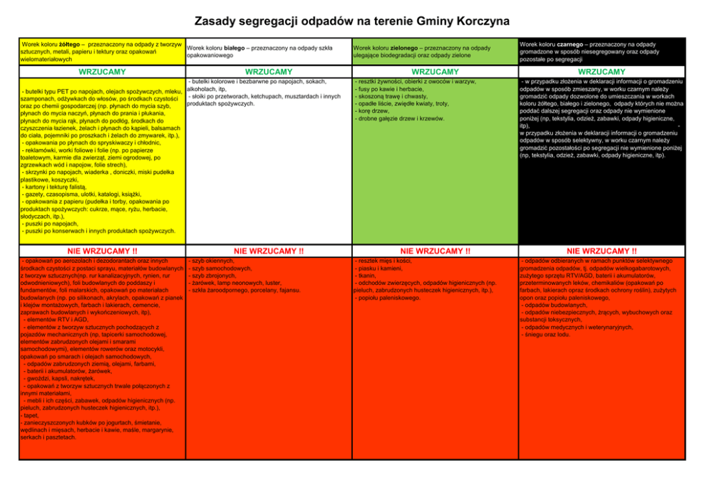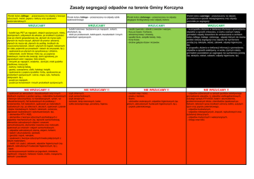 Zasady segregacji odpadów na terenie Gminy Korczyna Worek koloru żółtego – przeznaczony na odpady z tworzyw Worek koloru białego – przeznaczony na odpady szkła sztucznych, metali, papieru i tektury oraz opakowań opakowaniowego wielomateriałowych WRZUCAMY WRZUCAMY - butelki kolorowe i bezbarwne po napojach, sokach, - butelki typu PET po napojach, olejach spożywczych, mleku, alkoholach, itp, - słoiki po przetworach, ketchupach, musztardach i innych szamponach, odżywkach do włosów, po środkach czystości produktach spożywczych. oraz po chemii gospodarczej (np. płynach do mycia szyb, płynach do mycia naczyń, płynach do prania i płukania, płynach do mycia rąk, płynach do podłóg, środkach do czyszczenia łazienek, żelach i płynach do kąpieli, balsamach do ciała, pojemniki po proszkach i żelach do zmywarek, itp.), - opakowania po płynach do spryskiwaczy i chłodnic, - reklamówki, worki foliowe i folie (np. po papierze toaletowym, karmie dla zwierząt, ziemi ogrodowej, po zgrzewkach wód i napojow, folie strech), - skrzynki po napojach, wiaderka , doniczki, miski pudełka plastikowe, koszyczki, - kartony i tekturę falistą, - gazety, czasopisma, ulotki, katalogi, książki, - opakowania z papieru (pudełka i torby, opakowania po produktach spożywczych: cukrze, mące, ryżu, herbacie, słodyczach, itp.), - puszki po napojach, - puszki po konserwach i innych produktach spożywczych. NIE WRZUCAMY !! - opakowań po aerozolach i dezodorantach oraz innych środkach czystości z postaci sprayu, materiałów budowlanych z tworzyw sztucznych(np. rur kanalizacyjnych, rynien, rur odwodnieniowych), foli budowlanych do poddaszy i fundamentów, foli malarskich, opakowań po materiałach budowlanych (np. po silikonach, akrylach, opakowań z pianek i klejów montażowych, farbach i lakierach, cemencie, zaprawach budowlanych i wykończeniowych, itp), - elementów RTV i AGD, - elementów z tworzyw sztucznych pochodzących z pojazdów mechanicznych (np, tapicerki samochodowej, elementów zabrudzonych olejami i smarami samochodowymi), elementów rowerów oraz motocykli, opakowań po smarach i olejach samochodowych, - odpadów zabrudzonych ziemią, olejami, farbami, - baterii i akumulatorów, żarówek, - gwoździ, kapsli, nakrętek, - opakowań z tworzyw sztucznych trwale połączonych z innymi materiałami, - mebli i ich części, zabawek, odpadów higienicznych (np. pieluch, zabrudzonych husteczek higienicznych, itp.), - tapet, - zanieczyszczonych kubków po jogurtach, śmietanie, wędlinach i mięsach, herbacie i kawie, maśle, margarynie, serkach i pasztetach. NIE WRZUCAMY !! - szyb okiennych, - szyb samochodowych, - szyb zbrojonych, - żarówek, lamp neonowych, luster, - szkła żaroodpornego, porcelany, fajansu. Worek koloru zielonego – przeznaczony na odpady ulegające biodegradacji oraz odpady zielone WRZUCAMY - resztki żywności, obierki z owoców i warzyw, - fusy po kawie i herbacie, - skoszoną trawę i chwasty, - opadłe liście, zwiędłe kwiaty, troty, - korę drzew, - drobne gałęzie drzew i krzewów. NIE WRZUCAMY !! - resztek mięs i kości, - piasku i kamieni, - tkanin, - odchodów zwierzęcych, odpadów higienicznych (np. pieluch, zabrudzonych husteczek higienicznych, itp.), - popiołu paleniskowego. Worek koloru czarnego – przeznaczony na odpady gromadzone w sposób niesegregowany oraz odpady pozostałe po segregacji WRZUCAMY - w przypadku złożenia w deklaracji informacji o gromadzeniu odpadów w sposób zmieszany, w worku czarnym należy gromadzić odpady dozwolone do umieszczania w workach koloru żółtego, białego i zielonego, odpady których nie można poddać dalszej segregacji oraz odpady nie wymienione poniżej (np, tekstylia, odzież, zabawki, odpady higieniczne, itp), w przypadku złożenia w deklaracji informacji o gromadzeniu odpadów w sposób selektywny, w worku czarnym należy gromadzić pozostałości po segregacji nie wymienione poniżej (np, tekstylia, odzież, zabawki, odpady higieniczne, itp). NIE WRZUCAMY !! - odpadów odbieranych w ramach punktów selektywnego gromadzenia odpadów, tj. odpadów wielkogabarotowych, zużytego sprzętu RTV/AGD, baterii i akumulatorów, przeterminowanych leków, chemikaliów (opakowań po farbach, lakierach opraz środkach ochrony roślin), zużytych opon oraz popiołu paleniskowego, - odpadów budowlanych, - odpadów niebezpiecznych, żrących, wybuchowych oraz substancji toksycznych, - odpadów medycznych i weterynaryjnych, - śniegu oraz lodu.