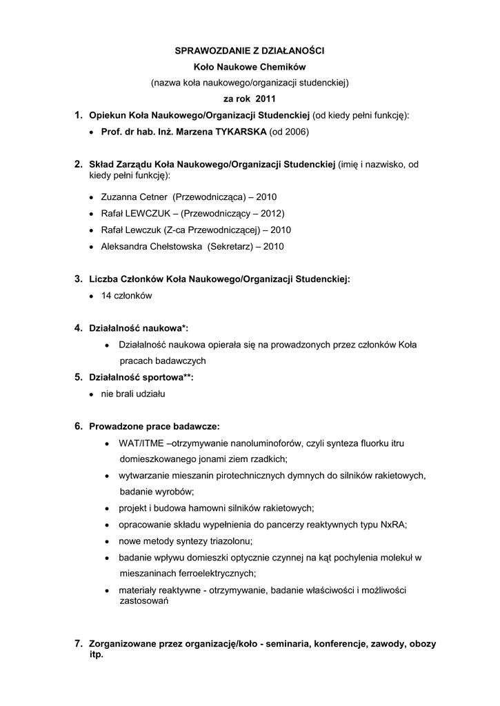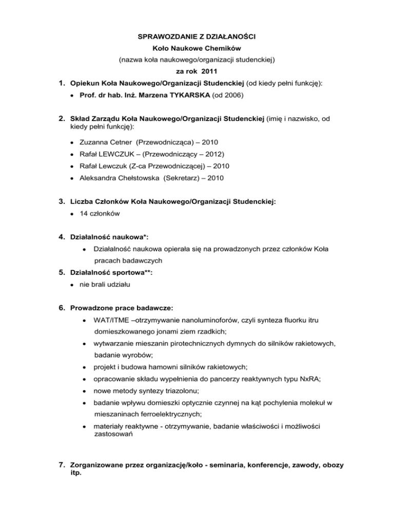 SPRAWOZDANIE Z DZIAŁANOŚCI Koło Naukowe Chemików (nazwa koła naukowego/organizacji studenckiej) za rok 2011 1. Opiekun Koła Naukowego/Organizacji Studenckiej (od kiedy pełni funkcję): Prof. dr hab. Inż. Marzena TYKARSKA (od 2006) 2. Skład Zarządu Koła Naukowego/Organizacji Studenckiej (imię i nazwisko, od kiedy pełni funkcję): Zuzanna Cetner (Przewodnicząca) – 2010 Rafał LEWCZUK – (Przewodniczący – 2012) Rafał Lewczuk (Z-ca Przewodniczącej) – 2010 Aleksandra Chełstowska (Sekretarz) – 2010 3. Liczba Członków Koła Naukowego/Organizacji Studenckiej: 14 członków 4. Działalność naukowa*: Działalność naukowa opierała się na prowadzonych przez członków Koła pracach badawczych 5. Działalność sportowa**: nie brali udziału 6. Prowadzone prace badawcze: WAT/ITME –otrzymywanie nanoluminoforów, czyli synteza fluorku itru domieszkowanego jonami ziem rzadkich; wytwarzanie mieszanin pirotechnicznych dymnych do silników rakietowych, badanie wyrobów; projekt i budowa hamowni silników rakietowych; opracowanie składu wypełnienia do pancerzy reaktywnych typu NxRA; nowe metody syntezy triazolonu; badanie wpływu domieszki optycznie czynnej na kąt pochylenia molekuł w mieszaninach ferroelektrycznych; materiały reaktywne - otrzymywanie, badanie właściwości i możliwości zastosowań 7. Zorganizowane przez organizację/koło - seminaria, konferencje, zawody, obozy itp. IV Międzyuczelniane Seminarium Studenckich Kół Naukowych, maj 2011, WAT 8. Publikacje: M. Szala, S. Cudziło, R. Lewczuk Optymalizacja syntezy NTO Biuletyn WAT 2/2011; J. Rećko Otrzymywanie niskotopliwych mieszanin wybuchowych na bazie DNAN, NTO, FOX i RDX; M. Tykarska, R. Dąbrowski, M. Czerwiński, A. Chełstowska, W. Piecek, P. Morawiak The influence of the chiral terphenylate on the tilt angle in pyrimidine ferroelectric mixtures; 9. Inne aspekty działalności koła naukowego/organizacji studenckiej***: organizacja Dni Otwartych w Wojskowej Akademii Technicznej; udział w seminariach: Justyna Fudyma – „Dobra praktyka miareczkowania. Dobra praktyka pipetowania”; Barbara Dawidziuk – „Dobra praktyka miareczkowania. Dobra praktyka pipetowania”; udział w konferencjach naukowych: Rafał Lewczuk – 54. Zjazd PTChem 18 – 22. 09. 2011 Lublin; Judyta Rećko – 54. Zjazd PTChem 18 – 22. 09. 2011 Lublin; Aleksandra Chełstowska – XIX Conference on Liquid Crystals. Chemistry, Physics and Applications 14 -18. 09. 2011 Międzyzdroje; udział w piknikach naukowych: Mateusz Synowiecki – XV Piknik Naukowy Polskiego Radia, Warszawa