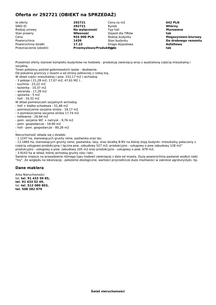 Oferta nr 292721 (OBIEKT na SPRZEDAŻ) Id oferty SWO ID Rodzaj umowy Stan prawny Cena Powierzchnia Powierzchnia działki Przeznaczenie (obiekt) 292721 Cena za m2 292721 Rynek Na wyłączność Typ hali Własność Dojazd dla TIRów 924 000 PLN Rodzaj budynku 1439 Stan budynku 17.22 Droga dojazdowa Przemysłowo/Produkcyjne Prąd 642 PLN Wtórny Murowana tak Magazynowo-biurowy Do drobnego remontu Asfaltowa tak Przedmiot oferty stanowi kompleks budynków na hodowlę - produkcję zwierzęcą wraz z wydzieloną częścią mieszkalną i socjalną. Teren położony pośród goleniowskich lasów - dosłownie. Od południa graniczy z lasami a od strony północnej z rzeką Iną. W skład części mieszkalnej ( pow. 152,17 m2 ) wchodzą: - 3 pokoje ( 21,28 m2; 17,07 m2; 47,61 M2 ) , - kuchnia - 23,22 m2 - łazienka - 10,37 m2 - weranda - 17,28 m2 - spiżarka - 5 m2 - holl - 10,32 m2 W skład pomieszczeń socjalnych wchodzą: - holl + klatka schodowa - 51,48 m2 - pomieszczenie socjalne stróża - 18.17 m2 - II pomieszczenie socjalne stróża 17,74 m2 - kotłownia - 20,94 m2 - pom. socjalne WC + natrysk - 9,76 m2 - pom. gospodarcze - 18,90 m2 - holl - pom. gospodarcze - 80,28 m2 Nieruchomość składa się z działek: - 1.1247 ha, stanowiących grunty rolne, pastwiska oraz las; - 12.1865 ha, stanowiących grunty rolne, pastwiska, lasy, oraz działkę B-RV na której stoją budynki: mieszkalny połaczony z częścią usługowo-produkcyjną ( łączna pow. zabudowy 527 m2; produkcyjno - usługowy o pow zabudowy 128 m2" produkcyjno - usługowy o pow. zabudowy 105 m2 oraz produkcyjno - usługowy o pow. 679 m2; - 3.9143 ha w skład, której wchodzą grunty rola i łaki; Świetne miejsce na prowadzenie różnego typu hodowli zwierzęcej z dala od miasta. Duża powierzchnia pastwisk wzdłuż rzeki "Iny". Ze względu na lokalizację - położenie ekologiczne, wartości przyrodnicze duże możliwości w zakresie agroturystyki, itp. Dane maklera Arka Nieruchomości tel. tel. 91 433 59 85, tel. 91 433 52 49, tel. tel. 512 080 803, tel. 508 382 979 Świat nieruchomości Powered by TCPDF (www.tcpdf.org)