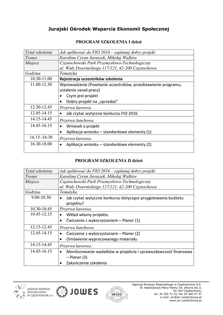 Jurajski Ośrodek Wsparcia Ekonomii Społecznej PROGRAM SZKOLENIA I dzień Tytuł szkolenia Trener Miejsce Godzina 10.30-11.00 11.00-12.30 12.30-12.45 12.45-14.15 14.15-14.45 14.45-16.15 16.15–16:30 16.30-18.00 Jak aplikować do FIO 2016 – zaplanuj dobry projekt Karolina Cyran Juraszek, Mikołaj Walków Częstochowski Park Przemysłowo-Technologiczny ul. Wały Dwernickiego 117/121, 42-200 Częstochowa Tematyka Rejestracja uczestników szkolenia Wprowadzenie (Powitanie uczestników, przedstawienie programu, ustalenie zasad pracy) Czym jest projekt Dobry projekt na „sprzedaż” Przerwa kawowa. Jak czytać wytyczne konkursu FIO 2016 Przerwa lunchowa. Wniosek a projekt Aplikacja wniosku – standardowe elementy (1) Przerwa kawowa. Aplikacja wniosku – standardowe elementy (2) PROGRAM SZKOLENIA II dzień Tytuł szkolenia Trener Miejsce Godzina 9.00-10.30 10.30-10.45 10.45-12.15 Jak aplikować do FIO 2016 – zaplanuj dobry projekt Karolina Cyran Juraszek, Mikołaj Walków Częstochowski Park Przemysłowo-Technologiczny ul. Wały Dwernickiego 117/121, 42-200 Częstochowa Tematyka Jak czytać wytyczne konkursu dotyczące przygotowania budżetu projektu? Przerwa kawowa. Wkład własny projektu Ćwiczenie z wykorzystaniem – Planer (1) 12.15-12.45 12.45-14.15 Przerwa lunchowa. Ćwiczenie z wykorzystaniem – Planer (2) Omówienie wypracowanego materiału 14.15-14.45 14.45-16.15 Przerwa kawowa. Monitorowanie wydatków w projekcie i sprawozdawczość finansowa – Planer (3) Zakończenie szkolenia Agencja Rozwoju Regionalnego w Częstochowie S.A. Al. Najświętszej Maryi Panny 24, oficyna lok.3, 42-202 Częstochowa, tel. 34 325 71 42, fax 34 360 57 47 e-mail: [email protected] www.arr.czestochowa.pl