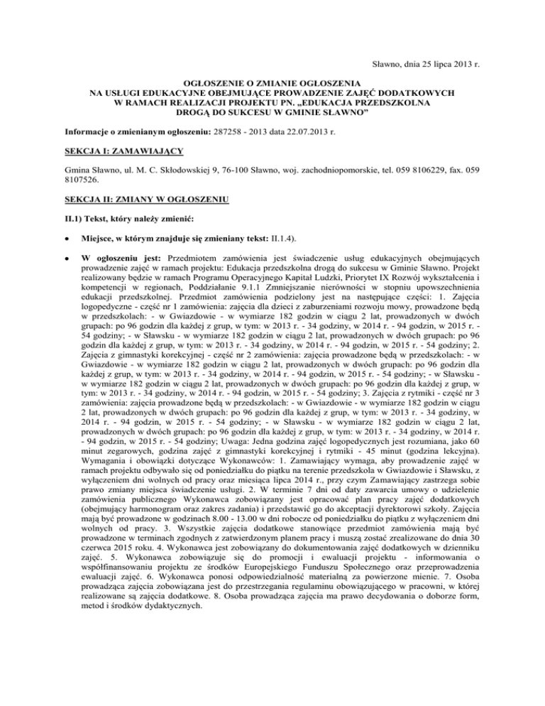Sławno, dnia 25 lipca 2013 r. OGŁOSZENIE O ZMIANIE OGŁOSZENIA NA USŁUGI EDUKACYJNE OBEJMUJĄCE PROWADZENIE ZAJĘĆ DODATKOWYCH W RAMACH REALIZACJI PROJEKTU PN. „EDUKACJA PRZEDSZKOLNA DROGĄ DO SUKCESU W GMINIE SŁAWNO” Informacje o zmienianym ogłoszeniu: 287258 - 2013 data 22.07.2013 r. SEKCJA I: ZAMAWIAJĄCY Gmina Sławno, ul. M. C. Skłodowskiej 9, 76-100 Sławno, woj. zachodniopomorskie, tel. 059 8106229, fax. 059 8107526. SEKCJA II: ZMIANY W OGŁOSZENIU II.1) Tekst, który należy zmienić: Miejsce, w którym znajduje się zmieniany tekst: II.1.4). W ogłoszeniu jest: Przedmiotem zamówienia jest świadczenie usług edukacyjnych obejmujących prowadzenie zajęć w ramach projektu: Edukacja przedszkolna drogą do sukcesu w Gminie Sławno. Projekt realizowany będzie w ramach Programu Operacyjnego Kapitał Ludzki, Priorytet IX Rozwój wykształcenia i kompetencji w regionach, Poddziałanie 9.1.1 Zmniejszanie nierówności w stopniu upowszechnienia edukacji przedszkolnej. Przedmiot zamówienia podzielony jest na następujące części: 1. Zajęcia logopedyczne - część nr 1 zamówienia: zajęcia dla dzieci z zaburzeniami rozwoju mowy, prowadzone będą w przedszkolach: - w Gwiazdowie - w wymiarze 182 godzin w ciągu 2 lat, prowadzonych w dwóch grupach: po 96 godzin dla każdej z grup, w tym: w 2013 r. - 34 godziny, w 2014 r. - 94 godzin, w 2015 r. 54 godziny; - w Sławsku - w wymiarze 182 godzin w ciągu 2 lat, prowadzonych w dwóch grupach: po 96 godzin dla każdej z grup, w tym: w 2013 r. - 34 godziny, w 2014 r. - 94 godzin, w 2015 r. - 54 godziny; 2. Zajęcia z gimnastyki korekcyjnej - część nr 2 zamówienia: zajęcia prowadzone będą w przedszkolach: - w Gwiazdowie - w wymiarze 182 godzin w ciągu 2 lat, prowadzonych w dwóch grupach: po 96 godzin dla każdej z grup, w tym: w 2013 r. - 34 godziny, w 2014 r. - 94 godzin, w 2015 r. - 54 godziny; - w Sławsku w wymiarze 182 godzin w ciągu 2 lat, prowadzonych w dwóch grupach: po 96 godzin dla każdej z grup, w tym: w 2013 r. - 34 godziny, w 2014 r. - 94 godzin, w 2015 r. - 54 godziny; 3. Zajęcia z rytmiki - część nr 3 zamówienia: zajęcia prowadzone będą w przedszkolach: - w Gwiazdowie - w wymiarze 182 godzin w ciągu 2 lat, prowadzonych w dwóch grupach: po 96 godzin dla każdej z grup, w tym: w 2013 r. - 34 godziny, w 2014 r. - 94 godzin, w 2015 r. - 54 godziny; - w Sławsku - w wymiarze 182 godzin w ciągu 2 lat, prowadzonych w dwóch grupach: po 96 godzin dla każdej z grup, w tym: w 2013 r. - 34 godziny, w 2014 r. - 94 godzin, w 2015 r. - 54 godziny; Uwaga: Jedna godzina zajęć logopedycznych jest rozumiana, jako 60 minut zegarowych, godzina zajęć z gimnastyki korekcyjnej i rytmiki - 45 minut (godzina lekcyjna). Wymagania i obowiązki dotyczące Wykonawców: 1. Zamawiający wymaga, aby prowadzenie zajęć w ramach projektu odbywało się od poniedziałku do piątku na terenie przedszkola w Gwiazdowie i Sławsku, z wyłączeniem dni wolnych od pracy oraz miesiąca lipca 2014 r., przy czym Zamawiający zastrzega sobie prawo zmiany miejsca świadczenie usługi. 2. W terminie 7 dni od daty zawarcia umowy o udzielenie zamówienia publicznego Wykonawca zobowiązany jest opracować plan pracy zajęć dodatkowych (obejmujący harmonogram oraz zakres zadania) i przedstawić go do akceptacji dyrektorowi szkoły. Zajęcia mają być prowadzone w godzinach 8.00 - 13.00 w dni robocze od poniedziałku do piątku z wyłączeniem dni wolnych od pracy. 3. Wszystkie zajęcia dodatkowe stanowiące przedmiot zamówienia mają być prowadzone w terminach zgodnych z zatwierdzonym planem pracy i muszą zostać zrealizowane do dnia 30 czerwca 2015 roku. 4. Wykonawca jest zobowiązany do dokumentowania zajęć dodatkowych w dzienniku zajęć. 5. Wykonawca zobowiązuje się do promocji i ewaluacji projektu - informowania o współfinansowaniu projektu ze środków Europejskiego Funduszu Społecznego oraz przeprowadzenia ewaluacji zajęć. 6. Wykonawca ponosi odpowiedzialność materialną za powierzone mienie. 7. Osoba prowadząca zajęcia zobowiązana jest do przestrzegania regulaminu obowiązującego w pracowni, w której realizowane są zajęcia dodatkowe. 8. Osoba prowadząca zajęcia ma prawo decydowania o doborze form, metod i środków dydaktycznych. W ogłoszeniu powinno być: Przedmiotem zamówienia jest świadczenie usług edukacyjnych obejmujących prowadzenie zajęć w ramach projektu: Edukacja przedszkolna drogą do sukcesu w Gminie Sławno. Projekt realizowany będzie w ramach Programu Operacyjnego Kapitał Ludzki, Priorytet IX Rozwój wykształcenia i kompetencji w regionach, Poddziałanie 9.1.1 Zmniejszanie nierówności w stopniu upowszechnienia edukacji przedszkolnej. Przedmiot zamówienia podzielony jest na następujące części: 1. Zajęcia logopedyczne - część nr 1 zamówienia: zajęcia dla dzieci z zaburzeniami rozwoju mowy, prowadzone będą w przedszkolach: - w Gwiazdowie - w wymiarze 182 godzin w ciągu 2 lat, prowadzonych w dwóch grupach: po 91 godzin dla każdej z grup, w tym: w 2013 r. - 34 godziny, w 2014 r. - 94 godzin, w 2015 r. 54 godziny. Zajęcia odbywać się będą w wymiarze 2 godzin w tygodniu; - w Sławsku - w wymiarze 182 godzin w ciągu 2 lat, prowadzonych w dwóch grupach: po 91 godzin dla każdej z grup, w tym: w 2013 r. 34 godziny, w 2014 r. - 94 godzin, w 2015 r. - 54 godziny. Zajęcia odbywać się będą w wymiarze 2 godzin w tygodniu. 2. Zajęcia z gimnastyki korekcyjnej - część nr 2 zamówienia: zajęcia prowadzone będą w przedszkolach: - w Gwiazdowie - w wymiarze 182 godzin w ciągu 2 lat, prowadzonych w dwóch grupach: po 91 godzin dla każdej z grup, w tym: w 2013 r. - 34 godziny, w 2014 r. - 94 godzin, w 2015 r. - 54 godziny. Zajęcia odbywać się będą w wymiarze 2 godzin w tygodniu; - w Sławsku - w wymiarze 182 godzin w ciągu 2 lat, prowadzonych w dwóch grupach: po 91 godzin dla każdej z grup, w tym: w 2013 r. 34 godziny, w 2014 r. - 94 godzin, w 2015 r. - 54 