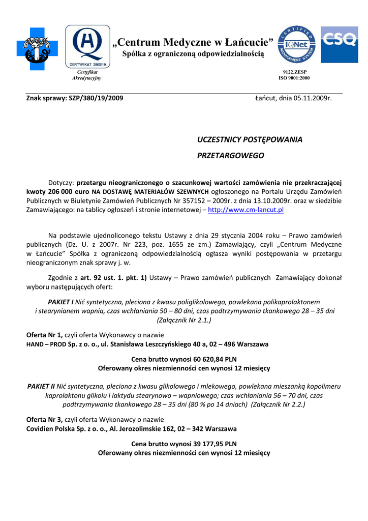 „Centrum Medyczne w Łańcucie”” Spółka z ograniczoną odpowiedzialnością Certyfikat Akredytacyjny 9122.ZESP ISO 9001:2000 Znak sprawy: SZP/380/19/2009 Łańcut, dnia 05.11.2009r. UCZESTNICY POSTĘPOWANIA PRZETARGOWEGO Dotyczy: przetargu nieograniczonego o szacunkowej wartości zamówienia nie przekraczającej kwoty 206 000 euro NA DOSTAWĘ MATERIAŁÓW SZEWNYCH ogłoszonego na Portalu Urzędu Zamówień Publicznych w Biuletynie Zamówień Publicznych Nr 357152 – 2009r. z dnia 13.10.2009r. oraz w siedzibie Zamawiającego: na tablicy ogłoszeń i stronie internetowej – http://www.cm-lancut.pl Na podstawie ujednoliconego tekstu Ustawy z dnia 29 stycznia 2004 roku – Prawo zamówień publicznych (Dz. U. z 2007r. Nr 223, poz. 1655 ze zm.) Zamawiający, czyli „Centrum Medyczne w Łańcucie” Spółka z ograniczoną odpowiedzialnością ogłasza wyniki postępowania w przetargu nieograniczonym znak sprawy j. w. Zgodnie z art. 92 ust. 1. pkt. 1) Ustawy – Prawo zamówień publicznych Zamawiający dokonał wyboru następujących ofert: PAKIET I Nić syntetyczna, pleciona z kwasu poliglikolowego, powlekana polikaprolaktonem i stearynianem wapnia, czas wchłaniania 50 – 80 dni, czas podtrzymywania tkankowego 28 – 35 dni (Załącznik Nr 2.1.) Oferta Nr 1, czyli oferta Wykonawcy o nazwie HAND – PROD Sp. z o. o., ul. Stanisława Leszczyńskiego 40 a, 02 – 496 Warszawa Cena brutto wynosi 60 620,84 PLN Oferowany okres niezmienności cen wynosi 12 miesięcy PAKIET II Nić syntetyczna, pleciona z kwasu glikolowego i mlekowego, powlekana mieszanką kopolimeru kaprolaktonu glikolu i laktydu stearynowo – wapniowego; czas wchłaniania 56 – 70 dni, czas podtrzymywania tkankowego 28 – 35 dni (80 % po 14 dniach) (Załącznik Nr 2.2.) Oferta Nr 3, czyli oferta Wykonawcy o nazwie Covidien Polska Sp. z o. o., Al. Jerozolimskie 162, 02 – 342 Warszawa Cena brutto wynosi 39 177,95 PLN Oferowany okres niezmienności cen wynosi 12 miesięcy PAKIET III Nić naturalna lub syntetyczna z igłą pleciona niewchłanialna (Załącznik Nr 2.3.) Oferta Nr 5, czyli oferta Wykonawcy o nazwie Górnośląska Centrala Zaopatrzenia Medycznego „ZARYS” Sp. z o. o., ul. Pod Borem 18, 41 – 808 Zabrze Cena brutto wynosi 3 305,00 PLN Oferowany okres niezmienności cen wynosi 12 miesięcy PAKIET IV Monofilament syntetyczny wykonany z poliglikonatu z okresem wchłaniania 160 – 180 dni, podtrzymywanie tkankowe 42 dni (Załącznik Nr 2.4.) Oferta Nr 3, czyli oferta Wykonawcy o nazwie Covidien Polska Sp. z o. o., Al. Jerozolimskie 162, 02 – 342 Warszawa Cena brutto wynosi 31 932,30 PLN Oferowany okres niezmienności cen wynosi 12 miesięcy PAKIET V Nić syntetyczna, wchłanialna, jednowłókowa wykonana z glikolidu, kaprolaktonu, węglanu trimetylenu i laktydu z okresem wchłaniania do 56 dni, podtrzymywania tkankowego min. 20 % w 10 dniu (Załącznik Nr 2.5.) Oferta Nr 3, czyli oferta Wykonawcy o nazwie Covidien Polska Sp. z o. o., Al. Jerozolimskie 162, 02 – 342 Warszawa Cena brutto wynosi 48 673,11 PLN Oferowany okres niezmienności cen wynosi 12 miesięcy PAKIET VI Nić syntetyczna, powlekana, wchłanialna, pleciona z maksymalnym okresem wchłaniania 42 dni (Załącznik Nr 2.6.) Oferta Nr 2, czyli oferta Wykonawcy o nazwie Przedsiębiorstwo YAVO Sp. z o. o., ul. Bawełniana 17, 97 – 400 Bełchatów Cena brutto wynosi 8 551,44 PLN Oferowany okres niezmienności cen wynosi 12 miesięcy PAKIET VII Nić naturalna lub syntetyczna bez igły, pleciona, niewchłanialna (Załącznik Nr 2.7.) Oferta Nr 2, czyli oferta Wykonawcy o nazwie Przedsiębiorstwo YAVO Sp. z o. o., ul. Bawełniana 17, 97 – 400 Bełchatów Cena brutto wynosi 2 015,37 PLN Oferowany okres niezmienności cen wynosi 12 miesięcy PAKIET VIII Nić syntetyczna jednowłókowa niewchłanialna (Załącznik Nr 2.8.) Oferta Nr 1, czyli oferta Wykonawcy o nazwie HAND – PROD Sp. z o. o., ul. Stanisława Leszczyńskiego 40 a, 02 – 496 Warszawa Cena brutto wynosi 11 521,21 PLN Oferowany okres niezmienności cen wynosi 12 miesięcy PAKIET IX Szwy odbarczające, śródszpikowe, taśma do szycia narządów miąższowych (Załącznik Nr 2.9.) Oferta Nr 6, czyli oferta Wykonawcy o nazwie Aesculap Chifa Spółka z ograniczoną odpowiedzialnością, ul. Tysiąclecia 14, 64 – 300 Nowy Tomyśl Cena brutto wynosi 2 442,48 PLN Oferowany okres niezmienności cen wynosi 12 miesięcy Uzasadnienie: w/w oferty są zgodne z Ustawą – Prawo zamówień publicznych, spełniają wymogi zawarte w Specyfikacji Istotnych Warunków Zamówienia i uzyskały maksymalne liczby punktów w poszczególnym pakiecie w oparciu o ustalone kryteria zawarte w SIWZ. Działając na podstawie art. 92 ust. 1. pkt. 3) Ustawy – Prawo zamówień publicznych informuję, że w postępowaniu tym nie wykluczono żadnego Wykonawcy. Zgodnie art. 92 ust. 1. pkt. 2) ujednoliconego tekstu Ustawy z dnia 29 stycznia 2004 roku – – Prawo zamówień publicznych (Dz. U. z 2007r. Nr 223, poz. 1655 ze zm.) informuję, że w prowadzonym postępowaniu przetargowym w Pakiecie IV „Monofilament syntetyczny wykonany z poliglikonatu z okresem wchłaniania 160 – 180 dni, podtrzymywanie tkankowe 42 dni” odrzucono ofertę Nr 1, tj. ofertę Wykonawcy o nazwie HAND – PROD Sp. z o. o., ul. Stanisława Leszczyńskiego 40 a, 02 – 496 Warszawa na podstawie art. 89 ust. 1. Pkt. 2), ponieważ treść złożonej oferty nie odpowiada treści Specyfikacji Istotnych Warunków Zamówienia. UZASADNIENIE: W pakiecie IV należało zaoferować materiał szewny syntetyczny z okresem wchłaniania od 160 do 180 dni. Z zapisów specyfikacji wynikało, że Zamawiający wymagał zaoferowania nici, których okres wchłaniania nie przekroczyłby maksymalnie 180 dni. Podczas badania i oceny ofert komisja przetargowa powołana zarządzeniem wewnętrznym Nr 24/2009 z dnia 01.10.2009r. stwierdziła, że w swojej ofercie Wykonawca zaoferował nić chirurgiczną o nazwie „Monotine”, której producentem jest firma Pet