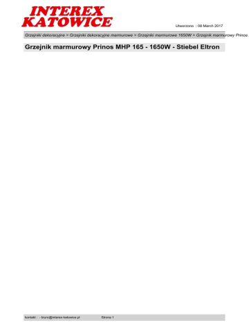 Utworzono : 08 March 2017 Grzejniki dekoracyjne > Grzejniki dekoracyjne marmurowe > Grzejniki marmurowe 1650W > Grzejnik marmurowy Prinos M Grzejnik marmurowy Prinos MHP 165 - 1650W - Stiebel Eltron kontakt : - [email protected] Strona 1 Utworzono : 08 March 2017 Grzejniki dekoracyjne > Grzejniki dekoracyjne marmurowe > Grzejniki marmurowe 1650W > Grzejnik marmurowy Prinos M Grzejnik marmurowy Prinos MHP 165 - 1650W - Stiebel Eltron Model : 233665 Grzejnik marmurowy Prinos MHP 165 - 1650W - Stiebel Eltron Producent : Stiebel Eltron Grzejnik kamienny wyprodukowano z naturalnych, wysokogatunkowych odmian marmuru. W płytę marmurową o grubości 30 mm fabrycznie wprowadzany jest element grzejny, który umożliwia równomiernie nagrzewanie płyty.�Ciepło gromadzone w płycie marmurowej oddawane poprzez promieniowanie oraz konwekcję. Tylna płaszczyzna grzejnika jest skutecznie izolowana, także 100% ciepła oddawane jest do pomieszczenia. Sposoby i możliwości sterowania temperaturą / grzejnikami marmurowymi znajdą Państwo - tutaj. W przypadku dodatkowych pytań technicznych proszę dzwonić tel 602551555. Grzejniki marmurowe spełniają funkcję podstawowego systemu grzejnego domu, mieszkania, biura, gabinetu lub dodatkowego źródła ciepła. Do zamocowania grzejnika przygotowano fabryczne uchwyty ścienne, a punkty mocowania nie są widoczne od frontu grzejnika, mamy piękną płytę marmurową. Uchwyty ścienne można ustawić w taki sposób, że grzejnik może być instalowany zarówno poziomo jak i pionowo.� Główne cechy: � Redukcja kosztów eksploatacji o 15-30% w stosunku�do ogrzewania konwekcyjnego � Efekt promieniowania i konwekcji zapewnia równą temperatur�w całym pomieszczeniu � Możliwość instalacji w pionie jak i w poziomie � Dwa automatyczne bezpieczniki termiczne�zabezpieczające przed przegrzaniem � II klasa bezpieczeństwa, IP 25 Dane techniczne: Moc grzewcza: 1,65kW Wysokość: 600mm Szerokość: 1350mm Głębokość marmuru: 35mm [całkowita głębokość od ściany do frontu marmuru z dystansem mocującym = 70mm Kamień: marmur dolomitowy Napięcie zasilania: 1/N ~230V Waga: 70kg Klasa bezpieczeństwa: II Stopień ochrona: IP25 Instrukcja montażu grzejników marmurowych Stiebel Eltron Karta katalogowa grzejników marmurowych Stiebel Eltron Grzejnik marmurowy Stiebel Eltron w podczerwieni od frontu. kontakt : - [email protected] Strona 2 Utworzono : 08 March 2017 Grzejniki dekoracyjne > Grzejniki dekoracyjne marmurowe > Grzejniki marmurowe 1650W > Grzejnik marmurowy Prinos M Grzejnik marmurowy Prinos MHP 165 - 1650W - Stiebel Eltron kontakt : - [email protected] Strona 3 Utworzono : 08 March 2017 Grzejniki dekoracyjne > Grzejniki dekoracyjne marmurowe > Grzejniki marmurowe 1650W > Grzejnik marmurowy Prinos M Grzejnik marmurowy Prinos MHP 165 - 1650W - Stiebel Eltron Poniżej przedstawiam możliwości sterowania grzejnikami marmurowymi. Opcja dodatkowa, oprócz poniższych to moduł wykonawczy EKONOMICZNY / KOMFORTOWY instalowany za grzejnikiem [ niewidoczny ]. Cena : 3.936,00 zł Brutto ( 3.200,00 zł Netto) Cena promocyjna : 2.833,92 zł Brutto ( 2.304,00 zł Netto) Dostępność: Produkt dostępny w naszym sklepie od 07 March 2012 kontakt : - [email protected] Strona 4