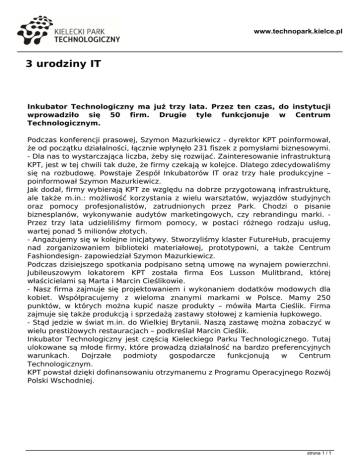 www.technopark.kielce.pl 3 urodziny IT Inkubator Technologiczny ma już trzy lata. Przez ten czas, do instytucji wprowadziło się 50 firm. Drugie tyle funkcjonuje w Centrum Technologicznym. Podczas konferencji prasowej, Szymon Mazurkiewicz - dyrektor KPT poinformował, że od początku działalności, łącznie wpłynęło 231 fiszek z pomysłami biznesowymi. - Dla nas to wystarczająca liczba, żeby się rozwijać. Zainteresowanie infrastrukturą KPT, jest w tej chwili tak duże, że firmy czekają w kolejce. Dlatego zdecydowaliśmy się na rozbudowę. Powstaje Zespół Inkubatorów IT oraz trzy hale produkcyjne – poinformował Szymon Mazurkiewicz. Jak dodał, firmy wybierają KPT ze względu na dobrze przygotowaną infrastrukturę, ale także m.in.: możliwość korzystania z wielu warsztatów, wyjazdów studyjnych oraz pomocy profesjonalistów, zatrudnionych przez Park. Chodzi o pisanie biznesplanów, wykonywanie audytów marketingowych, czy rebrandingu marki. Przez trzy lata udzieliliśmy firmom pomocy, w postaci różnego rodzaju usług, wartej ponad 5 milionów złotych. - Angażujemy się w kolejne inicjatywy. Stworzyliśmy klaster FutureHub, pracujemy nad zorganizowaniem biblioteki materiałowej, prototypowni, a także Centrum Fashiondesign- zapowiedział Szymon Mazurkiewicz. Podczas dzisiejszego spotkania podpisano setną umowę na wynajem powierzchni. Jubileuszowym lokatorem KPT została firma Eos Lusson Mulitbrand, której właścicielami są Marta i Marcin Cieślikowie. - Nasz firma zajmuje się projektowaniem i wykonaniem dodatków modowych dla kobiet. Współpracujemy z wieloma znanymi markami w Polsce. Mamy 250 punktów, w których można kupić nasze produkty – mówiła Marta Cieślik. Firma zajmuje się także produkcją i sprzedażą zastawy stołowej z kamienia łupkowego. - Stąd jedzie w świat m.in. do Wielkiej Brytanii. Naszą zastawę można zobaczyć w wielu prestiżowych restauracjach – podkreślał Marcin Cieślik. Inkubator Technologiczny jest częścią Kieleckiego Parku Technologicznego. Tutaj ulokowane są młode firmy, które prowadzą działalność na bardzo preferencyjnych warunkach. Dojrzałe podmioty gospodarcze funkcjonują w Centrum Technologicznym. KPT powstał dzięki dofinansowaniu otrzymanemu z Programu Operacyjnego Rozwój Polski Wschodniej. strona 1 / 1 Powered by TCPDF (www.tcpdf.org)