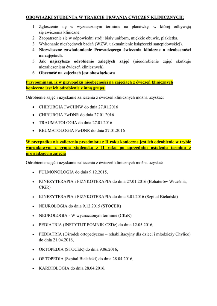 OBOWIĄZKI STUDENTA W TRAKCIE TRWANIA ĆWICZEŃ KLINICZNYCH: 1. Zgłoszenie się w wyznaczonym terminie na placówkę, w której odbywają się ćwiczenia kliniczne. 2. Zaopatrzenie się w odpowiedni strój: biały uniform, miękkie obuwie, plakietka. 3. Wykonanie niezbędnych badań (WZW, uaktualnienie książeczki sanepidowskiej). 4. Niezwłoczne zawiadomienie Prowadzącego ćwiczenia kliniczne o nieobecności na zajęciach. 5. Jak najszybsze odrobienie zaległych zajęć (nieodrobienie zajęć skutkuje niezaliczeniem ćwiczeń klinicznych). 6. Obecność na zajęciach jest obowiązkowa Przypominam, iż w przypadku nieobecności na zajęciach z ćwiczeń klinicznych konieczne jest ich odrobienie z inną grupą. Odrobienie zajęć i uzyskanie zaliczenia z ćwiczeń klinicznych można uzyskać: CHIRURGIA FwCHNW do dnia 27.01.2016 CHIRURGIA FwDNR do dnia 27.01.2016 TRAUMATOLOGIA do dnia 27.01.2016 REUMATOLOGIA FwDNR do dnia 27.01.2016 W przypadku nie zaliczenia przedmiotu z II roku konieczne jest ich odrobienie w trybie warunkowym z grupą studencką z II roku po uprzednim ustaleniu terminu z prowadzącym zajęcia Odrobienie zajęć i uzyskanie zaliczenia z ćwiczeń klinicznych można uzyskać PULMONOLOGIA do dnia 9.12.2015, KINEZYTERAPIA i FIZYKOTERAPIA do dnia 27.01.2016 (Bohaterów Września, CKiR) KINEZYTERAPIA i FIZYKOTERAPIA do dnia 3.01.2016 (Szpital Bielański) NEUROLOGIA do dnia 9.12.2015 (STOCER) NEUROLOGIA - W wyznaczonym terminie (CKiR) PEDIATRIA (INSTYTUT POMNIK CZDz) do dnia 12.05.2016, PEDIATRIA (Ośrodek ortopedyczno – rehabilitacyjny dla dzieci i młodzieży Chylice) do dnia 21.04.2016, ORTOPEDIA (STOCER) do dnia 9.06.2016, ORTOPEDIA (Szpital Bielański) do dnia 28.04.2016, KARDIOLOGIA do dnia 28.04.2016. Nie uzyskanie oceny pozytywnej z ćwiczeń klinicznych w tym terminie skutkuje niezaliczeniem tego przedmiotu i w konsekwencji niemożnością podejścia do obrony pracy licencjackiej.