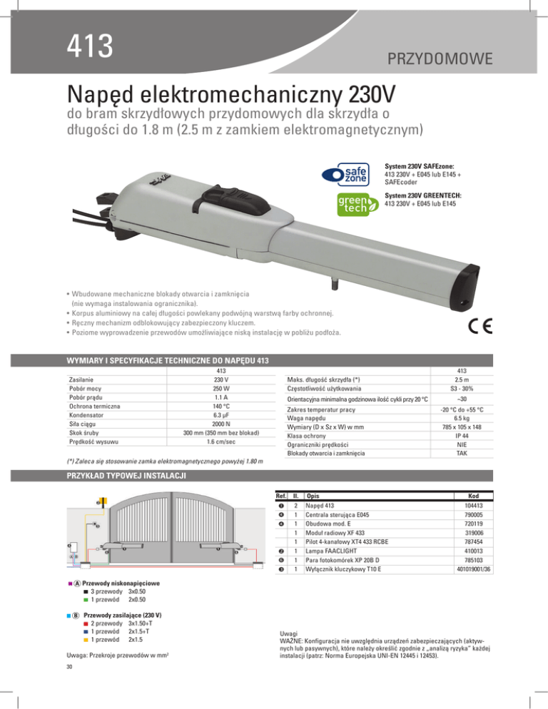 413 PRZYDOMOWE Napęd elektromechaniczny 230V do bram skrzydłowych przydomowych dla skrzydła o długości do 1.8 m (2.5 m z zamkiem elektromagnetycznym) System 230V SAFEzone: 413 230V + E045 lub E145 + SAFEcoder System 230V GREENTECH: 413 230V + E045 lub E145 • Wbudowane mechaniczne blokady otwarcia i zamknięcia (nie wymaga instalowania ogranicznika). • Korpus aluminiowy na całej długości powlekany podwójną warstwą farby ochronnej. • Ręczny mechanizm odblokowujący zabezpieczony kluczem. • Poziome wyprowadzenie przewodów umożliwiające niską instalację w pobliżu podłoża. WYMIARY I SPECYFIKACJE TECHNICZNE DO NAPĘDU 413 Zasilanie Pobór mocy Pobór prądu Ochrona termiczna Kondensator Siła ciągu Skok śruby Prędkość wysuwu 413 230 V 250 W 1.1 A 140 °C 6.3 µF 2000 N 300 mm (350 mm bez blokad) 1.6 cm/sec Maks. długość skrzydła (*) Częstotliwość użytkowania Orientacyjna minimalna godzinowa ilość cykli przy 20 °C Zakres temperatur pracy Waga napędu Wymiary (D x Sz x W) w mm Klasa ochrony Ograniczniki prędkości Blokady otwarcia i zamknięcia 413 2.5 m S3 - 30% ~30 -20 °C do +55 °C 6.5 kg 785 x 105 x 148 IP 44 NIE TAK (*) Zaleca się stosowanie zamka elektromagnetycznego powyżej 1.80 m PRZYKŁAD TYPOWEJ INSTALACJI Ref. Il. Opis 2 1 1 1 1 1 1 1 Napęd 413 Centrala sterująca E045 Obudowa mod. E Moduł radiowy XF 433 Pilot 4-kanałowy XT4 433 RCBE Lampa FAACLIGHT Para fotokomórek XP 20B D Wyłącznik kluczykowy T10 E Przewody niskonapięciowe 3 przewody 3x0.50 1 przewód 2x0.50 Przewody zasilające (230 V) 2 przewody 3x1.50+T 1 przewód 2x1.5+T 1 przewód 2x1.5 Uwaga: Przekroje przewodów w mm2 30 Kod 104413 790005 720119 319006 787454 410013 785103 401019001/36 Uwagi WAŻNE: Konfiguracja nie uwzględnia urządzeń zabezpieczających (aktywnych lub pasywnych), które należy określić zgodnie z „analizą ryzyka” każdej instalacji (patrz: Norma Europejska UNI-EN 12445 i 12453). 413 Model Maks. długość skrzydła (m) Częstotliwość użytkowania (cykli/godzinę) 30 Centrala sterująca Kod 413 - 230V 1,80 (2,5 z zamkiem) 104413 Nie zawiera Pakiet zawiera: jeden napęd elektromechaniczny, akcesoria montażowe, klucz odblokowujący, kondensator 6.3 µF 400V. Gotowy zestaw 413 - do bram dwuskrzydłowych o dł. do 5 m (455D) Ilość 2 1 1 1 2 1 Opis wyposażenia Kod Napędy 413 z elementami mocującymi 104413 Centrala sterująca 455 D 790917 Obudowa do centrali sterującej - model E 720119 Odbiornik radiowy RP2 SLH 868 Mhz, 2-kanałowy 787742 Pilot 2-kanałowy XT2 868 SLH LR (cz./b.) 7870091/787009 Fotokomórka XP 20 D o zasięgu 20 m 785102 Cena netto (zł) 2 989,00 ZAUTOMATYZOWANE SYSTEMY DO BRAM SKRZYDŁOWYCH Zastosowanie Cena netto (zł) 1 133,00 Przykładowy zestaw 413 - do bram dwuskrzydłowych o dł. do 5 m (E 045) Cena Ilość Opis wyposażenia Kod netto (zł) 2 Napędy 413 z elementami mocującymi 104413 1 Centrala sterująca E 045 790005 1 Obudowa do centrali sterującej - model E 720119 2 989,00 1 Moduł radiowy XF 868 MHz 319007 2 Pilot 2-kanałowy XT2 868 SLH LR (cz./b.) 7870091/787009 1 Fotokomórka XP 20B D 785103 CENTRALE STERUJĄCE Centrala sterująca E045 Specyfikacje techniczne str. 125 Centrala sterująca E145 Specyfikacja techniczna str. 126 Interfejs BUS XIB Kod790005 Cena netto (zł) 572,00 Kod Cena netto (zł) Kod Cena netto (zł) 790006 795,00 Obudowa mod. E do centrali sterującej 790062 29,00 Kod720119 Cena netto (zł) 74,00 AKCESORIA Wspornik do montażu naściennego XK 21 L 24 V Wyłącznik kluczykowy z zabezpieczeniem antywłamaniowym z blokadą SAFECODER do siłownika (Patent FAAC) Kod Cena netto (zł) Kod Cena netto (zł) Kod404040 Cena netto (zł) 218,00 737604 53,00 401301 445,00 POZOSTAŁE AKCESORIA Wyłączniki str. 144 Fotokomórki str. 148 Listwy zabezpieczające str. 150 Lampy str. 152 Piloty str. 140 Inne str. 153 31