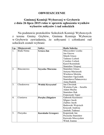 OBWIESZCZENIE Gminnej Komisji Wyborczej w Grybowie z dnia 26 lipca 2015 roku w sprawie ogłoszenia wyników wyborów sołtysów i rad sołeckich Na podstawie protokołów Sołeckich Komisji Wyborczych z terenu Gminy Grybów, Gminna Komisja Wyborcza w Grybowie zawiadamia, że sołtysami i członkami rad sołeckich zostali wybrani: Lp. Miejscowość 1. Biała Niżna Sołtys Gruca Jan 2. Binczarowa Szyszka Marzena 3. Chodorowa Wolski Krzysztof 4. Cieniawa Poręba Zbigniew 5. Florynka Karakuła Grzegorz Rada Sołecka Mieczysław Liszka Jan Gucwa Marek Gruca Tadeusz Lichoń Czesław Lichoń Karol Rzemiński Stanisław Niepsuj Stanisław Gruca Justyna Maciaszek Wiesława Motyka Stanisław Ogorzałek Stanisława Pałancewicz Anna Radzik Jan Chwistek Wioletta Fyda - Serafin Adam Mucha Stanisław Rak Franciszek Teper Gaborek Kazimierz Migacz Jacek Ziębiec Jacek Badowski Wojciech Kruczek Andrzej Jasiński Tadeusz Koperniak Jan Pociecha Stanisław Karwala Mieczysław Witek Joanna 6. Gródek Migacz Jacek 7. Kąclowa Gruca Adam 8. Krużlowa Niżna Olchawski Czesław 9. Krużlowa Wyżna Kostecki Marian 10. Polna Dusza Józef 11. Ptaszkowa Kruczek Marian 12. Siołkowa Obrzut Antoni Sokulska Ewa Sekuła Andrzej Karol Broński Andrzej Gryboś Michał Koperniak Eugeniusz Liszka Paweł Radzik Adam Smoła Bydłoń Wojciech Broda Jan Matuła Tadeusz Kuczaj Jan Broda Roman Tokarz Andrzej Kmak Barbara Stanisław Fyda Marek Kubiak Jacek Mucha Wiktor Olchawski Tomasz Pietruch Bolesław Badowski Stanisław Chronowski Marian Darłak Teresa Filip Stanisław Jędrusik Jerzy Mikulski Adam Kostrzewa Andrzej Krok Ewa Poręba Michalina Mucha Jan Sztaba Wojciech Mucha Janus Lucjan Michalik Maria Rysiewicz Konstanty Sekuła Józef Bochenek Maciej Poręba Władysław Osmoła Krzysztof Wiktor Obrzut Piotr Frączek Jan Rodak 13. Stara Wieś Kruczek Antoni 14. Stróże Olszanecki Krzysztof Stanisław 15. Wawrzka Kmak Marian 16. Wyskitna Poznańska Anna Jan Gryboś Krzysztof Bochenek Franciszek Szczepanik Artur Dyl Stanisław Chronowski Stefan Czernecki Stanisław Gromala Leszek Siedlarz Grzegorz Wrona Wiatr Wiesław Mikulski Stanisław Krzeszowski Bartłomiej Matusik Michał Hajduga Andrzej Baran Stanisław Kasztelewicz Tomasz Krzysztof Smoła Jan Smoła Franciszek Siuta Mieczysław Lachur Stanisław Święs Wojciech Mordarski Bartosz Wojtarowicz Wiesław Lisowicz Artur Dziedzic Krystyna Dziedzic Przewodniczący Gminnej Komisji Wyborczej Andrzej Poręba