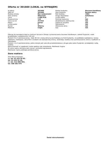Oferta nr 301660 (LOKAL na WYNAJEM) Id oferty SWO ID Rodzaj umowy Stan prawny Cena Powierzchnia Cena za m2 Piętro Liczba pokoi Rynek Materiał 301660 301660 Bez wyłączności Własność 2 800 PLN 110 25 PLN parter 5 Wtórny Cegła Rodzaj budynku Stan budynku Rok budowy Droga dojazdowa Liczba pięter Parking naziemny Okablowanie elektryczne Zaplecze socjalne Ogrzewanie Otwierane okna Gaz Biurowo-handlowy Bardzo dobry 1982 Asfaltowa 1 tak tak tak tak tak tak Oferuję do wynajęcia lokal w centrum Szczecin Zdroje o przeznaczeniu biurowo handlowym, zakład fryzjerski, małe przedszkole, o powierzchni 110 m2. Poziom 0 to 2 pomieszczenia : Sala 30 m2 z dużą witryną wychodzącą na front budynku, na podłodze wykładzina, ściany gładzone, malowane, okna PCV z kratami od zewnętrznej strony, wiatrołap, toaleta oraz pomieszczenie 15m2 z szafkami w zabudowie. Poziom 1 to 2 pomieszczenia, jedno służyło jaki sala dla przedszkolakow a drugie jako salon fryzjerski, przedpokój z sofą, toaleta. Nieruchomość w zupełności może spełnia rolę mieszkania. Możliwośc kupna. W cenie najmu wliczony jest czynsz, centralne ogrzewanie. Możliwośc najmu jednego pomieszczenia. Dane maklera Arka Nieruchomości tel. tel. 91 433 59 85, tel. 91 433 52 49, tel. tel. 512 080 803, tel. 508 382 979 Świat nieruchomości Powered by TCPDF (www.tcpdf.org)