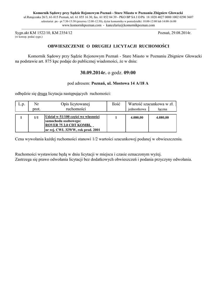 Komornik Sądowy przy Sądzie Rejonowym Poznań - Stare Miasto w Poznaniu Zbigniew Głowacki ul.Ratajczaka 26/3, 61-815 Poznań, tel. 61 855 16 30, fax. 61 852 84 39 - PKO BP SA I O/Pń 18 1020 4027 0000 1002 0290 3607 sekretariat pn - pt 7:30-15:30 (przerwa 12:00-12:30), dyżur komornika w poniedziałki: 10:00-12:00 lub 14:00-16:00 www.komornikpoznan.com - [email protected] Sygn.akt KM 1522/10, KM 2354/12 Poznań, 29.08.2014r. (w koresp. podać sygn.) OBWIESZCZENIE O DRUGIEJ LICYTACJI RUCHOMOŚCI Komornik Sądowy przy Sądzie Rejonowym Poznań - Stare Miasto w Poznaniu Zbigniew Głowacki na podstawie art. 875 kpc podaje do publicznej wiadomości, że w dniu: 30.09.2014r. o godz. 09:00 pod adresem: Poznań, ul. Mostowa 14 A/18 A odbędzie się druga licytacja następujących ruchomości: L.p. 1 Nr prot. 1/1 Opis licytowanej ruchomości Udział w 51/100 części we własności samochodu osobowego: ROVER 75 2,0 CDT KOMBI, nr rej. CWL 32WW, rok prod. 2001 Ilość 1 Wartość szacunkowa w zł. jednostkowa łączna 4.080,00 4.080,00 Cena wywołania każdej ruchomości stanowi 1/2 wartości szacunkowej podanej w obwieszczeniu. Ruchomości wystawione będą w dniu licytacji w miejscu i czasie oznaczonym wyżej. Zastrzega się prawo odwołania licytacji bez dodatkowych obwieszczeń i podania przyczyny odwołania.