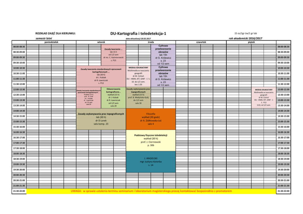 DU-Kartografia i teledetekcja-1 ROZKŁAD ZAJĘĆ DLA KIERUNKU: semestr letni poniedziałek środa Zasady tworzenia ... lab 15 h od 1/2 sem dr inz. C. Kaźmierowski s. P13 08:30-09:00 09:00-09:30 09:30-10:00 10:30-11:00 11:00-11:30 11:30-12:00 12:00-12:30 12:30-13:00 13:00-13:30 13:30-14:00 rok akademicki 2016/2017 data aktualizacji 20.02.2017 wtorek 08:00-08:30 10:00-10:30 15 os/1gr ćw/1 gr lab Zasady tworzenia standardowych opracowań kartogrfaicznych ... lab (30 h) dr J. Kubiak dr R. Ławniczak s. P13 Zasady tworzenia standardowych opracowań kartogrfaicznych ... Wykład (15 h) prof. R. Graf dr J. Kubiak dr . Ławniczak do 1/2 sem sala 20 Odwzorowania kartograficzne… wykład (15 h) dr J. Kubiak dr R. Ławniczak od 1/2 sem sala 20 MODUŁ EDUKACYJNY Multimedia w nauczaniu geografii dr M. Cichoń DU - HMIK, KIT, GINF - 1 S. 16 do 1/2 sem. bez 1.03 czwartek Zasady wykonywania prac topograficznych wykład (15 h) prof. B. Medyńska-Gulij do 1/2 sem sala 18 14:00-14:30 14:30-15:00 15:00-15:30 Filozofia wykład (30 godz) dr A. Ziółkowska-Juś sala 4 09:30-10:00 10:00-10:30 10:30-11:00 11:00-11:30 11:30-12:00 MODUŁ EDUKACYJNY Multimedia w nauczaniu geografii dr M. Cichoń DU - HMIK, KIT, GINF - 1 S. P13 3.03, od 1/2 sem. 12:00-12:30 12:30-13:00 13:00-13:30 13:30-14:00 14:30-15:00 15:00-15:30 16:30-17:00 17:00-17:30 17:30-18:00 18:00-18:30 19:00-19:30 09:00-09:30 16:00-16:30 Podstawy fizyczne teledetekcji wykład (30 h) prof. J. Cierniewski p. 306 17:30-18:00 18:30-19:00 08:30-09:00 15:30-16:00 16:00-16:30 17:00-17:30 08:00-08:30 14:00-14:30 Zasady wykonywania prac topograficznych lab (30 h) dr D Lorek sala komp. 23 15:30-16:00 16:30-17:00 piątek Cyfrowe przetwarzanie obrazów lab 15h dr S. Królewicz s. 23 od 1/2 sem Cyfrowe przetwarzanie obrazów lab 15h dr S. Królewicz s. 23 od 1/2 sem 18:00-18:30 J. ANGIELSKI mgr Justyna Koterba s. 14 18:30-19:00 19:00-19:30 19:30-20:00 19:30-20:00 20:00-20:30 20:00-20:30 20:30-21:00 20:30-21:00 21:00-21:30 21:00-21:30 21:30-22:00 UWAGA: w sprawie ustalenia terminu seminarium i laboratorium magisterskiego proszę kontaktować bezpośrednio z promotorem 21:30-22:00