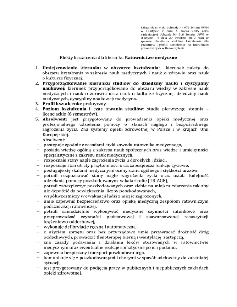 Załącznik nr 8 do Uchwały Nr 672 Senatu UWM w Olsztynie z dnia 6 marca 2015 roku zmieniającej Uchwałę Nr 916 Senatu UWM w Olsztynie z dnia 27 kwietnia 2012 roku w sprawie określenia efektów kształcenia dla poziomów i profili kształcenia na kierunkach prowadzonych w Uniwersytecie Efekty kształcenia dla kierunku Ratownictwo medyczne 1. Umiejscowienie kierunku w obszarze kształcenia: kierunek należy do obszaru kształcenia w zakresie nauk medycznych i nauk o zdrowiu oraz nauk o kulturze fizycznej. 2. Przyporządkowanie kierunku studiów do dziedziny nauki i dyscypliny naukowej: kierunek przyporządkowano do obszaru wiedzy w zakresie nauk medycznych i nauk o zdrowiu oraz nauk o kulturze fizycznej, dziedziny nauk medycznych, dyscypliny naukowej: medycyna. 3. Profil kształcenia: praktyczny. 4. Poziom kształcenia i czas trwania studiów: studia pierwszego stopnia – licencjackie (6 semestrów). 5. Absolwent: jest przygotowany do prowadzenia opieki medycznej oraz profesjonalnego udzielenia pomocy w stanach nagłego i bezpośredniego zagrożenia życia. Zna systemy opieki zdrowotnej w Polsce i w krajach Unii Europejskiej. Absolwent: − postępuje zgodnie z zasadami etyki zawodu ratownika medycznego, − posiada wiedzę ogólną z zakresu nauk społecznych oraz wiedzę i umiejętności specjalistyczne z zakresu nauk medycznych, − rozpoznaje stany nagłe zagrożenia życia u dorosłych i dzieci, − rozpoznaje stan utraty przytomności oraz zabezpiecza funkcje życiowe, − posługuje się skalami medycznymi oceny stanu ogólnego i ciężkości urazów, − potrafi rozpoznawać stany nagłe zagrożenia życia oraz ustala kolejność udzielania pomocy poszkodowanym w katastrofie (TRIAGE), − potrafi zabezpieczyć poszkodowanych oraz siebie na miejscu zdarzenia tak aby nie dopuścić do powiększenia liczby poszkodowanych, − współuczestniczy w ewakuacji ludzi z miejsc zagrożonych, − umie zapewnić bezpieczeństwo oraz opiekę medyczną zespołom ratowniczym podczas akcji ratowniczej, − potrafi samodzielnie wykonywać medyczne czynności ratunkowe oraz przeprowadzać czynności podstawowej i zaawansowanej resuscytacji krążeniowo-oddechowej, − wykonuje defibrylację ręczną i automatyczną, − z użyciem sprzętu oraz bez przyrządowo umie przywracać drożność dróg oddechowych, prowadzić tlenoterapię bierną i wentylację zastępczą, − zna zasady podawania i działania leków stosowanych w ratownictwie medycznym oraz ewentualne reakcje somatyczne po ich podaniu, − zapewnia bezpieczny transport poszkodowanego, − komunikuje się z poszkodowanymi i chorymi w sposób adekwatny do zaistniałej sytuacji, − jest przygotowany do podjęcia pracy w publicznych i niepublicznych zakładach opieki zdrowotnej, − potrafi przeprowadzić szkolenie z zakresu pierwszej pomocy, kwalifikowanej pierwszej pomocy i popularyzować wiedzę ratowniczą we wszystkich środowiskach, − systematycznie wzbogaca swoją wiedzę z zakresu umiejętności zawodowych poprzez różne formy samokształcenia, − posługuje się językiem obcym na poziomie pozwalającym komunikowanie się z chorym i członkami innych zespołów ratowniczych. 6. Objaśnienie oznaczeń: a) K (przed podkreślnikiem) kierunkowe efekty kształcenia b) P profil praktyczny c) 1 studia pierwszego stopnia d) W kategoria wiedzy e) U kategoria umiejętności f) K (po podkreślniku) kategoria kompetencji społecznych g) M1P efekty kształcenia w obszarze kształcenia w zakresie nauk medycznych, nauk o zdrowiu oraz nauk o kulturze fizycznej dla studiów pierwszego stopnia h) 01, 02, 03 i kolejne numer efektu kształcenia Symbol efektu kierunkowego K1P_W01 K1 P _W02 K1P_W03 K1P_W04 K1P_W05 K1P_W06 K1P_W07 Kierunkowe efekty kształcenia dla kierunku studiów ratownictwo medyczne po ukończeniu studiów pierwszego stopnia absolwent: WIEDZA Zna historię medycyny ratunkowej Zna podstawy prawne i zasady funkcjonowania państwowego i prywatnego systemu opieki zdrowotnej w Polsce i na świecie Podaje zasady funkcjonowania zintegrowanego systemu ratownictwa medycznego Posiada podstawowe wiadomości z zakresu prawa karnego, cywilnego i administracyjnego w odniesieniu do zasad wykonywanego zawodu ratownika medycznego Zna zasady dotyczące prowadzenia działalności gospodarczej Definiuje podstawowe pojęcia z zakresu promocji zdrowia, edukacji zdrowotnej i profilaktyki Zna zagadnienia z zakresu socjologii i główne teorie wyjaśniające problemy społeczne i ich wpływ na Symbol efektu kształcenia w obszarze kształcenia w zakresie nauk medycznych i nauk o zdrowiu oraz nauk o kulturze fizycznej M1P_W09 M1P_W08 M1P_W12 M1P_W09 M1P_W11 M1P_W08 M1P_W06 M1P_W04 K1P_W08 K1P_W09 K1P_W10 K1P_W11 K1P_W12 K1P_W13 K1P_W14 K1P_W15 K1P_W16 K1P_W17 K1P_W18 K1P_W19 K1P_W20 K1P_W21 K1P_W22 K1P_W23 K1P_W24 K1P_W25 zdrowie człowieka Zna podstawowe pojęcia dotyczące moralności i etyki w odniesieniu do zawodu ratownika medycznego Posiada wiedzę z zakresu filozofii w odniesieniu do różnych postaw ludzkich Zna podstawowe pojęcia z psychologii człowieka i charakteryzuje wpływ procesów poznawczych na działania ratowników i zespołów medycznych oraz na zachowanie pacjenta Zna zasady przeprowadzania badań naukowych w tym zbierania informacji i analizy danych naukowych Zna wpływ sprawności motorycznej na skuteczność działań ratowniczych i obrony własnej Definiuje podstawowe zjawiska biofizyczne i biochemiczne mające wpływ na funkcjonowanie organizmu ludzkiego Zna czynność i podstawowe mechanizmy regulacji poszczególnych narządów i układów w organizmie człowieka Zna mianownictwo anatomiczne oraz budowę ciała ludzkiego w ujęciu topograficznym (kończyna górna i dolna, klatka piersiowa, brzuch, miednica, grzbiet, szyja, głowa) oraz opisowym Zna podstawy procesów patofizjologicznych zachodzących w organizmie człowieka Zna mechanizmy obrony własnej organizmu przed szkodliwymi czynnikami wewnętrznymi i zewnętrznymi