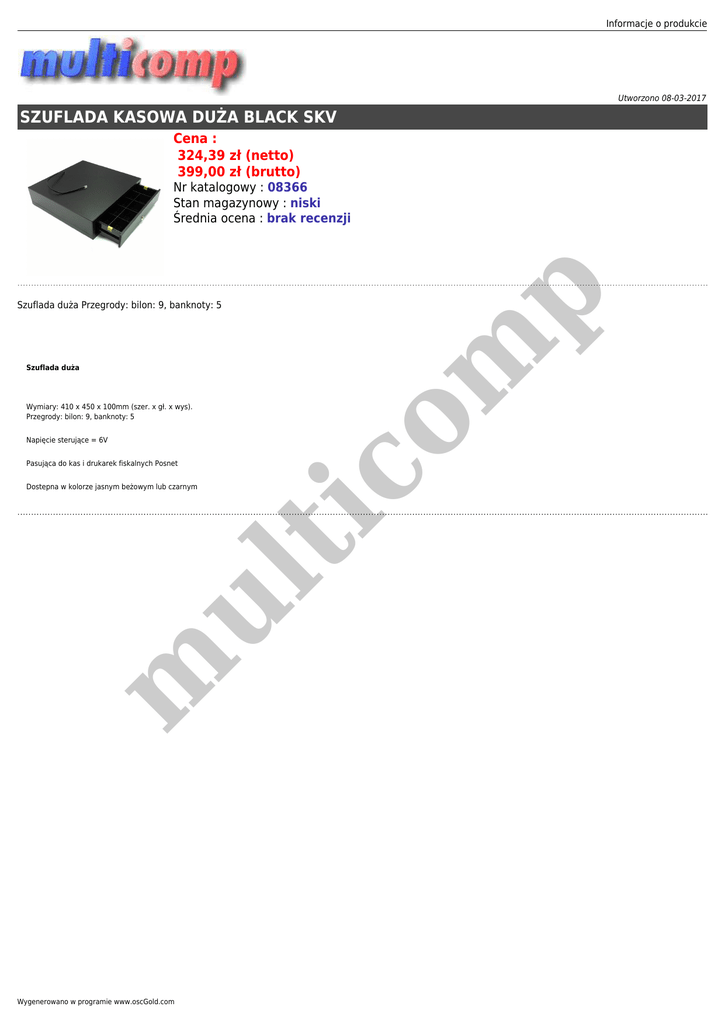 Informacje o produkcie Utworzono 08-03-2017 SZUFLADA KASOWA DUŻA BLACK SKV Cena : 324,39 zł (netto) 399,00 zł (brutto) Szuflada duża Przegrody: bilon: 9, banknoty: 5 Wymiary: 410 x 450 x 100mm (szer. x gł. x wys). Przegrody: bilon: 9, banknoty: 5 Napięcie sterujące = 6V Pasująca do kas i drukarek fiskalnych Posnet m ul Dostepna w kolorze jasnym beżowym lub czarnym ti co Szuflada duża Wygenerowano w programie www.oscGold.com m p Nr katalogowy : 08366 Stan magazynowy : niski Średnia ocena : brak recenzji