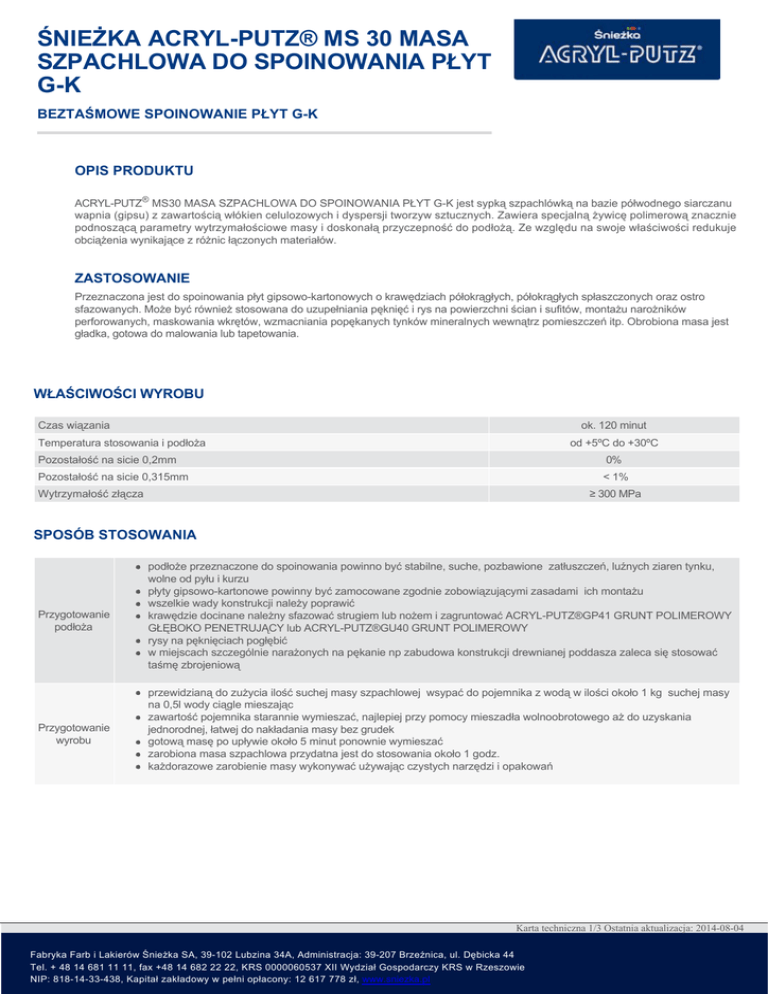 ŚNIEŻKA ACRYLPUTZ® MS 30 MASA SZPACHLOWA DO SPOINOWANIA PŁYT G-K BEZTAŚMOWE SPOINOWANIE PŁYT GK OPIS PRODUKTU ACRYL-PUTZ® MS30 MASA SZPACHLOWA DO SPOINOWANIA PŁYT GK jest sypką szpachlówką na bazie półwodnego siarczanu wapnia (gipsu) z zawartością włókien celulozowych i dyspersji tworzyw sztucznych. Zawiera specjalną żywicę polimerową znacznie podnoszącą parametry wytrzymałościowe masy i doskonałą przyczepność do podłożą. Ze względu na swoje właściwości redukuje obciążenia wynikające z różnic łączonych materiałów. ZASTOSOWANIE Przeznaczona jest do spoinowania płyt gipsowokartonowych o krawędziach półokrągłych, półokrągłych spłaszczonych oraz ostro sfazowanych. Może być również stosowana do uzupełniania pęknięć i rys na powierzchni ścian i sufitów, montażu narożników perforowanych, maskowania wkrętów, wzmacniania popękanych tynków mineralnych wewnątrz pomieszczeń itp. Obrobiona masa jest gładka, gotowa do malowania lub tapetowania. WŁAŚCIWOŚCI WYROBU Czas wiązania ok. 120 minut Temperatura stosowania i podłoża od +5ºC do +30ºC Pozostałość na sicie 0,2mm 0% Pozostałość na sicie 0,315mm < 1% Wytrzymałość złącza ≥ 300 MPa SPOSÓB STOSOWANIA Przygotowanie podłoża podłoże przeznaczone do spoinowania powinno być stabilne, suche, pozbawione zatłuszczeń, luźnych ziaren tynku, wolne od pyłu i kurzu płyty gipsowokartonowe powinny być zamocowane zgodnie zobowiązującymi zasadami ich montażu wszelkie wady konstrukcji należy poprawić krawędzie docinane należny sfazować strugiem lub nożem i zagruntować ACRYLPUTZ®GP41 GRUNT POLIMEROWY GŁĘBOKO PENETRUJĄCY lub ACRYLPUTZ®GU40 GRUNT POLIMEROWY rysy na pęknięciach pogłębić w miejscach szczególnie narażonych na pękanie np zabudowa konstrukcji drewnianej poddasza zaleca się stosować taśmę zbrojeniową Przygotowanie wyrobu przewidzianą do zużycia ilość suchej masy szpachlowej wsypać do pojemnika z wodą w ilości około 1 kg suchej masy na 0,5l wody ciągle mieszając zawartość pojemnika starannie wymieszać, najlepiej przy pomocy mieszadła wolnoobrotowego aż do uzyskania jednorodnej, łatwej do nakładania masy bez grudek gotową masę po upływie około 5 minut ponownie wymieszać zarobiona masa szpachlowa przydatna jest do stosowania około 1 godz. każdorazowe zarobienie masy wykonywać używając czystych narzędzi i opakowań Karta techniczna 1/3 Ostatnia aktualizacja: 2014-08-04 Fabryka Farb i Lakierów Śnieżka SA, 39102 Lubzina 34A, Administracja: 39207 Brzeźnica, ul. Dębicka 44 Tel. + 48 14 681 11 11, fax +48 14 682 22 22, KRS 0000060537 XII Wydział Gospodarczy KRS w Rzeszowie NIP: 8181433438, Kapitał zakładowy w pełni opłacony: 12 617 778 zł, www.sniezka.pl Spoinowanie nakładać za pomocą szpachelki, pacą ze stali nierdzewnej minimalne dwie warstwy aplikację prowadzić w temp podłoża i otoczenia od +10°C spoinowanie beztaśmowe/ naprawa rys warstwa pierwsza wypełnić spoinę i po około 50 min zebrać nadmiar masy. Warstwa druga szeroką pacą wypełnić obszar spoiny tak by uzyskać równą i gładką płaszczyznę po wyschnięciu, w razie potrzeby nałożyć trzecią warstwę jeszcze szerszą szpachelką spoinowanie z użyciem taśmy nałożyć masę wzdłuż spoiny tak by na jej mokrą powierzchnię można było nakleić taśmę papierową lub siatkę taśmę nakładać wypukłością do ściany tak, aby środek jej szerokości przebiegał wzdłuż szczeliny za pomocą szpachelki starannie usunąć pęcherzyki powietrza spod taśmy, wciskając ją w świeżo nałożoną warstwę masy po wyschnięciu spoin szerszą szpachelką nałożyć wyrównującą drugą warstwę masy, w razie potrzeby nałożyć kolejna warstwę ostatnią wyschniętą warstwę masy szpachlowej przeszlifować papierem ściernym lub siatką o gradacji 150, odpylić i malować wzmacnianie popękanych tynków mineralnych nałożyć masę na powierzchni tynku w warstwie 23 mm, następnie zatopić siatkę zbrojeniową z włókna szklanego. łączenie arkuszy siatki należny wykonywać stosując zakładkę min 5cm całą powierzchnie zaszpachlować tak by dokładnie zatopić siatkę w masie dalsze prace prowadzić tak jak w przypadku wykonywani gładzi na powierzchni tynków mineralnych PARAMETRY MALOWANIA DLA POSZCZEGÓLNYCH METOD Nie dotyczy OKRES PRZYDATNOŚCI 12 miesięcy od daty produkcji OPAKOWANIA 5kg, 20kg WYDAJNOŚĆ zależna od grubości warstw – około 0,3 kg/mb przy grubości warstwy 1mm. KOLORYSTYKA kremowa LZO brak NORMY, BADANIA I ATESTY Atest PZH HK/B/1633/10/2011 EN 13693 Typ 4B Masa szpachlowa do beztaśmowego spoinowania płyt gipsowokartonowych Reakcja na ogień: Bs1,d0 Wytrzymałość złącza: ≥ 300N DEKLARACJA WŁAŚCIWOŚCI UŻYTKOWYCH Nr 06/MS30/2013 WSKAZÓWKI BHP I PPOŻ Uwagi: Chronić przed wilgocią. Przechowywać poza zasięgiem dzieci. UWAGA! Informacje zawarte w karcie technicznej mają na celu zapewnienie optymalnego wykorzystania produktu, jednak nie są podstawą do odpowiedzialności prawnej Producenta, gdyż warunki wykonawstwa pozostają poza jego kontrolą. Wszelka ingerencja w skład produktu jest niedopuszczalna i może w znaczny sposób obniżyć jakość stosowanego materiału. W przypadku połączenia z wyrobami innych Karta techniczna 2/3 Ostatnia aktualizacja: 2014-08-04 Fabryka Farb i Lakierów Śnieżka SA, 39102 Lubzina 34A, Administracja: 39207 Brzeźnica, ul. Dębicka 44 Tel. + 48 14 681 11 11, fax +48 14 682 22 22, KRS 0000060537 XII Wydział Gospodarczy KRS w Rzeszowie NIP: 8181433438, Kapitał zakładowy w pełni opłacony: 12 617 778 zł, www.sniezka.pl Producentów nie ponosimy żadnej odpowiedzialności. Przedstawione powyżej informacje podane zostały w dobrej wierze, według aktualnego stanu wiedzy i doświadczenia praktycznego. Producent zastrzega sobie prawo do zmiany treści w kolejnych edycjach bez wcześniejszego informowania o tym fakcie odbiorców. Karta 