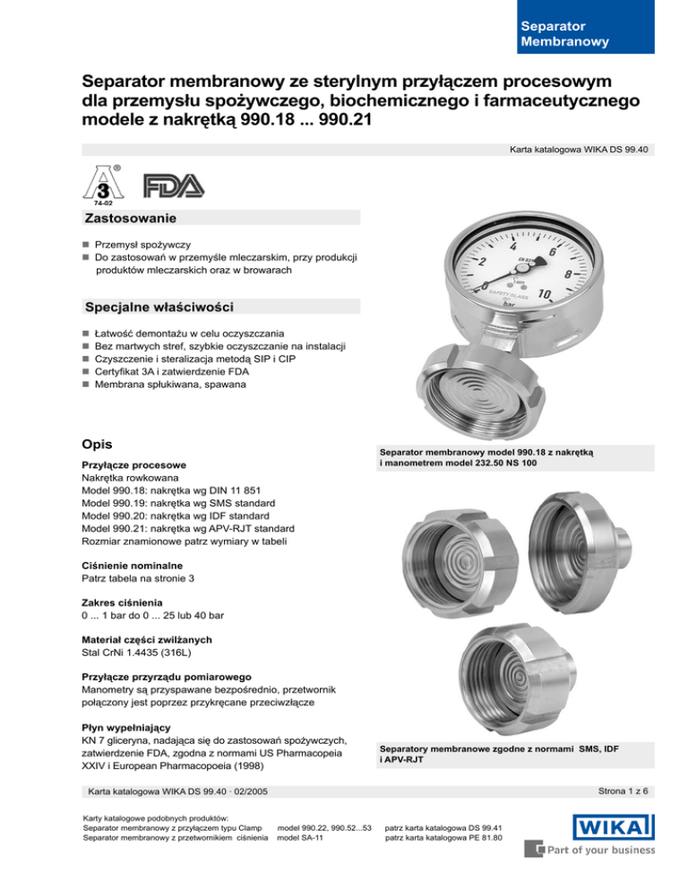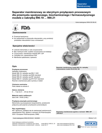 Separator Membranowy Separator membranowy ze sterylnym przyłączem procesowym dla przemysłu spożywczego, biochemicznego i farmaceutycznego modele z nakrętką 990.18 ... 990.21 Karta katalogowa WIKA DS 99.40 Zastosowanie Przemysł spożywczy Do zastosowań w przemyśle mleczarskim, przy produkcji produktów mleczarskich oraz w browarach Specjalne właściwości Łatwość demontażu w celu oczyszczania Bez martwych stref, szybkie oczyszczanie na instalacji Czyszczenie i steralizacja metodą SIP i CIP Certyfikat 3A i zatwierdzenie FDA Membrana spłukiwana, spawana Opis Przyłącze procesowe Nakrętka rowkowana Model 990.18: nakrętka wg DIN 11 851 Model 990.19: nakrętka wg SMS standard Model 990.20: nakrętka wg IDF standard Model 990.21: nakrętka wg APV-RJT standard Rozmiar znamionowe patrz wymiary w tabeli Separator membranowy model 990.18 z nakrętką i manometrem model 232.50 NS 100 Ciśnienie nominalne Patrz tabela na stronie 3 Zakres ciśnienia 0 ... 1 bar do 0 ... 25 lub 40 bar Materiał części zwilżanych Stal CrNi 1.4435 (316L) Przyłącze przyrządu pomiarowego Manometry są przyspawane bezpośrednio, przetwornik połączony jest poprzez przykręcane przeciwzłącze Płyn wypełniający KN 7 gliceryna, nadająca się do zastosowań spożywczych, zatwierdzenie FDA, zgodna z normami US Pharmacopeia XXIV i European Pharmacopoeia (1998) Separatory membranowe zgodne z normami SMS, IDF i APV-RJT Strona 1 z 6 Karta katalogowa WIKA DS 99.40 · 02/2005 Karty katalogowe podobnych produktów: Separator membranowy z przyłączem typu Clamp Separator membranowy z przetwornikiem ciśnienia model 990.22, 990.52...53 model SA-11 patrz karta katalogowa DS 99.41 patrz karta katalogowa PE 81.80 Opcjonalnie Przyłącze procesowe Gwint zewnętrzny Inne średnice znamionowe, przyłącze takie jak Südmo, BBS i sterylne przyłącza procesowe na zapytania Ciśnienie nominalne Wyższe ciśnienie nominalne na zapytanie Materiał części zwilżanych Stal CrNi elektropolerowana 1.4435 Inne materiały na zapytanie Montaż przyrządów pomiarowych Montaż poprzez wieżę chłodzącą Montaż poprzez kapilarę, przy zamówieniu proszę podać długość kapilary Płyn wypełniający Ciekła parafina KN 62 l (medyczny olej biały), nadaje się do zastosowań farmaceutycznych, zatwierdzenie FDA Gliceryna/woda KN 12, zatwierdzenie FDA Przykładowe bezpośrednie połączenie separatora membranowego z nakrętką model 990.18 z manometrem do kształtki rurowej z odpowiednim gwintem zewnętrznym Przyrząd pomiarowy h NS (manometr lub przetwornik) Montaż bezpośredni Separator membranowy Membrana (przyspawana do separatora) Nakętka Uszczelka Przyspawana oprawka Manometr Rozmiar nominalny Rozmiar w mm Wysokość h NS 63 NS 100 ok. 105 ok. 156 Nie zawarte w zamówieniu Ta sama wyskość obowiązuję także dla modeli 990.19, 990.20 i 990.21 Strona 2 z 6 Karta katalogowa WIKA DS 99.40 · 02/2005 Wymiary w mm Model 990.18 gwint wg DIN 11 851 z gwintem zewnętrznym f b g e z nakrętką Ød Ød Ø Mb Ø d6 Ø Mb Legenda: Ø Mb efektywna średnica membrany Ø d wewnętrzna średnica rury ØG gwinty ØG ØD Ø d3 Ø d4 DN Dla zew. PN Ø rury x grubość Rozmiar w mm G b d Mb D d3 d4 d6 e f g 20 25 32 40 50 80 23 x 1,5 29 x 1,5 35 x 1,5 41 x 1,5 53 x 1,5 85 x 2 Rd 44 x D Rd 52 x D Rd 58 x D Rd 65 x D Rd 78 x D Rd 110 x ¼ 14 14 14 14 14 20 20 26 32 38 50 81 22 25 32 40 52 71 54 63 70 78 92 127 23 30 36 42 54 85 32,8 39,8 45,8 51,8 63,8 94,8 36,5 44 50 56 68,5 100 3 3,5 3,5 3,5 3,5 3,5 6 7 7 7 7 8 8 10 10 10 11 12 40 40 40 40 25 25 Waga w kg 0,4 0,4 0,5 0,75 0,8 1,25 Przyrządy pomiarowe model 990.18 mogą również być używane do rur zgodnie z DIN 11 850 kolumny 1 ... 3 Karta katalogowa WIKA DS 99.40 · 02/2005 Strona 3 z 6 Model 990.19 gwinty SMS z nakrętką z gwintem zewnętrznym l1 B 3 l2 Ø Mb Ød Ø d2 Ø Mb Legenda: Ø Mb efektywna średnica membrany Ø d wewnętrzna średnica rury ØG gwinty ØG ØD Ød Ø d1 ØG DN Dla zew. PN Ø rury x grubość 1½” 38 x 1,2 2” 51 x 1,2 Rozmiar w mm 40 40 Waga w kg G d Mb d1 d2 D B l1 l2 Rd 60 x D Rd 70 x D 35,6 48,6 35 45 48 61 55 65 74 84 25 26 15 15 4 0,8 4 1,0 Model 990.20 gwinty IDF 3 4 3 z gwintem zewnętrznym 13,5 z nakrętką Ø Mb Ø Mb Ød Legenda: Ø Mb efektywna średnica membrany Ø d wewnętrzna średnica rury ØG gwinty Ø d1 Ø d2 ØG ØD DN dla zew. PN Ø rury x grubość 1½” 38,6 x 1,5 2” 51,6 x 1,5 40 40 Ød Ø d1 Rozmiar w mm ØG Waga w kg G d Mb D d1 d2 1½” IDF 2” IDF 35,6 48,6 32 45 64 79 42,7 56,2 47 60,5 0,7 0,9 Karta katalogowa WIKA DS 99.40 · 02/2005 Strona 4 z 6 Model 990.21 gwinty APV-RJT z nakrętką z gwintem zewnętrznym l1 l2 SW Ø Mb Ø Mb Ød Ød Ø d2 Legenda: Ø Mb efektywna średnica membrany Ø d wewnętrzna średnica rury ØG gwinty Ø d3 ØG DN Dla zew. PN Ø rury x grubość 1½” 38,1 x 1,6 2” 50,8 x 1,6 40 40 ØG Rozmiar w mm G d Mb d2 d3 D l1 l2 SW 2 5/16 x 8” 2 7/8 x 6” 34,9 47,6 32 40 40,5 53,2 54 66,7 25 84 14,3 14,3 2,4 ... 4 2,4 ... 4 65 80 Karta katalogowa WIKA DS 99.40 · 02/2005 Waga w kg 0,9 1,1 Strona 5 z 6 Możliwe kombinacje Manometry z rurką Bourdona Separatory membranowe model 990.18, 990.19, 990.20 lub 990.21 mogą być połączone z manometrami z rurką Bourdona, jeśli uwzględnione będą następujące warunki, dotyczące zastosowania: Separator membranowy połączony bezpośrednio z manometrem Zakres temperatury: medium: +10 ... +150 °C otoczenie: +10 ... +40 °C Wybór Przyłącze procesowe DN 20 ... 32 (1½”) 40 ... 50 (2”) 80 (3”) ... Manometr Model 23x.50.63 23x.50.100 Najniższy zakres pomiarowy 0 ... 4 bar -1 ... 3 bar Max. przeciążenie (opcjonalnie) - Indukcyjne urządzenie kontaktowe (opcjonalnie), nadające się do - strefy 1 i strefy 2 (model 831) 23x.50.63 23x.50/30.100 0 ... 2 bar -1 ... 3 bar 23x.50.63 23x.50/30.100 0 ... 0,6 bar -1 ... 1,5 bar 2 x pełna skala 2 x pełna skala możliwe możliwe Przetwornik ciśnienia Separatory membranowe model 990.18, 990.19, 99