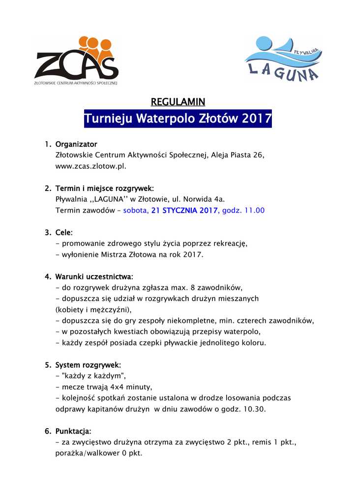 REGULAMIN Turnieju Waterpolo Złotów 2017 1. Organizator Złotowskie Centrum Aktywności Społecznej, Aleja Piasta 26, www.zcas.zlotow.pl. 2. Termin i miejsce rozgrywek: Pływalnia ,,LAGUNA’’ w Złotowie, ul. Norwida 4a. Termin zawodów – sobota, 21 STYCZNIA 2017, godz. 11.00 3. Cele: - promowanie zdrowego stylu życia poprzez rekreację, - wyłonienie Mistrza Złotowa na rok 2017. 4. Warunki uczestnictwa: - do rozgrywek drużyna zgłasza max. 8 zawodników, - dopuszcza się udział w rozgrywkach drużyn mieszanych (kobiety i mężczyźni), - dopuszcza się do gry zespoły niekompletne, min. czterech zawodników, - w pozostałych kwestiach obowiązują przepisy waterpolo, - każdy zespół posiada czepki pływackie jednolitego koloru. 5. System rozgrywek: - "każdy z każdym", - mecze trwają 4x4 minuty, - kolejność spotkań zostanie ustalona w drodze losowania podczas odprawy kapitanów drużyn w dniu zawodów o godz. 10.30. 6. Punktacja: - za zwycięstwo drużyna otrzyma za zwycięstwo 2 pkt., remis 1 pkt., porażka/walkower 0 pkt. - o kolejności miejsc w rozgrywkach decyduje: a) ilość zdobytych punktów, b) wynik bezpośredniego spotkania, c) różnica bramek, d) ilość zdobytych bramek. 7. Odpłatność: Każda drużyna wnosi opłatę w kwocie 48,00 zł w dniu zawodów w kasie pływalni. Istnieje możliwość zapłaty biletami miesięcznymi. 8. Nagrody: Trzy najlepsze drużyny otrzymają medale, dyplomy, nagrody rzeczowe. 9. Inne: - każdy zawodnik powinien posiadać własne ubezpieczenie OC i NNW, - organizator zastrzega sobie prawo do ewentualnych uzupełnień regulaminu oraz jego ostatecznej interpretacji, - każdy zawodnik gra z własnej nieprzymuszonej woli, wobec czego organizatorzy nie ponoszą odpowiedzialności za ewentualne nieszczęście, uszczerbek na zdrowiu spowodowany zdarzeniem w trakcie turnieju. Formularze zgłoszeniowe przyjmujemy do niedzieli, 15 stycznia 2017 włącznie na adres [email protected] Życzymy niezapomnianych wrażeń! DYREKTOR Złotowskiego Centrum Aktywności Społecznej