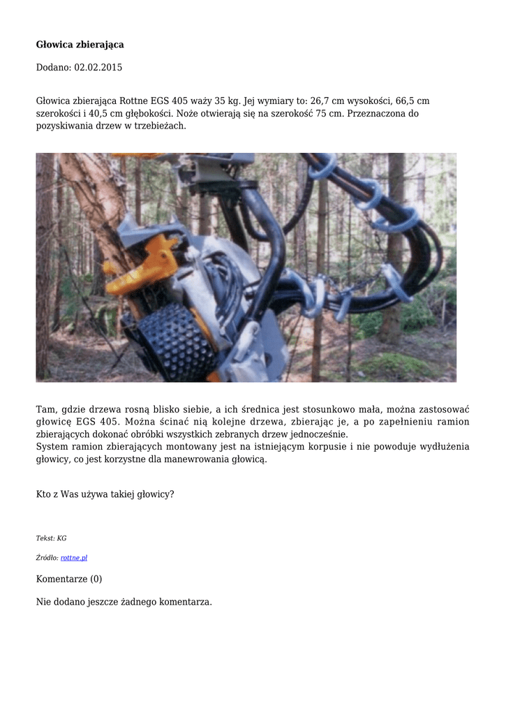 Głowica zbierająca Dodano: 02.02.2015 Głowica zbierająca Rottne EGS 405 waży 35 kg. Jej wymiary to: 26,7 cm wysokości, 66,5 cm szerokości i 40,5 cm głębokości. Noże otwierają się na szerokość 75 cm. Przeznaczona do pozyskiwania drzew w trzebieżach. Tam, gdzie drzewa rosną blisko siebie, a ich średnica jest stosunkowo mała, można zastosować głowicę EGS 405. Można ścinać nią kolejne drzewa, zbierając je, a po zapełnieniu ramion zbierających dokonać obróbki wszystkich zebranych drzew jednocześnie. System ramion zbierających montowany jest na istniejącym korpusie i nie powoduje wydłużenia głowicy, co jest korzystne dla manewrowania głowicą. Kto z Was używa takiej głowicy? Tekst: KG Źródło: rottne.pl Komentarze (0) Nie dodano jeszcze żadnego komentarza.