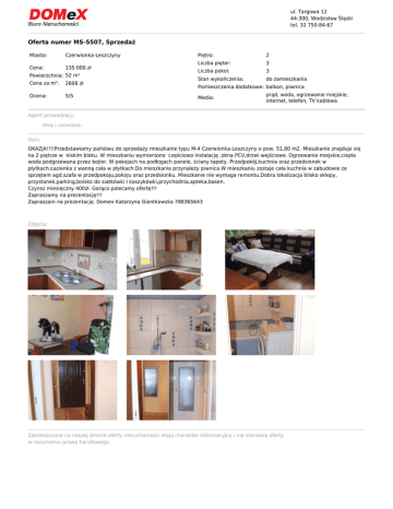 ul. Targowa 12 44-300, Wodzisław Śląski tel. 32 750-84-67 Oferta numer MS-5507, Sprzedaż Miasto: Cena: Czerwionka-Leszczyny 135 000 zł Powierzchnia: 52 m2 Cena za m2: 2606 zł Ocena: 5/5 Piętro: 2 Liczba pięter: 3 Liczba pokoi: 3 Stan wykończenia: do zamieszkania Pomieszczenia dodatkowe: balkon, piwnica Media: prąd, woda, ogrzewanie miejskie, internet, telefon, TV kablowa Agent prowadzący: Imię i nazwisko: Opis: OKAZJA!!!!Przedstawiamy państwu do sprzedaży mieszkanie typu M-4 Czerwionka-Leszczyny o pow. 51,80 m2. Mieszkanie znajduje się na 2 piętrze w niskim bloku. W mieszkaniu wymieniono częściowo instalację ,okna PCV,drzwi wejściowe. Ogrzewanie miejskie,ciepła woda podgrzewana przez bojler. W pokojach na podłogach panele, ściany tapety. Przedpokój,kuchnia oraz przedsionek w płytkach.Łazienka z wanną cała w płytkach.Do mieszkania przynależy piwnica.W mieszkaniu zostaje cała kuchnia w zabudowie ze sprzętem agd,szafa w przedpokoju,pokoju oraz przedsionku. Mieszkanie nie wymaga remontu.Dobra lokalizacja blisko sklepy, przystanek,parking,boisko do siatkówki I koszykówki,przychodnia,apteka,basen. Czynsz miesięczny 400zł. Gorąco polecamy ofertę!!! Zapraszamy na prezentację!!! Zapraszam na prezentację. Domex Katarzyna Gientkowska 788365643 Zdjęcia: Zamieszczone na naszej stronie oferty nieruchomości mają charakter informacyjny i nie stanowią oferty w rozumieniu prawa handlowego.