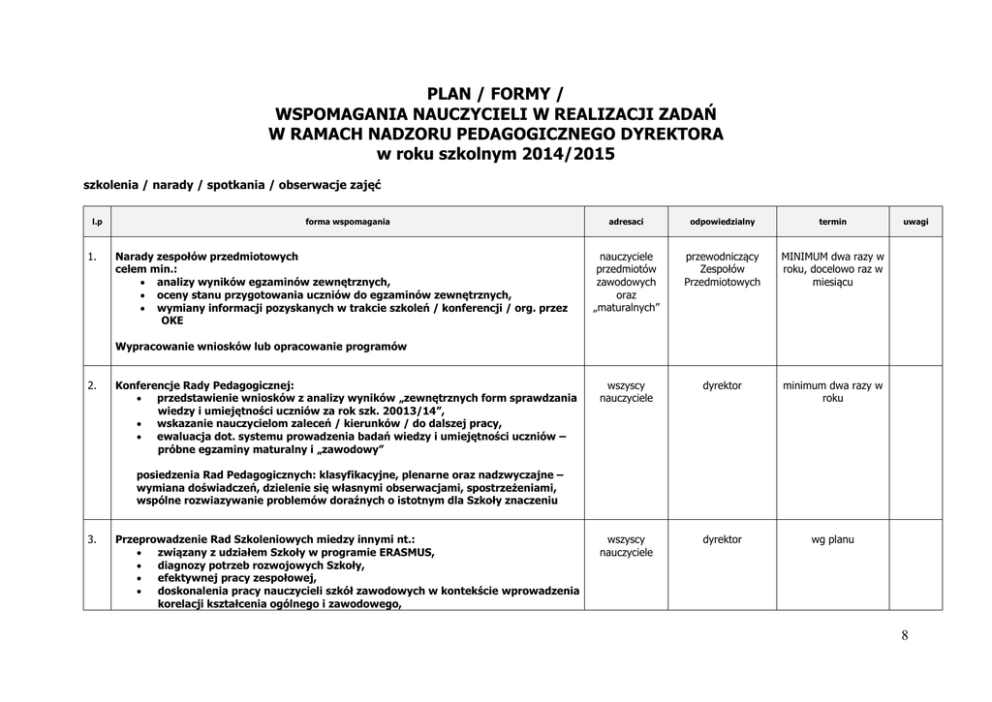 PLAN / FORMY / WSPOMAGANIA NAUCZYCIELI W REALIZACJI ZADAŃ W RAMACH NADZORU PEDAGOGICZNEGO DYREKTORA w roku szkolnym 2014/2015 szkolenia / narady / spotkania / obserwacje zajęć l.p 1. forma wspomagania Narady zespołów przedmiotowych celem min.: analizy wyników egzaminów zewnętrznych, oceny stanu przygotowania uczniów do egzaminów zewnętrznych, wymiany informacji pozyskanych w trakcie szkoleń / konferencji / org. przez OKE adresaci odpowiedzialny termin nauczyciele przedmiotów zawodowych oraz „maturalnych” przewodniczący Zespołów Przedmiotowych MINIMUM dwa razy w roku, docelowo raz w miesiącu wszyscy nauczyciele dyrektor minimum dwa razy w roku wszyscy nauczyciele dyrektor wg planu uwagi Wypracowanie wniosków lub opracowanie programów 2. Konferencje Rady Pedagogicznej: przedstawienie wniosków z analizy wyników „zewnętrznych form sprawdzania wiedzy i umiejętności uczniów za rok szk. 20013/14”, wskazanie nauczycielom zaleceń / kierunków / do dalszej pracy, ewaluacja dot. systemu prowadzenia badań wiedzy i umiejętności uczniów – próbne egzaminy maturalny i „zawodowy” posiedzenia Rad Pedagogicznych: klasyfikacyjne, plenarne oraz nadzwyczajne – wymiana doświadczeń, dzielenie się własnymi obserwacjami, spostrzeżeniami, wspólne rozwiazywanie problemów doraźnych o istotnym dla Szkoły znaczeniu 3. Przeprowadzenie Rad Szkoleniowych miedzy innymi nt.: związany z udziałem Szkoły w programie ERASMUS, diagnozy potrzeb rozwojowych Szkoły, efektywnej pracy zespołowej, doskonalenia pracy nauczycieli szkół zawodowych w kontekście wprowadzenia korelacji kształcenia ogólnego i zawodowego, 8 5. „Niechęć do szkoły. Stres, depresja i próby samobójcze wśród młodzieży – strategia reagowania i przeciwdziałania” „Integracja międzyprzedmiotowa – czyli jak przeciwdziałać szufladkowaniu wiedzy” Spotkania z doradcami metodycznymi pozostałe tematy wg ofert firm szkoleniowych Szkolenia w ramach WDN: a) szkolenia wewnętrzne w ramach WDN dot.: dokumentacji szkolnej i prawidłowego jej prowadzenia po zmianach prawa i wprowadzenia w Szkole dziennika elektronicznego jako jedynej formy dok. wyników nauczania, b) szkolenia wewnętrzne – instruktarzowe obejmujące: procedury przeprowadzania „egzaminów zewnętrznych”, dot. obsługi dziennika elektronicznego, omówienie i interpretację wybranych zmian / zapisów / statutu Szkoły. wybrane grupy nauczycieli dyrektor zgodnie z planem, doraźnie Obserwacje zajęć: Podczas obserwacji zajęć szczególnej uwadze podlegać będą: 1. 2. 3. 4. 5. 6. 7. 8. Relacje uczeń –nauczyciel . Uzasadnianie ocen bieżących i z prac pisemnych. Indywidualizacja w nauczaniu. Wykorzystywanie technologii informatycznej i komunikacyjnej w procesie edukacyjnym. Ewaluacja wyników pracy nauczyciela na zajęciach i wykorzystywanie ich w planowaniu pracy. Systematyczność realizacji podstawy programowej. Przestrzeganie przepisów bhp w czasie zajęć. Wykorzystywanie zasad nauczania, a w szczególności stopniowania trudności, korelacji, twórczego myślenia. 9