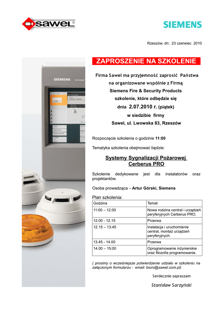 Rzeszów, dn: 23 czerwiec 2010 ZAPROSZENIE NA SZKOLENIE Firma Sawel ma przyjemność zaprosić Państwa na organizowane wspólnie z Firmą Siemens Fire & Security Products szkolenie, które odbędzie się dnia 2.07.2010 r. (piątek) w siedzibie firmy Sawel, ul. Lwowska 83, Rzeszów Rozpoczęcie szkolenia o godzinie 11:00 Tematyka szkolenia obejmować będzie: Systemy Sygnalizacji Pożarowej Cerberus PRO Szkolenie dedykowane projektantów. jest dla instalatorów oraz Osoba prowadząca – Artur Górski, Siemens Plan szkolenia: Godzina Temat 11:00 – 12.00 Nowa rodzina central i urządzeń peryferyjnych Cerberus PRO. 12.00 - 12.15 Przerwa 12.15 – 13:45 Instalacja i uruchomienie central, montaż urządzeń peryferyjnych. 13.45 - 14.00 Przerwa 14.00 – 15:00 Oprogramowanie inżynierskie oraz filozofia programowania. ( prosimy o wcześniejsze potwierdzenie udziału w szkoleniu na załączonym formularzu - email: [email protected]) Serdecznie zapraszam Stanisław S arzyński