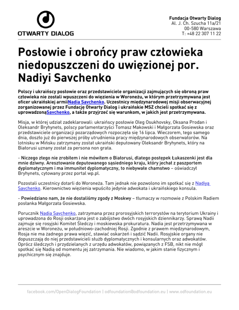 Fundacja Otwarty Dialog Al. J. Ch. Szucha 11a/21 00-580 Warszawa T: +48 22 307 11 22 Posłowie i obrońcy praw człowieka niedopuszczeni do uwięzionej por. Nadiyi Savchenko Polscy i ukraińscy posłowie oraz przedstawiciele organizacji zajmujących się obroną praw człowieka nie zostali wpuszczeni do więzienia w Woroneżu, w którym przetrzymywana jest oficer ukraińskiej armiiNadia Savchenko. Uczestnicy międzynarodowej misji obserwacyjnej zorganizowanej przez Fundację Otwarty Dialog i ukraińskie MSZ chcieli spotkać się z uprowadzonąSavchenko, a także przyjrzeć się warunkom, w jakich jest przetrzymywana. Misja, w której udział zadeklarowali: ukraińscy posłowie Oleg Osukhovsky, Oksana Prodan i Oleksandr Bryhynets, polscy parlamentarzyści Tomasz Makowski i Małgorzata Gosiewska oraz przedstawiciele organizacji pozarządowych rozpoczęła się 16 lipca. Wieczorem, tego samego dnia, doszło już do pierwszej próby utrudnienia pracy międzynarodowych obserwatorów. Na lotnisku w Mińsku zatrzymany został ukraiński deputowany Oleksandr Bryhynets, który na Białorusi uznany został za persona non grata. - Niczego złego nie zrobiłem i nie mówiłem o Białorusi, dlatego postępek Łukaszenki jest dla mnie dziwny. Aresztowanie deputowanego sąsiedniego kraju, który jechał z paszportem dyplomatycznym i ma immunitet dyplomatyczny, to niebywałe chamstwo – oświadczył Bryhynets, cytowany przez portal wp.pl. Pozostali uczestnicy dotarli do Woroneża. Tam jednak nie pozwolono im spotkać się z Nadiyą Savchenko. Kierownictwo więzienia wpuściło jedynie adwokata i ukraińskiego konsula. - Powiedziano nam, że nie dostaliśmy zgody z Moskwy – tłumaczy w rozmowie z Polskim Radiem posłanka Małgorzata Gosiewska. Porucznik Nadia Savchenko, zatrzymana przez prorosyjskich terrorystów na terytorium Ukrainy i uprowadzona do Rosji oskarżana jest o zabójstwo dwóch rosyjskich dziennikarzy. Sprawą Nadii zajmuje się rosyjski Komitet Śledczy i moskiewska prokuratura. Nadia jest przetrzymywana w areszcie w Woroneżu, w południowo-zachodniej Rosji. Zgodnie z prawem międzynarodowym, Rosja nie ma żadnego prawa więzić, stawiać oskarżeń i sądzić Nadii. Rosyjskie organy nie dopuszczają do niej przedstawicieli służb dyplomatycznych i konsularnych oraz adwokatów. Oprócz śledczych i przydzielanych z urzędu adwokatów, powiązanych z FSB, nikt nie mógł spotkać się Nadią od momentu jej zatrzymania. Nie wiadomo, w jakim stanie fizycznym i psychicznym się znajduje. facebook.com/OpenDialogFoundation | [email protected] | www.odfoundation.eu