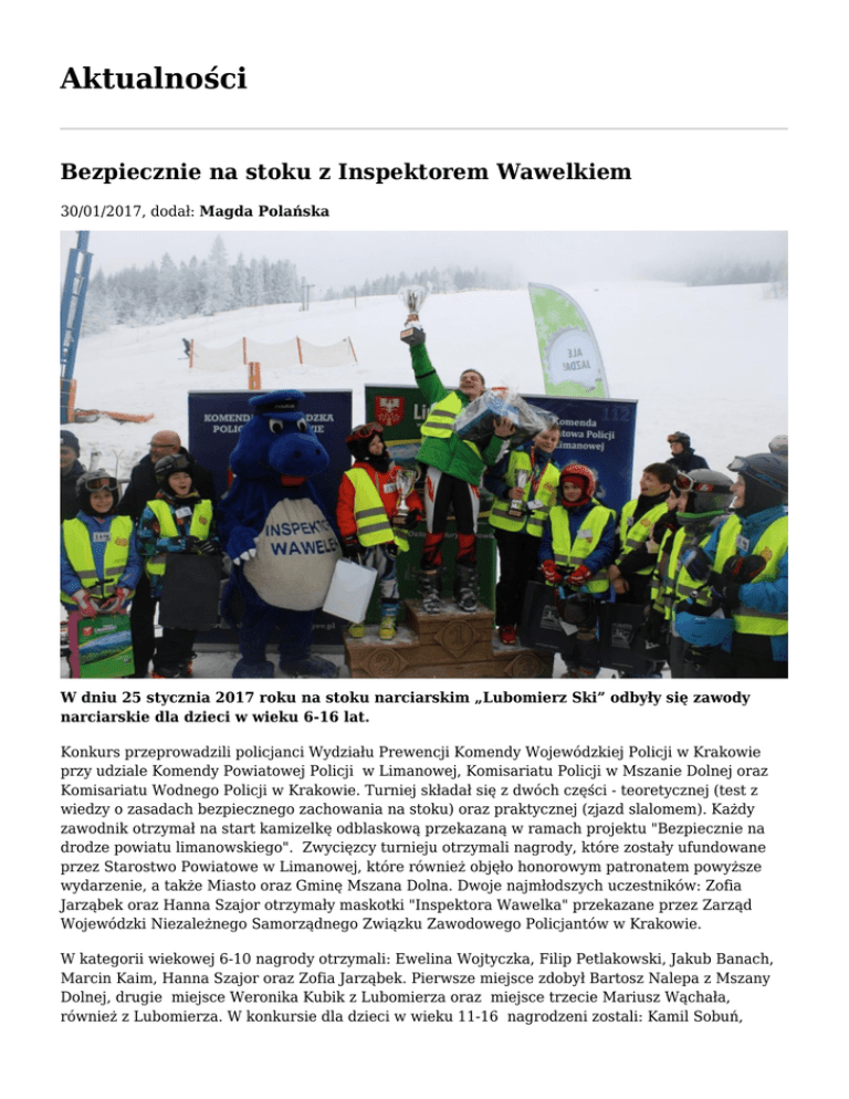 Aktualności Bezpiecznie na stoku z Inspektorem Wawelkiem 30/01/2017, dodał: Magda Polańska W dniu 25 stycznia 2017 roku na stoku narciarskim „Lubomierz Ski” odbyły się zawody narciarskie dla dzieci w wieku 6-16 lat. Konkurs przeprowadzili policjanci Wydziału Prewencji Komendy Wojewódzkiej Policji w Krakowie przy udziale Komendy Powiatowej Policji w Limanowej, Komisariatu Policji w Mszanie Dolnej oraz Komisariatu Wodnego Policji w Krakowie. Turniej składał się z dwóch części - teoretycznej (test z wiedzy o zasadach bezpiecznego zachowania na stoku) oraz praktycznej (zjazd slalomem). Każdy zawodnik otrzymał na start kamizelkę odblaskową przekazaną w ramach projektu "Bezpiecznie na drodze powiatu limanowskiego". Zwycięzcy turnieju otrzymali nagrody, które zostały ufundowane przez Starostwo Powiatowe w Limanowej, które również objęło honorowym patronatem powyższe wydarzenie, a także Miasto oraz Gminę Mszana Dolna. Dwoje najmłodszych uczestników: Zofia Jarząbek oraz Hanna Szajor otrzymały maskotki "Inspektora Wawelka" przekazane przez Zarząd Wojewódzki Niezależnego Samorządnego Związku Zawodowego Policjantów w Krakowie. W kategorii wiekowej 6-10 nagrody otrzymali: Ewelina Wojtyczka, Filip Petlakowski, Jakub Banach, Marcin Kaim, Hanna Szajor oraz Zofia Jarząbek. Pierwsze miejsce zdobył Bartosz Nalepa z Mszany Dolnej, drugie miejsce Weronika Kubik z Lubomierza oraz miejsce trzecie Mariusz Wąchała, również z Lubomierza. W konkursie dla dzieci w wieku 11-16 nagrodzeni zostali: Kamil Sobuń, Zuzanna Kopycińska, Michał Żądło, Małgorzata Sobuń, Albert Rogoziński oraz Sebastian Karpierz. Pierwsze miejsce zdobył Jakub Rogoziński z Mszany Dolnej, drugie miejsce Jan Gocał również z Mszany Dolnej oraz miejsce trzecie Dominik Walczak z Mszany Górnej. Pogoda i frekwencja uczestników akcji „Bezpiecznie na stoku z Inspektorem Wawelkiem” dopisały, atrakcje przygotowane dla dzieci cieszyły się dużym zainteresowaniem. Wszystkie dzieci, które wzięły udział w konkursie otrzymały upominki. Bezpieczne formy aktywnego spędzania wolnego czasu w zimie promował „Inspektor Wawelek”, który towarzyszył dzieciom podczas zawodów. Współorganizatorami imprezy byli: Ośrodek Narciarski „Lubomierz Ski”, Zarząd Wojewódzki NSZZ Policjantów w Krakowie, Bank Spółdzielczy w Mszanie Dolnej, Warta S.A., Europe Direct w Krakowie oraz Wawel. Źródło: limanowa.policja.gov.pl