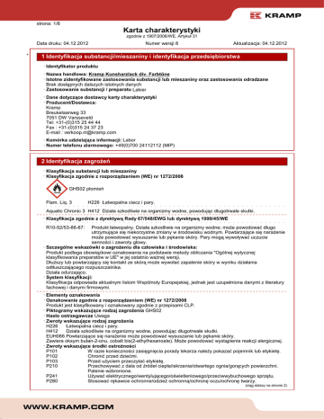 35.0.26 strona: 1/8 Karta charakterystyki zgodnie z 1907/2006/WE, Artykuł 31 Data druku: 04.12.2012 * Numer wersji 8 Aktualizacja: 04.12.2012 1 Identyfikacja substancji/mieszaniny i identyfikacja przedsiębiorstwa · Identyfikator produktu · Nazwa handlowa: Kramp Kunsharzlack div. Farbtöne · Istotne zidentyfikowane zastosowania substancji lub mieszaniny oraz zastosowania odradzane Brak dostępnych dalszych istotnych danych · Zastosowanie substancji / preparatu Lakier · Dane dotyczące dostawcy karty charakterystyki · Producent/Dostawca: Kramp Breukelaarweg 33 7051 DW Varsseveld Tel: +31-(0)315 25 44 44 Fax : +31-(0)315 24 37 23 E-mail : [email protected] · Komórka udzielająca informacji: Labor · Numer telefonu alarmowego: +49(0)700 24112112 (MIP) 2 Identyfikacja zagroŜeń · Klasyfikacja substancji lub mieszaniny · Klasyfikacja zgodnie z rozporządzeniem (WE) nr 1272/2008 GHS02 płomień Flam. Liq. 3 H226 Łatwopalna ciecz i pary. Aquatic Chronic 3 H412 Działa szkodliwie na organizmy wodne, powodując długotrwałe skutki. · Klasyfikacja zgodnie z dyrektywą Rady 67/548/EWG lub dyrektywą 1999/45/WE R10-52/53-66-67: Produkt łatwopalny. Działa szkodliwie na organizmy wodne; moŜe powodować długo utrzymujące się niekorzystne zmiany w środowisku wodnym. Powtarzające się naraŜenie moŜe powodować wysuszanie lub pękanie skóry. Pary mogą wywoływać uczucie senności i zawroty głowy. · Szczególne wskazówki o zagroŜeniu dla człowieka i środowiska: Produkt podlega obowiązkowi oznakowania na podstawie metody obliczania "Ogólnej wytycznej klasyfikowania preparatów w UE" w jej ostatnio waŜnej wersji. DłuŜszy lub powtarzający się kontakt ze skórą moŜe wywołać zapalenie skóry w wyniku działania odtłuszczającego rozpuszczalnika. Działa odurzająco. · System klasyfikacji: Klasyfikacja odpowiada aktualnym listom Wspólnoty Europejskiej, jednak jest uzupełniona danymi z literatury fachowej i danymi firmowymi. · Elementy oznakowania · Oznakowanie zgodnie z rozporządzeniem (WE) nr 1272/2008 Produkt jest klasyfikowany i oznakowany zgodnie z przepisami CLP. · Piktogramy wskazujące rodzaj zagroŜenia GHS02 · Hasło ostrzegawcze Uwaga · Zwroty wskazujące rodzaj zagroŜenia H226 Łatwopalna ciecz i pary. H412 Działa szkodliwie na organizmy wodne, powodując długotrwałe skutki. EUH066 Powtarzające się naraŜenie moŜe powodować wysuszanie lub pękanie skóry. Zawiera oksym butan-2-onu, cobalt bis(2-ethylhexanoate). MoŜe powodować wystąpienie reakcji alergicznej. · Zwroty wskazujące środki ostroŜności P101 W razie konieczności zasięgnięcia porady lekarza naleŜy pokazać pojemnik lub etykietę. P102 Chronić przed dziećmi. P103 Przed uŜyciem przeczytać etykietę. P210 Przechowywać z dala od źródeł ciepła/iskrzenia/otwartego ognia/gorących powierzchni. Palenie wzbronione. P241 UŜywać elektrycznego/wentylującego/oświetleniowego/przeciwwybuchowego sprzętu. P280 Stosować rękawice ochronne/odzieŜ ochronną/ochronę oczu/ochronę twarzy. (ciąg dalszy na stronie 2) 35.0.26 strona: 2/8 Karta charakterystyki zgodnie z 1907/2006/WE, Artykuł 31 Data druku: 04.12.2012 Numer wersji 8 Aktualizacja: 04.12.2012 Nazwa handlowa: Kramp Kunsharzlack div. Farbtöne (ciąg dalszy od strony 1) P240 Uziemić/połączyć pojemnik i sprzęt odbiorczy. P303+P361+P353 W PRZYPADKU KONTATKU ZE SKÓRĄ (lub z włosami): Natychmiast usunąć/zdjąć całą zanieczyszczoną odzieŜ. Spłukać skórę pod strumieniem wody/prysznicem. P501 Zawartość / pojemnik usuwać zgodnie z przepisami miejscowymi / regionalnymi / narodowymi / międzynarodowymi. · Inne zagroŜenia · Wyniki oceny właściwości PBT i vPvB · PBT: Nie nadający się do zastosowania. · vPvB: Nie nadający się do zastosowania. 3 Skład/informacja o składnikach · Charakterystyka chemiczna: Mieszaniny · Opis: Mieszanka z niŜej wymienionych składników z bezpiecznymi domieszkami. · Składniki niebezpieczne: CAS: 64742-82-1 Benzyna cięŜka hydroodsiarczona (ropa naftowa) EINECS: 265-185-4 Xn R65; N R51/53 R10-66-67 Flam. Liq. 3, H226; Asp. Tox. 1, H304; Aquatic Chronic 2, H411; STOT SE 3, H336 CAS: 64742-48-9 Benzyna cięŜka obrabiana wodorem (ropa naftowa) EINECS: 265-150-3 Xn R65 R10-66-67 Flam. Liq. 3, H226; Asp. Tox. 1, H304; STOT SE 3, H336 CAS: 1330-20-7 ksylen EINECS: 215-535-7 Xn R20/21; Xi R38 R10 Flam. Liq. 3, H226; Acute Tox. 4, H312; Acute Tox. 4, H332; Skin Irrit. 2, H315 CAS: 108-65-6 octan 2-metoksy-1-metyloetylu EINECS: 203-603-9 R10 Flam. Liq. 3, H226 CAS: 64742-48-9 Benzyna cięŜka obrabiana wodorem (ropa naftowa) EINECS: 265-150-3 Xn R65 R66 Asp. Tox. 1, H304 CAS: 64742-95-6 Solwent nafta (ropa naftowa), węglowodory lekkie aromatyczne EINECS: 265-199-0 Xn R65; Xi R37; N R51/53 R10-66-67 Flam. Liq. 3, H226; Asp. Tox. 1, H304; Aquatic Chronic 2, H411; STOT SE 3, H335+H336 CAS: 136-52-7 cobalt bis(2-ethylhexanoate) EINECS: 205-250-6 Xi R43; N R50/53 Aquatic Acute 1, H400; Aquatic Chronic 1, H410; Skin Sens. 1, H317 CAS: 96-29-7 oksym butan-2-onu EINECS: 202-496-6 Xn R21-40; Xi R41; Xi R43 Rakotw. Kat. 3 Carc. 2, H351; Eye Dam. 1, H318; Acute Tox. 4, H312; Skin Sens. 1, H317 · Wskazówki dodatkowe: Pełna treść przytoczonych wskazówek dotyczących zagroŜeń znajduje się w rozdziale 16. ≤ 20,0% 10-25% 2,5-10% 2,5-10% 2,5-10% ≤ 2,5% <1,0% <1,0% 4 Środki pierwszej pomocy · Opis środków pierwszej pomocy · Po wdychaniu: Dostarczyć świeŜe powietrze, w razie dolegliwości wezwać lekarza. · Po styczności ze skórą: Ogólnie produkt nie działa draŜniąco na skórę. · Po styczności z okiem: Płukać oczy z otwartą powieką przez kilka minut pod bieŜącą wodą. (ciąg dalszy na stronie 3) 35.0.26 strona: 3/8 Karta charakterystyki zgodnie z 1907/2006/WE, Artykuł 31 Data druku: 04.12.2012 Numer wersji 8 Aktualizacja: 04.12.2012 Nazwa handlowa: Kramp Kunsharzlack div. Farbtöne (ciąg dalszy od strony 2) · Po przełknięciu: Przy trwałych