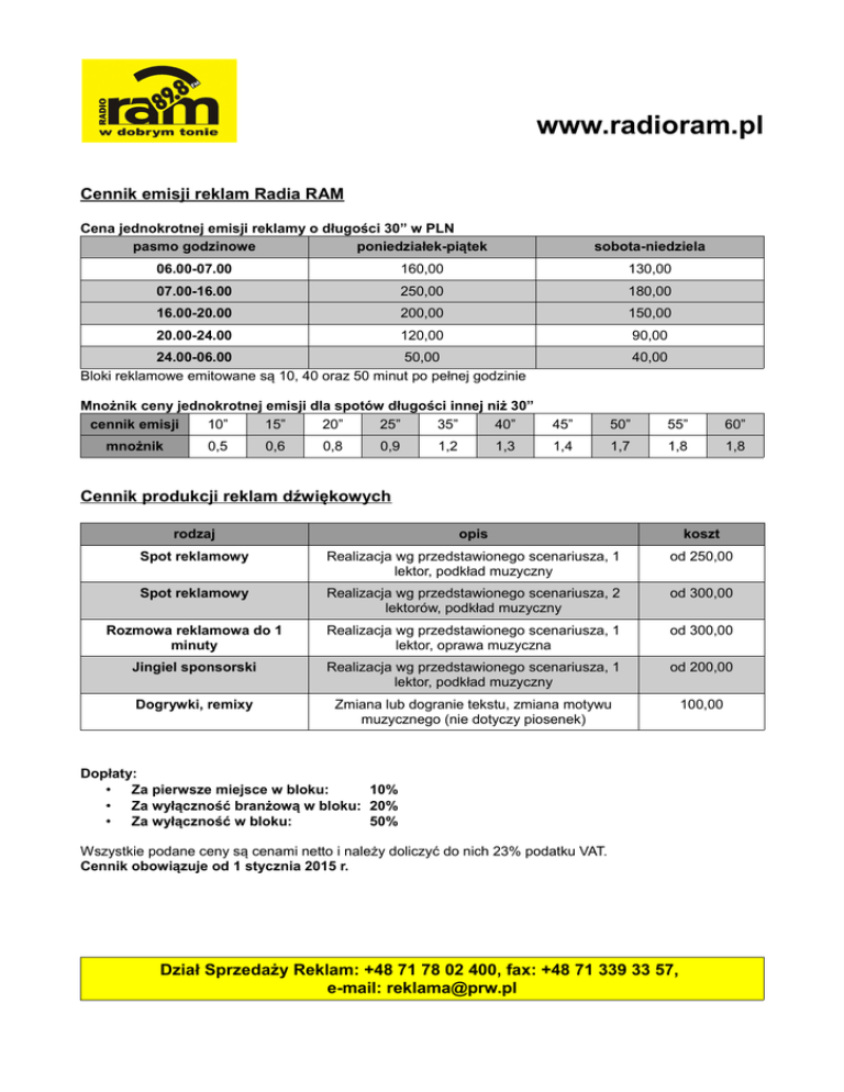 www.radioram.pl Cennik emisji reklam Radia RAM Cena jednokrotnej emisji reklamy o długości 30” w PLN pasmo godzinowe poniedziałek-piątek sobota-niedziela 06.00-07.00 160,00 130,00 07.00-16.00 250,00 180,00 16.00-20.00 200,00 150,00 20.00-24.00 120,00 90,00 24.00-06.00 50,00 Bloki reklamowe emitowane są 10, 40 oraz 50 minut po pełnej godzinie Mnożnik ceny jednokrotnej emisji dla spotów długości innej niż 30” cennik emisji 10” 15” 20” 25” 35” 40” mnożnik 0,5 0,6 0,8 0,9 1,2 1,3 40,00 45” 50” 55” 60” 1,4 1,7 1,8 1,8 Cennik produkcji reklam dźwiękowych rodzaj opis koszt Spot reklamowy Realizacja wg przedstawionego scenariusza, 1 lektor, podkład muzyczny od 250,00 Spot reklamowy Realizacja wg przedstawionego scenariusza, 2 lektorów, podkład muzyczny od 300,00 Rozmowa reklamowa do 1 minuty Realizacja wg przedstawionego scenariusza, 1 lektor, oprawa muzyczna od 300,00 Jingiel sponsorski Realizacja wg przedstawionego scenariusza, 1 lektor, podkład muzyczny od 200,00 Dogrywki, remixy Zmiana lub dogranie tekstu, zmiana motywu muzycznego (nie dotyczy piosenek) 100,00 Dopłaty: • Za pierwsze miejsce w bloku: 10% • Za wyłączność branżową w bloku: 20% • Za wyłączność w bloku: 50% Wszystkie podane ceny są cenami netto i należy doliczyć do nich 23% podatku VAT. Cennik obowiązuje od 1 stycznia 2015 r. Dział Sprzedaży Reklam: +48 71 78 02 400, fax: +48 71 339 33 57, e-mail: [email protected]