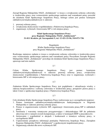 Zarząd Regionu Małopolska NSZZ „Solidarność’ w trosce o zwiększenie ochrony człowieka w środowisku pracy oraz wzmocnienie społecznego nadzoru nad warunkami pracy powołał do działania Klub Społecznego Inspektora Pracy, którego celem jest pomoc komisjom zakładowym/międzyzakładowym w zakresie: 1. prawnej ochrony pracy, 2. zwiększenia skuteczności współdziałania z Państwową Inspekcja Pracy, 3. organizacji, wyborach i kierowaniu SIP w ich miejscu pracy. Klub Społecznego Inspektora Pracy przy Regionie Małopolska NSZZ „Solidarność” 31-011 Kraków, pl. Szczepański 5, tel. 12 421-33-96, 510 073-730. Regulamin Klubu Społecznego Inspektora Pracy przy Regionie Małopolska NSZZ „Solidarność” Realizując statutowe zadania w trosce o zwiększenie ochrony człowieka w środowisku pracy oraz wzmocnienie społecznego nadzoru nad warunkami pracy Prezydium Zarządu Regionu Małopolska NSZZ „Solidarność” powołuje do działania Klub Społecznego Inspektora Pracy i sprawuje nad nim nadzór. §1 Celem Klubu Społecznego Inspektora Pracy jest pomoc komisjom zakładowym/międzyzakładowym w zakresie: prawnej ochrony pracy, zwiększenia skuteczności współdziałania z Państwową Inspekcja Pracy oraz w organizacji, wyborach i kierowaniu SIP w ich miejscu pracy. §2 Zadaniem Klubu Społecznego Inspektora Pracy jest pogłębianie i aktualizacja wiedzy z zakresu bezpieczeństwa i ochrony człowieka w środowisku pracy, przepisów prawa pracy a także Ustaw o społecznej inspekcji pracy i Państwowej Inspekcji Pracy. §3 Cele działania Klubu Społecznego Inspektora Pracy realizowane są w szczególności poprzez: 1. Pomoc komisjom zakładowym/międzyzakładowym funkcjonującym w Regionie Małopolska w zakresie prawnej ochrony pracy. 2. Pomoc w organizowaniu wyborów SIP, organizacji i kierowaniu pracą SIP w zakładach pracy. 3. Seminaria i warsztaty tematyczne przygotowujące i dokształcające SIP do pełnienia aktywnej roli w ramach swoich kompetencji, a także w komisjach BHP u pracodawców. 4. Inicjowanie i współudział w akcjach i konkursach o tematyce ochrony pracy, w szczególności BHP. 5. Usprawnienie przepływu informacji pomiędzy Państwową Inspekcja Pracy, Zarządem Regionu Małopolska NSZZ „Solidarność” a społecznymi inspektorami pracy. 6. Organizację szkoleń dla nowo wybranych SIP. §4 1. Członkiem Klubu po złożeniu deklaracji może zostać: a. osoba pełniąca funkcję SIP po wyrażeniu zgody przez komisję zakładową/międzyzakładową NSZZ „Solidarność”, b. regionalny koordynator ds. BHP Zarządu Regionu staje się automatycznie członkiem Klubu. 2. Członek Rady Klubu, który utracił mandat SIP automatycznie traci prawo uczestnictwa w Klubie. §5 1. 2. 3. 4. 5. Członkowie Klubu wybierają spośród siebie Radę Klubu w liczbie 3-5 osób. Przewodniczącym Rady Klubu jest regionalny koordynator ZRM ds. BHP. Kadencja Klubu trwa 2 lata. Zadaniem Rady jest ustalanie programu i harmonogramu działania Klubu. Organizacją prac Klubu i przygotowaniem szkoleń kieruje Przewodniczący w uzgodnieniu z Zastępcą przewodniczącego ds. informacji, promocji, szkoleń i branż. 6. Przewodniczący Klubu podlega Zastępcy przewodniczącego ds. informacji, promocji, szkoleń i branż. 7. Szkolenia odbywają się nie rzadziej niż raz na kwartał według harmonogramu. Rok szkoleniowy pokrywa się z rokiem szkolnym. §6 Terenem działania Klubu jest Region Małopolska NSZZ „Solidarność”. §7 Zmiany do Regulaminu wprowadza Prezydium ZRM NSZZ „Solidarność”. §8 Prezydium ZRM zatwierdza regulamin w formie uchwały, Regulamin stanowi załącznik Uchwały.