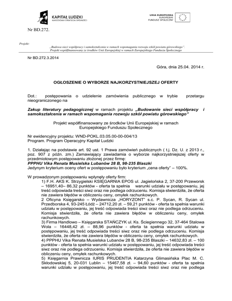 Nr BD.272. Projekt: „Budowa sieci współpracy i samokształcenia w ramach wspomagania rozwoju szkół powiatu górowskiego”. Projekt współfinansowany ze środków Unii Europejskiej w ramach Europejskiego Funduszu Społecznego Nr BD.272.3.2014 Góra, dnia 25.04. 2014 r. OGŁOSZENIE O WYBORZE NAJKORZYSTNIEJSZEJ OFERTY Dot.: postępowania o udzielenie zamówienia publicznego w trybie nieograniczonego na przetargu Zakup literatury pedagogicznej w ramach projektu „Budowanie sieci współpracy samokształcenia w ramach wspomagania rozwoju szkół powiatu górowskiego” i Projekt współfinansowany ze środków Unii Europejskiej w ramach Europejskiego Funduszu Społecznego Nr ewidencyjny projektu: WND-POKL.03.05.00-00-004/13 Program. Program Operacyjny Kapitał Ludzki 1. Działając na podstawie art. 92 ust. 1 Prawa zamówień publicznych ( t.j. Dz. U. z 2013 r., poz. 907 z póżn. zm.) Zamawiający zawiadamia o wyborze najkorzystniejszej oferty w przedmiotowym postępowaniu złożonej przez firmę: PPPHU Vika Renata Musielska Lubanów 28 B, 98-235 Blaszki Jedynym kryterium oceny ofert w postępowaniu było kryterium „cena oferty” – 100%. W prowadzonym postępowaniu wpłynęły oferty firm: 1) F.H. AKS K. Strzygielski KSIĘGARNIA EPOS ul. Jagielońska 2, 37-200 Przeworsk – 16951,40– 86,32 punktów - oferta ta spełnia warunki udziału w postępowaniu, jej treść odpowiada treści siwz oraz nie podlega odrzuceniu. Komisja stwierdziła, że oferta nie zawiera błędów w obliczeniu ceny, omyłek rachunkowych. 2 Oficyna Księgarsko – Wydawnicza „HORYZONT” s.c. P. Sycan, R. Sycan ul. Przedborska 4, 93-245 Łódź – 24712,20 zł. – 59,21 punktów - oferta ta spełnia warunki udziału w postępowaniu, jej treść odpowiada treści siwz oraz nie podlega odrzuceniu. Komisja stwierdziła, że oferta nie zawiera błędów w obliczeniu ceny, omyłek rachunkowych. 3) Firma Handlowo – Księgarska STAŃCZYK ul. Ks. Ściegiennego 32, 37-464 Stalowa Wola – 16448,42 zł. – 88,96 punktów - oferta ta spełnia warunki udziału w postępowaniu, jej treść odpowiada treści siwz oraz nie podlega odrzuceniu. Komisja stwierdziła, że oferta nie zawiera błędów w obliczeniu ceny, omyłek rachunkowych. 4) PPPHU Vika Renata Musielska Lubanów 28 B, 98-235 Blaszki – 14632,83 zł. – 100 punktów - oferta ta spełnia warunki udziału w postępowaniu, jej treść odpowiada treści siwz oraz nie podlega odrzuceniu. Komisja stwierdziła, że oferta nie zawiera błędów w obliczeniu ceny, omyłek rachunkowych. 5) Księgarnia Prawnicza IURIS PRUDENTIA Katarzyna Glimasińska Plac M. C. Skłodowskiej 5, 20-031 Lublin – 15467,58 zł. – 94,60 punktów - oferta ta spełnia warunki udziału w postępowaniu, jej treść odpowiada treści siwz oraz nie podlega Nr BD.272. Projekt: „Budowa sieci współpracy i samokształcenia w ramach wspomagania rozwoju szkół powiatu górowskiego”. Projekt współfinansowany ze środków Unii Europejskiej w ramach Europejskiego Funduszu Społecznego Nr BD.272.3.2014 odrzuceniu. Komisja stwierdziła, że oferta nie zawiera błędów w obliczeniu ceny, omyłek rachunkowych. 6) POLANGLO Sp. z o.o. ul. Szyszkowa 20, 02-285 Warszawa KSIĘGARNIA ul. Boh. Getta 3, 15-450 Białystok – 16500,00 zł. – 88,68 punktów - oferta ta spełnia warunki udziału w postępowaniu, jej treść odpowiada treści siwz oraz nie podlega odrzuceniu. Komisja stwierdziła, że oferta nie zawiera błędów w obliczeniu ceny, omyłek rachunkowych. Podstawą prawną dokonanego wyboru jest art. 91 ust. 1 ustawy z dnia 29 stycznia 2004 roku Prawo zamówień publicznych ( t.j. Dz. U. z 2013 r., poz. 907 z póżn. zm.) oraz kodeks cywilny. 2. Działając na podstawie art. 92 ust. 1 pkt. 2) Prawa zamówień publicznych Zamawiający informuje, że w prowadzonym postępowaniu nie zostały odrzucone żadne oferty. 3. Działając na podstawie art. 92 ust. 1 pkt. 3) Prawa zamówień publicznych Zamawiający informuje, że w prowadzonym postępowaniu nie zostali wykluczeni żadni wykonawcy. 4. Działając na podstawie art. 92 ust. 1 pkt. 4) Prawa zamówień publicznych Zamawiający informuje, że podpisanie umowy z wyłonionym wykonawcą możliwe będzie w terminie, określonym zgodnie z art. 94 ust. 2, po którego upływie umowa w sprawie zamówienia publicznego może być zawarta Środki ochrony prawnej Informacje dotyczące środków ochrony prawnej znajdują się Specyfikacji istotnych warunków zamówienia oraz w Dziale VI Prawa zamówień publicznych „Środki ochrony prawnej", art. od 179 do 198g ( t.j. Dz. U. z 2013 r., poz. 907 z póżn. zm.)