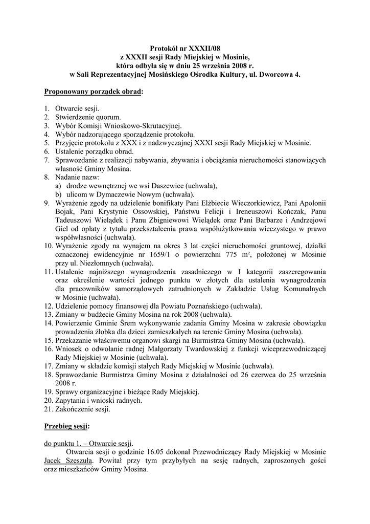 Protokół nr XXXII/08 z XXXII sesji Rady Miejskiej w Mosinie, która odbyła się w dniu 25 września 2008 r. w Sali Reprezentacyjnej Mosińskiego Ośrodka Kultury, ul. Dworcowa 4. Proponowany porządek obrad: 1. 2. 3. 4. 5. 6. 7. Otwarcie sesji. Stwierdzenie quorum. Wybór Komisji Wnioskowo-Skrutacyjnej. Wybór nadzorującego sporządzenie protokołu. Przyjęcie protokołu z XXX i z nadzwyczajnej XXXI sesji Rady Miejskiej w Mosinie. Ustalenie porządku obrad. Sprawozdanie z realizacji nabywania, zbywania i obciążania nieruchomości stanowiących własność Gminy Mosina. 8. Nadanie nazw: a) drodze wewnętrznej we wsi Daszewice (uchwała), b) ulicom w Dymaczewie Nowym (uchwała). 9. Wyrażenie zgody na udzielenie bonifikaty Pani Elżbiecie Wieczorkiewicz, Pani Apolonii Bojak, Pani Krystynie Ossowskiej, Państwu Felicji i Ireneuszowi Kończak, Panu Tadeuszowi Wielądek i Panu Zbigniewowi Wielądek oraz Pani Barbarze i Andrzejowi Giel od opłaty z tytułu przekształcenia prawa współużytkowania wieczystego w prawo współwłasności (uchwała). 10. Wyrażenie zgody na wynajem na okres 3 lat części nieruchomości gruntowej, działki oznaczonej ewidencyjnie nr 1659/1 o powierzchni 775 m², położonej w Mosinie przy ul. Niezłomnych (uchwała). 11. Ustalenie najniższego wynagrodzenia zasadniczego w I kategorii zaszeregowania oraz określenie wartości jednego punktu w złotych dla ustalenia wynagrodzenia dla pracowników samorządowych zatrudnionych w Zakładzie Usług Komunalnych w Mosinie (uchwała). 12. Udzielenie pomocy finansowej dla Powiatu Poznańskiego (uchwała). 13. Zmiany w budżecie Gminy Mosina na rok 2008 (uchwała). 14. Powierzenie Gminie Śrem wykonywanie zadania Gminy Mosina w zakresie obowiązku prowadzenia żłobka dla dzieci zamieszkałych na terenie Gminy Mosina (uchwała). 15. Przekazanie właściwemu organowi skargi na Burmistrza Gminy Mosina (uchwała). 16. Wniosek o odwołanie radnej Małgorzaty Twardowskiej z funkcji wiceprzewodniczącej Rady Miejskiej w Mosinie (uchwała). 17. Zmiany w składzie komisji stałych Rady Miejskiej w Mosinie (uchwała). 18. Sprawozdanie Burmistrza Gminy Mosina z działalności od 26 czerwca do 25 września 2008 r. 19. Sprawy organizacyjne i bieżące Rady Miejskiej. 20. Zapytania i wnioski radnych. 21. Zakończenie sesji. Przebieg sesji: do punktu 1. – Otwarcie sesji. Otwarcia sesji o godzinie 16.05 dokonał Przewodniczący Rady Miejskiej w Mosinie Jacek Szeszuła. Powitał przy tym przybyłych na sesję radnych, zaproszonych gości oraz mieszkańców Gminy Mosina. 2 Prowadzący obrady Jacek Szeszuła w imieniu Rady Miejskiej w Mosinie złożył na ręce Aleksandry Pruchniewskiej podziękowanie za wieloletnią pracę na stanowisku dyrektora Mosińskiej Biblioteki Publicznej. Wraz ze swoimi zastępcami Barbarą Czaińską i Małgorzatą Twardowską wręczył Aleksandrze Pruchniewskiej pamiątkowy upominek oraz kwiaty. Aleksandra Pruchniewska podziękowała Radzie Miejskiej w Mosinie za jej uroczyste pożegnanie. do punktu 2. – Stwierdzenie quorum. Przewodniczący obrad Jacek Szeszuła na podstawie listy obecności stwierdził, że w XXXII sesji Rady Miejskiej w Mosinie bierze udział 21 radnych, co stanowi 100% ogólnego stanu osobowego Rady Miejskiej. Lista obecności radnych stanowi załącznik niniejszego protokołu. Na sesję zostali zaproszeni goście, których lista również jest załącznikiem niniejszego protokołu. do punktu 3. – Wybór Komisji Wnioskowo-Skrutacyjnej. Prowadzący obrady Jacek Szeszuła zaproponował, aby w skład Komisji Wnioskowo-Skrutacyjnej weszli radni: Paweł Przybył i Waldemar Waligórski. Radny Paweł Przybył i radny Waldemar Waligórski wyrazili zgodę na kandydowanie. Przewodniczący obrad Jacek Szeszuła zwrócił uwagę, iż ze względu na dzisiejsze procedury, Komisja Wnioskowo-Skrutacyjna powinna liczyć 3 osoby. W związku z powyższym, poprosił o podanie kolejnej kandydatury. Radny Jan Marciniak zaproponował, aby w skład Komisji Wnioskowo-Skrutacyjnej wszedł radny Kordian Kleiber. Radny Kordian Kleiber wyraził zgodę na kandydowanie. W wyniku przeprowadzonego w powyższej sprawie głosowania, Rada Miejska w Mosinie 18 głosami „za”, przy 3 głosach „wstrzymujących się”, wybrała radnego Pawła Przybyła, radnego Waldemara Waligórskiego oraz radnego Kordiana Kleibra do pełnienia funkcji Komisji Wnioskowo-Skrutacyjnej. do punktu 4. – Wybór nadzorującego sporządzenie protokołu. Prowadzący obrady Jacek Szeszuła zaproponował, aby nadzór nad sporządzeniem protokołu z XXXII sesji Rady Miejskiej w Mosinie sprawował radny Marek Klemens. Radny Marek Klemens wyraził zgodę na powyższą propozycję. W związku z tym, że nie zostały zgłoszone inne kandydatury, przewodniczący obrad Jacek Szeszuła poddał pod głosowanie kandydaturę radnego Marka Klemensa na nadzorującego sporządzenie protokołu z XXXII sesji Rady Miejskiej w Mosinie. W jego wyniku Rada Miejska w Mosinie 20 głosami „za” przy 1 głosie „wstrzymującym się”, wybrała radnego Marka Klemensa do nadzorowania sporządzenia protokołu z XXXII sesji Rady Miejskiej w Mosinie. do punktu 5. – Przyjęcie protokołu z XXX i z nadzwyczajnej XXXI sesji Rady Miejskiej w Mosinie. Prowadzący obrady Jacek Szeszuła przypomniał, że radnym nadzorującym sporządzenie protokołu z XXX sesji Rady Miejskiej w Mosinie, był radny Leszek Dymalski. Radny Leszek Dymalski oświadczył, iż nie zgłasza uwag do protokołu z wyżej wymienionej sesji Rady Miejskiej w Mosinie. W związku z tym, że radni nie zgłosili żadnych pytań, uwag i wniosków, przewodniczący obrad Jacek Szeszuła zaproponował, aby protokół z XXX sesji Rady Miejskiej w Mosinie 3 przyjąć bez czytania i poddał pod głosowanie powyższy wniosek. W jego wyniku Rada Miejska w Mosinie przyjęła go jednogłośnie, czyli 21 głosami „za”. Prowadzący obrady Jacek Szeszuła przypomniał, że radną nadzorującą sporządzenie pr
