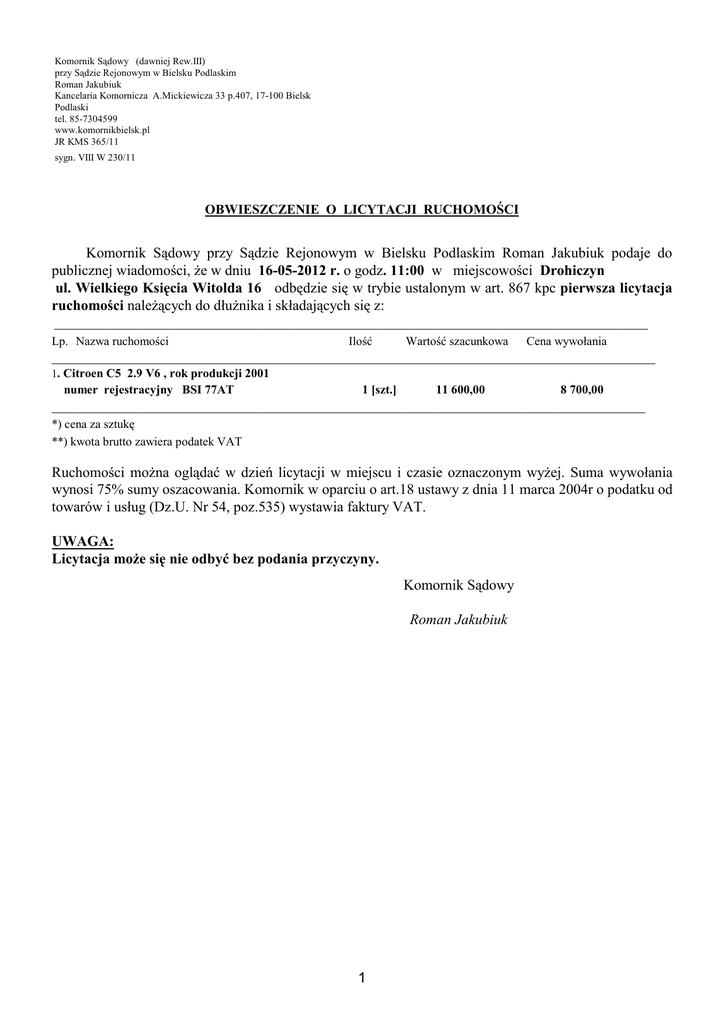 Komornik Sądowy (dawniej Rew.III) przy Sądzie Rejonowym w Bielsku Podlaskim Roman Jakubiuk Kancelaria Komornicza A.Mickiewicza 33 p.407, 17-100 Bielsk Podlaski tel. 85-7304599 www.komornikbielsk.pl JR KMS 365/11 sygn. VIII W 230/11 OBWIESZCZENIE O LICYTACJI RUCHOMOŚCI Komornik Sądowy przy Sądzie Rejonowym w Bielsku Podlaskim Roman Jakubiuk podaje do publicznej wiadomości, że w dniu 16-05-2012 r. o godz. 11:00 w miejscowości Drohiczyn ul. Wielkiego Księcia Witolda 16 odbędzie się w trybie ustalonym w art. 867 kpc pierwsza licytacja ruchomości należących do dłużnika i składających się z: _______________________________________________________________________________________________________________________ Lp. Nazwa ruchomości Ilość Wartość szacunkowa Cena wywołania _________________________________________________________________________________________________________________________ 1. Citroen C5 2.9 V6 , rok produkcji 2001 numer rejestracyjny BSI 77AT 1 [szt.] 11 600,00 8 700,00 _______________________________________________________________________________________________________________________ *) cena za sztukę **) kwota brutto zawiera podatek VAT Ruchomości można oglądać w dzień licytacji w miejscu i czasie oznaczonym wyżej. Suma wywołania wynosi 75% sumy oszacowania. Komornik w oparciu o art.18 ustawy z dnia 11 marca 2004r o podatku od towarów i usług (Dz.U. Nr 54, poz.535) wystawia faktury VAT. UWAGA: Licytacja może się nie odbyć bez podania przyczyny. Komornik Sądowy Roman Jakubiuk 1
