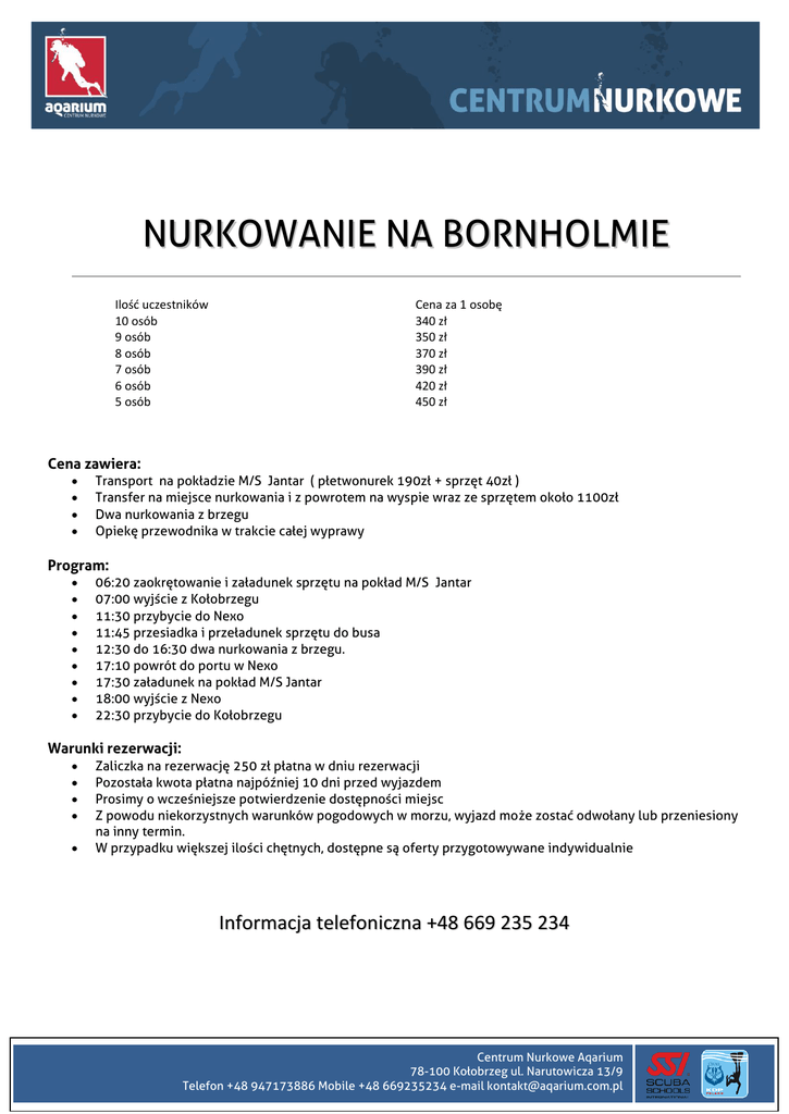 NURKOWANIE NA BORNHOLMIE Ilość uczestników 10 osób 9 osób 8 osób 7 osób 6 osób 5 osób Cena za 1 osobę 340 zł 350 zł 370 zł 390 zł 420 zł 450 zł Cena zawiera: Transport na pokładzie M/S Jantar ( płetwonurek 190zł + sprzęt 40zł ) Transfer na miejsce nurkowania i z powrotem na wyspie wraz ze sprzętem około 1100zł Dwa nurkowania z brzegu Opiekę przewodnika w trakcie całej wyprawy Program: 06:20 zaokrętowanie i załadunek sprzętu na pokład M/S Jantar 07:00 wyjście z Kołobrzegu 11:30 przybycie do Nexo 11:45 przesiadka i przeładunek sprzętu do busa 12:30 do 16:30 dwa nurkowania z brzegu. 17:10 powrót do portu w Nexo 17:30 załadunek na pokład M/S Jantar 18:00 wyjście z Nexo 22:30 przybycie do Kołobrzegu Warunki rezerwacji: Zaliczka na rezerwację 250 zł płatna w dniu rezerwacji Pozostała kwota płatna najpóźniej 10 dni przed wyjazdem Prosimy o wcześniejsze potwierdzenie dostępności miejsc Z powodu niekorzystnych warunków pogodowych w morzu, wyjazd może zostać odwołany lub przeniesiony na inny termin. W przypadku większej ilości chętnych, dostępne są oferty przygotowywane indywidualnie Informacja telefoniczna +48 669 235 234 Centrum Nurkowe Aqarium 78-100 Kołobrzeg ul. Narutowicza 13/9 Telefon +48 947173886 Mobile +48 669235234 e-mail [email protected]