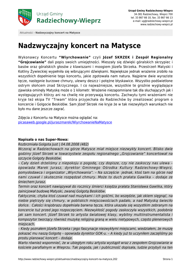 Urząd Gminy Radziechowy-Wieprz 34-381 Radziechowy, Wieprz 700 tel. 33 867 66 10, fax. 33 867 66 13 e-mail: [email protected] www.radziechowy-wieprz.pl Aktualności › Nadzwyczajny koncert na Matysce Nadzwyczajny koncert na Matysce Wykonawcy Koncertu “Wiyrchowanie” czyli Józef SKRZEK i Zespół Regionalny “Grojcowianie” dali popis swoich umiejętności. Mieszały się dźwięki góralskich skrzypiec i basów oraz góralskich głosów z klawiszami i moogiem Józefa Skrzeka. Przestrzeń Matyski i Kotliny Żywieckiej wypełniła się wibrującymi dźwiękami. Największe jednak wrażenie zrobiło na wszystkich dopełnienie tego koncertu, jakie zgotowała nam natura. Najpierw dwie wyraziste tęcze, następnie burzowe chmury, ulewny deszcz i potężne błyskawice. Wszystko podświetlone ostrym słońcem znad Skrzycznego. I co najważniejsze, wszystkie te groźnie wyglądające zjawiska ominęły Matyskę może o 1 kilometr. Wrażenie niezapomniane tak dla słuchających jak i występujących którzy ani na chwilę nie przerywają koncertu. Zachwytu tymi wrażeniami nie kryje też ekipa TV “Trwam” która przyjechała do Radziechów by zrealizować program o koncercie i Golgocie Beskidów. Sam Józef Skrzek nie kryje że w tak niezwykłych warunkach nie było mu dane jeszcze zagrać. Zdjęcia z Koncertu na Matysce można oglądać na: picasaweb.google.pl/juraszmarek/WiyrchowanieNaMatysce Napisała o nas Super-Nowa: Rozbrzmiała Golgota Just | 04.08.2008 (482) Wczoraj w Radziechowach na górze Matysce miał miejsce niezwykły koncert. Blisko dwie godziny Józef Skrzek w towarzystwie zespołu regionalnego „Grojcowianie” koncertował na szczycie Golgoty Beskidów. – Cały dzień drżeliśmy z niepokoju o pogodę, czy dopisze, czy nie zaskoczy nas ulewa – opowiada Marek Jurasz, dyrektor Gminnego Ośrodka Kultury Radziechowy-Wieprz, pomysłodawca i organizator „Wiyrchowania”. – Na szczęście jednak, ktoś tam na górze nad nami czuwał i skutecznie rozpędzał chmury. Może to duch prałata Gawlika – dodaje ze śmiechem Jurasz. Termin oraz koncert nawiązywał do rocznicy śmierci księdza prałata Stanisława Gawlika, który zainicjował budowę Matyski, zwanej Golgotą Beskidów. Faktycznie, chyba ktoś czuwał nad muzykami i ich gośćmi, bo wszędzie, jak okiem sięgnąć, na niebie piętrzyły się chmury, w pobliskich miejscowościach padało, a nad Matyską świeciło słońce. Całości krajobrazu dopełniała barwna tęcza, która ukazała się wszystkim zebranym na koncercie tuż przed jego rozpoczęciem. Niezwykłość pogody zaskoczyła wszystkich, podobnie jak sam koncert. Józef Skrzek to artysta światowej klasy, wybitny multiinstrumentalista i kompozytor tworzący również muzykę religijną graną w wielu nietypowych, często plenerowych miejscach. – Kiedy poznałem Józefa Skrzeka i jego fascynacje niezwykłymi miejscami, wiedziałem, że muszę pokazać mu naszą Golgotę – opowiada dyrektor GOK-u. – A kiedy już to uczyniłem zaczęliśmy po prostu planować koncert – dodaje. Warto również wspomnieć, że w ubiegłym roku artysta wystąpił wraz z zespołem Grojcowianie w kościele parafialnym w Wieprzu. Tak pogoda, jak i publiczność dopisała, ludzie przybyli na ten http://www.radziechowy-wieprz.pl/aktualnosci/nadzwyczajny-koncert-na-matysce,202 Strona 1 Urząd Gminy Radziechowy-Wieprz 34-381 Radziechowy, Wieprz 700 tel. 33 867 66 10, fax. 33 867 66 13 e-mail: [email protected] www.radziechowy-wieprz.pl Aktualności › Nadzwyczajny koncert na Matysce niezwykły koncert nie tylko z pobliskiej okolicy, ale także z odległych miejscowości. Dwugodzinny koncert okazał się wspaniałym pomysłem, który wywarł wielkie wrażenie na publiczności. Niezwykłość miejsca Golgoty Beskidów w połączeniu z poruszającą muzyką Skrzeka i góralską nutą Grojcowian dały niesamowity, godny podziwu efekt. źródło: www.super-nowa.pl/art.php http://www.radziechowy-wieprz.pl/aktualnosci/nadzwyczajny-koncert-na-matysce,202 Strona 2