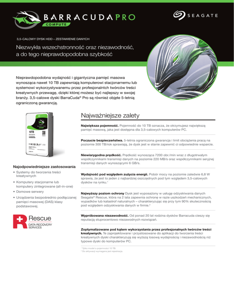 3,5-CALOWY DYSK HDD – ZESTAWIENIE DANYCH Niezwykła wszechstronność oraz niezawodność, a do tego nieprawdopodobna szybkość Nieprawdopodobna wydajność i gigantyczna pamięć masowa wynosząca nawet 10 TB zapewniają komputerowi stacjonarnemu lub systemowi wykorzystywanemu przez profesjonalntch twórców treści kreatywnych przewagę, dzięki której możesz być najlepszy w swojej branży. 3,5-calowe dyski BarraCuda® Pro są również objęte 5-letnią ograniczoną gwarancją. Najważniejsze zalety Największa pojemność. Pojemność do 10 TB oznacza, że otrzymujesz największą pamięć masową, jaka jest dostępna dla 3,5-calowych komputerów PC. Poczucie bezpieczeństwa. 5-letnia ograniczona gwarancja i limit obciążenia pracą na poziomie 300 TB/rok sprawiają, że dysk jest w stanie zapewnić ci odpowiednie wsparcie. Najodpowiedniejsze zastosowania • Systemy do tworzenia treści kreatywnych • Komputery stacjonarne lub komputery zintegrowane (all-in-one) • Domowe serwery Niewiarygodna prędkość. Prędkość wynosząca 7200 obr./min wraz z długotrwałym współczynnikami transmisji danych na poziomie 220 MB/s oraz współczynnikami seryjnej transmisji danych wynoszącymi 6 GB/s. Wydajność pod względem zużycia energii. Pobór mocy na poziomie zaledwie 6,8 W sprawia, że jest to jeden z najbardziej oszczędnych pod tym względem 3,5-calowych dysków na rynku.1 Najwyższy poziom ochrony Dysk jest wyposażony w usługę odzyskiwania danych • Urządzenia bezpośrednio podłączanej Seagate® Rescue, która na 2 lata zapewnia ochronę w razie uszkodzeń mechanicznych, wypadków lub katastrof naturalnych – charakteryzując się przy tym 90% skutecznością pamięci masowej (DAS) klasy pod względem odzyskiwania danych w firmie.2 podstawowej. Wypróbowana niezawodność. Od ponad 20 lat rodzina dysków Barracuda cieszy się reputacją stuprocentowo niezawodnych rozwiązań. Zoptymalizowane pod kątem wykorzystania przez profesjonalnych twórców treści kreatywnych. Te zaprojektowane i przystosowane do aplikacji do tworzenia treści kreatywnych dyski charakteryzują się wyższą losową wydajnością i niezawodnością niż typowe dyski do komputerów PC. 1 2 Tylko model o pojemności 10 TB. Do aktywacji wymagana jest rejestracja. Parametry 10 TB1 Numer modelu standardowego Liczba bajtów na sektor 8 TB81TB1 6 TB1 4 TB1 2 TB1 ST10000DM0004 ST8000DM005 ST8000DM0004 ST6000DM004 ST4000DM006 ST2000DM009 512 512 512 512 512 512 SATA 6 Gb/s SATA 6 Gb/s SATA 6 Gb/s SATA 6 Gb/s SATA 6 Gb/s SATA 6 Gb/s 6,0/3,0/1,5 6,0/3,0/1,5 6,0/3,0/1,5 6,0/3,0/1,5 6,0/3,0/1,5 6,0/3,0/1,5 220 220 220 220 220 195 256 256 256 256 128 128 Wydajność Interfejs Obsługiwane prędkości transferu danych SATA (Gb/s) Maksymalna średnia szybkość transferu (śr. zewn.) w MB/s Pamięć podręczna, wielosegmentowa (MB) Niezawodność/spójność danych Cykle parkowania/startu głowicy Nieodwracalne błędy odczytu na odczytane bity, maksymalnie Godziny pracy (rocznie) 300 000 300 000 300 000 300 000 300 000 300 000 1 na 10E15 1 na 10E15 1 na 10E15 1 na 10E15 1 na 10E15 1 na 10E15 8760 8760 8760 8760 8760 8760 Odzyskiwanie danych i usługi Rescue Tak Tak Tak Tak Tak Tak Obciążenie znamionowe (TB/rok)2 300 300 300 300 300 300 5 5 5 5 5 5 2,0 Ograniczona gwarancja (lata) Zarządzanie energią Prąd rozruchu (A) 1,8 2,0 1,8 2,0 2,0 Podczas pracy (typowo, W) 6,8 9,0 6,8 9,0 6,7 7,5 W stanie spoczynku, średnio (W) 4,5 7,2 4,5 7,2 6,0 4,5 0,8/0,8 0,6/0,6 0,8/0,8 0,6/0,6 0,6/0,6 0,8/0,8 W trybie gotowości/uśpienia (typowo, W) Środowisko pracy Temperatura (°C) Podczas pracy (otoczenie, min.) 0 0 0 0 0 0 Podczas pracy (obudowa dysku, maks.) 60 60 60 60 60 60 W stanie spoczynku (temp. otoczenia) od -40 do 70 od -40 do 70 od -40 do 70 od -40 do 70 od -40 do 70 od -40 do 70 Nie zawiera halogenu Tak Tak Tak Tak Tak Tak Zgodność z RoHS Tak Tak Tak Tak Tak Tak Wymiary Wysokość (mm/cale, maks.) 26,11/1,028 26,11/1,028 26,11/1,028 26,11/1,028 26,11/1,028 26,11/1,028 Szerokość (mm/cale, maks.) 101,85/4,01 101,85/4,01 101,85/4,01 101,85/4,01 101,85/4,01 101,85/4,01 Głębokość (mm/cale, maks.) 146,99/5,787 146,99/5,787 146,99/5,787 146,99/5,787 146,99/5,787 146,99/5,787 650/1,433 780/1,720 650/1,433 780/1,720 680/1,50 550/1,21 20 20 20 20 20 20 40/8 40/8 40/8 40/8 40/8 40/8 Waga (g/lb, typowo) Liczba jednostek w kartonie Kartonów na paletę/kartonów na warstwę 1 2 W przypadku oznaczania pojemności dysków jeden gigabajt (oznaczany także jako „GB”) jest równy jednemu miliardowi bajtów; jeden terabajt (oznaczany także jako „TB”) jest równy jednemu bilionowi bajtów. Dyski BarraCuda do systemów monitorowania zostały zaprojektowane z myślą o nieprzerwanej pracy przy obciążeniach sięgających 300 TB/rok. Jeśli poszukujesz rozwiązań do większych obciążeń transakcyjnych, zapoznaj się z ofertą dysków Seagate klasy korporacyjnej. seagate.com AMERYKA PŁN. I PŁD. AZJA/PACYFIK EMEA Seagate Technology LLC 10200 South De Anza Boulevard, Cupertino, California 95014, USA, +1 408 658 1000 Seagate Singapore International Headquarters Pte. Ltd. 7000 Ang Mo Kio Avenue 5, Singapur 569877, +65 6485 3888 Seagate Technology SAS 16-18 rue du Dôme, 92100 Boulogne-Billancourt, Francja, 33 1-4186 10 00 © 2017 Seagate Technology LLC. Wszelkie prawa zastrzeżone. Wydrukowano w USA. Seagate, Seagate Technology i logo Spiral są zastrzeżonymi znakami towarowymi firmy Seagate Technology LLC w Stanach Zjednoczonych i/lub innych krajach. BarraCuda jest znakiem towarowym lub zastrzeżonym znakiem towarowym firmy Seagate Technology LLC lub jednej z jej firm zależnych w Stanach Zjednoczonych i/lub innych krajach. Wszystkie pozostałe znaki towarowe i zastrzeżone znaki towarowe należą do odpowiednich właścicieli. W przypadku oznaczania pojemności dysków, jeden gigabajt (oznaczany także jako „GB”) jest równy jednemu miliardowi bajtów, a jeden terabajt (oznaczany także jako „TB”) j