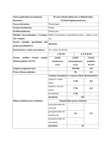 Nazwa jednostki prowadzącej Wyższa Szkoła Medyczna w Białymstoku, kierunek: Wydział Ogólnomedyczny Nazwa kierunku: Fizjoterapia Poziom kształcenia: Drugi Profil kształcenia: Praktyczny Moduły wprowadzające / wymaga- Efekty kształcenia z przedmiotu etyka – studia I stopnia wstępne: Nazwa modułu nia (przedmiot lub grupa przedmiotów): Koordynator, osoby prowadzące: Bioetyka dr n. hum. M. Dolata 1 ECTS Forma studiów /liczba godzin F-2-P-B-04 studia studia Liczba stacjonarne niestacjonarne punktów w/ćw w/ćw ECTS Zajęcia zorganizowane: - 15h/10h 0,8 Praca własna studenta: - 5h 0,2 /liczba punktów ECTS: Godziny kontaktowe z nauczycielem akademickim: udział w wykładach udział w ćwiczeniach konsultacje 5*3h 0,5 5*2h 0,3 1*2h - RAZEM: Bilans nakładu pracy studenta: 27h Samodzielna praca studenta: przygotowanie do - ćwiczeń przygotowanie do kolokwiów przygotowanie do egzaminu RAZEM: 0,2 5h 5h Cele modułu: Student zna zagadnieniami etyki zawodowej w pracy fizjoterapeuty; umie posługiwać się techniczną terminologią etyczną oraz ujmować dylematy etyczne spotykane w pracy zawodowej; umie rozstrzygać problemy etyczne odwołując się do klasycznych systemów etycznych; zna terminologię etyczną oraz podstawowe zagadnienia etyki zawodu; rozumienie wagę moralnego zachowania w pracy fizjoterapeuty. Efekty kształcenia: Odniesienie do Przedmiotowy Efekty kształcenia efekt kształcenia kierunkowych efektów kształcenia P_W01 posiada wiedzę z zakresu bioetyki K2_W15 P_W02 zna koncepcje i nurty w bioetyce światowej K2_W21 P_W03 zna kodeks etyki zawodowej K2_W15 P_W04 zna zagadnienia bioetyki w pracy z pacjentem i w ze- K2_W15 spole P_W05 rozumie odrębności kulturowe i religijne K2_W21 P_U01 dyskutuje na temat problemów natury moralnej K2_U13 P_U02 stosuje w praktyce zasady Kodeksu etyki zawodowej K2_U28 P_U03 identyfikuje i szanuje różnice kulturowe i religijne K2_U13 P_U04 student rozstrzyga problemy etyczne K2_U28 P_K01 szanuje prawa pacjenta K2_K14 P_K02 angażuje się w rozwiązywanie problemów bioetycz- K2_K05 nych P_K03 dyskutuje na temat roli bioetyki we współczesnym K2_K05 świecie P_K04 wykazuje świadomość poszanowania godności pacjenta K2_K06 i zachowania tajemnicy zawodowej Wiedza – student: • posiada wiedzę z zakresu bioetyki, • zna koncepcje i nurty w bioetyce światowej; • zna kodeks etyki zawodowej; • zna zagadnienia bioetyki w pracy z pacjentem i w zespole, K2_K14 • rozumie odrębności kulturowe i religijne Umiejętności – student: • dyskutuje na temat problemów natury moralnej, • stosuje w praktyce zasady Kodeksu etyki zawodowej, • identyfikuje i szanuje różnice kulturowe i religijne, • student rozstrzyga problemy etyczne Kompetencje społeczne – student: • szanuje prawa pacjenta; • angażuje się w rozwiązywanie problemów bioetycznych; • dyskutuje na temat roli bioetyki we współczesnym świecie; • wykazuje świadomość poszanowania godności pacjenta i zachowania tajemnicy zawodowej. Forma zajęć/metody dydaktyczne: Wykład, prelekcje multimedialne, zajęcia ćwiczeniowe, omawianie przypadków Forma i warunki zaliczenia przedmiotu w odniesieniu do efektów kształcenia. Nr efektu Metody weryfikacji efektu kształcenia kształcenia Formujące: Podsumowujące: P_W01 Ocena przygotowania do zajęć Zaliczenie pisemne – student generuje / P_W02 Dyskusja w czasie ćwiczeń rozpoznaje odpowiedź (esej, raport; P_W03 Sprawdzanie wiedzy w trakcie ćwiczeń krótkie strukturyzowane pytania /SSQ/; P_W04 Ocena aktywności studenta w czasie test wielokrotnego wyboru /MCQ/; test P_W05 zajęć wielokrotnej odpowiedzi /MRQ/; test dopasowania; test T/N; test uzupełniania odpowiedzi) P_U01 Bieżąca informacja zwrotna P_U02 Opis przypadku P_U03 Ocena aktywności studenta w czasie P_U04 zajęć Projekt, prezentacja Dyskusja w czasie ćwiczeń P_K01 Bieżąca informacja zwrotna Przedłużona obserwacja przez opieku- P_K02 Dyskusja w czasie ćwiczeń na / nauczyciela prowadzącego P_K03 Ocena 360° (opinie nauczycieli, kole- P_K04 gów/koleżanek, pacjentów, innych współpracowników) Samoocena (w tym portfolio) Treści programowe: Wykłady: 15 godzin 1. Istota starożytnej i średniowiecznej myśli etycznej. - 1h 2. Etyka świecka nowożytnego świata. – 1h 3. Historia etyki w dziejach medycyny. – 1h 4. Bioetyka – powstanie, rozwój, zadania. – 1h 5. Fizjoterapeuta a lekarz i pielęgniarka. – 1h 6. Podstawą bioetyki są moralne prawa pacjenta. – 1h 7. Ochrona jednostki w badaniach np. do pracy magisterskiej. – 1h 8. Dylematy bioetyki trzeciego tysiąclecia. – 1h 9. Etyka deontologiczna. – 1h 10. Etyka zgody na zabiegi fizykoterapeutyczne, zasady zaufania, swoboda wyboru fizjoterapeuty, wolność decydowania o wyborze metody, problem zgody zastępczej. – 1h 11. Problem bólu wynikającego z choroby i bólu podczas fizjoterapii. – 1h 12. Medycyna paliatywna, praca w hospicjum. – 1h 13. Deklaracja deontologiczna pracowników zawodów medycznych. – 1h 14. Poszanowanie godności pacjenta. – 1h 15. Błąd i tajemnica w sztuce fizjoterapii. – 1h Ćwiczenia: 10 godzin 1. Zasady moralności w bioetyce - aborcja, antykoncepcja, informowanie o chorobie nieuleczalnej. – 2h 2. Fizjoterapeuta a komunikowanie z pacjentem. – 2h 3. Eutanazjia. Cierpienie pacjenta i jego wartość. – 2h 4. Europejska konwencja bioetyczna, Prawo naturalne. – 2h 5. Etyka badań i eksperymentów naukowych– 2h Literatura podstawowa: 1. Biesaga T., Systemy bioetyki, Kraków, 2003 2. Bołoz W., Bioetyka i prawa człowieka, Warszawa, 2007 3. Czarkowski M., Różyńska J., Świadoma zgoda na udział w eksperymencie medycznym, Warszawa, 2008 4. Wójcik B., Bioetyka i tożsamość człowieka, Tarnów, 2007 5. Mephan B.: Bioetyka. Wyd. PWN, Warszawa 2008. 6. Meirieu P.: Moralne wybory nauczycieli. Etyka i pedagogika. Wyd. Fraszka Edukacyjna, 2003. 7. Brzeziński T.: Etyka lekarska. Wyd. PZWL, Warszawa 2002. Lit