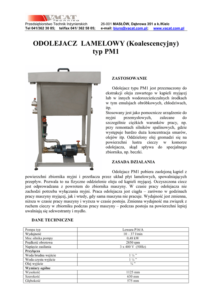 Przedsiębiorstwo Technik Inżynierskich Tel 041/362 30 85; tel/fax 041/ 362 58 05; 26-001 MASŁÓW, Dąbrowa 351 a k./Kielc e-mail: [email protected]; www.vacat.com.pl ODOLEJACZ LAMELOWY (Koalescencyjny) typ PM1 ZASTOSOWANIE Odolejacz typu PM1 jest przeznaczony do ekstrakcji oleju zawartego w kąpieli myjącej lub w innych wodorozcieńczalnych środkach w tym emulsjach obróbkowych, chłodziwach, itp. Stosowany jest jako pomocnicze urządzenie do myjni przemysłowych, zalecane do szczególnie ciężkich warunków pracy, np. przy remontach silników spalinowych, gdzie występuje bardzo duża koncentracja smarów, olejów itp. Oddzielony olej gromadzi się na powierzchni lustra cieczy w komorze odolejacza, skąd spływa do specjalnego zbiornika, np. beczki. ZASADA DZIAŁANIA Odolejacz PM1 pobiera zaolejoną kąpiel z powierzchni zbiornika myjni i przetłacza przez układ płyt lamelowych, spowalniających przepływ. Pozwala to na fizyczne oddzielenie oleju od kąpieli myjącej. Oczyszczona ciecz jest odprowadzana z powrotem do zbiornika maszyny. W czasie pracy odolejacza nie zachodzi potrzeba wyłączania myjni. Praca odolejacza jest ciągła – zarówno w godzinach pracy maszyny myjącej, jak i wtedy, gdy sama maszyna nie pracuje. Wydajność jest zmienna, niższa w czasie pracy maszyny i wyższa w czasie postoju. Zmienna wydajność ma związek z ruchem cieczy w zbiorniku podczas pracy maszyny – podczas postoju na powierzchni lepiej uwalniają się sekwestranty i mydło. DANE TECHNICZNE Pompa typ Wydajność Moc silnika pompy Prędkość obrotowa Napięcie zasilania Przyłącza Woda brudna wejście Woda czysta wyjście Olej wyjście Wymiary ogólne Wysokość Szerokość Głębokość Lowara P16/A 10 – 37 l/min 0,48 kW 2850 rpm 3 x 400 V (50Hz) 1¼” 1¼” ¾” 1125 mm 630 mm 575 mm
