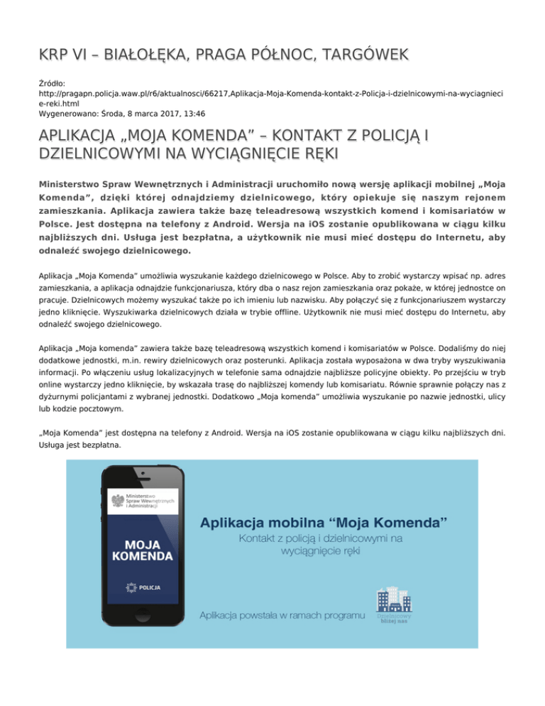 KRP VI – BIAŁOŁĘKA, PRAGA PÓŁNOC, TARGÓWEK Źródło: http://pragapn.policja.waw.pl/r6/aktualnosci/66217,Aplikacja-Moja-Komenda-kontakt-z-Policja-i-dzielnicowymi-na-wyciagnieci e-reki.html Wygenerowano: Środa, 8 marca 2017, 13:46 APLIKACJA „MOJA KOMENDA” – KONTAKT Z POLICJĄ I DZIELNICOWYMI NA WYCIĄGNIĘCIE RĘKI Ministerstwo Spraw Wewnętrznych i Administracji uruchomiło nową wersję aplikacji mobilnej „Moja Komenda”, dzięki której odnajdziemy dzielnicowego, który opiekuje się naszym rejonem zamieszkania. Aplikacja zawiera także bazę teleadresową wszystkich komend i komisariatów w Polsce. Jest dostępna na telefony z Android. Wersja na iOS zostanie opublikowana w ciągu kilku najbliższych dni. Usługa jest bezpłatna, a użytkownik nie musi mieć dostępu do Internetu, aby odnaleźć swojego dzielnicowego. Aplikacja „Moja Komenda” umożliwia wyszukanie każdego dzielnicowego w Polsce. Aby to zrobić wystarczy wpisać np. adres zamieszkania, a aplikacja odnajdzie funkcjonariusza, który dba o nasz rejon zamieszkania oraz pokaże, w której jednostce on pracuje. Dzielnicowych możemy wyszukać także po ich imieniu lub nazwisku. Aby połączyć się z funkcjonariuszem wystarczy jedno kliknięcie. Wyszukiwarka dzielnicowych działa w trybie offline. Użytkownik nie musi mieć dostępu do Internetu, aby odnaleźć swojego dzielnicowego. Aplikacja „Moja komenda” zawiera także bazę teleadresową wszystkich komend i komisariatów w Polsce. Dodaliśmy do niej dodatkowe jednostki, m.in. rewiry dzielnicowych oraz posterunki. Aplikacja została wyposażona w dwa tryby wyszukiwania informacji. Po włączeniu usług lokalizacyjnych w telefonie sama odnajdzie najbliższe policyjne obiekty. Po przejściu w tryb online wystarczy jedno kliknięcie, by wskazała trasę do najbliższej komendy lub komisariatu. Równie sprawnie połączy nas z dyżurnymi policjantami z wybranej jednostki. Dodatkowo „Moja komenda” umożliwia wyszukanie po nazwie jednostki, ulicy lub kodzie pocztowym. „Moja Komenda” jest dostępna na telefony z Android. Wersja na iOS zostanie opublikowana w ciągu kilku najbliższych dni. Usługa jest bezpłatna. Zainstaluj wtyczkę Flash, aby zobaczyć odtwarzacz. Ocena: 0/5 (0) Tweetnij