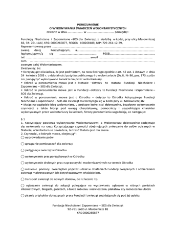 POROZUMIENIE O WYKONYWANIU ŚWIADCZEŃ WOLONTARYSTYCZNYCH zawarte w dniu ................... w ................................. pomiędzy : Fundacją Niechciane i Zapomniane –SOS dla Zwierząt, z siedzibą w Łodzi, przy ulicy Malowniczej 82, 92- 761 Łódź, KRS: 0000265877, REGON 100268188, NIP: 729-261-12-79, Reprezentowaną przez ............................................................................................................................ zwaną dalej Korzystającym, a............................................................................................... legitymującym/ą się ............................................, PESEL....................................................., tel. ...............................................................................email ……............................................................ zam. ......................................................................................................................................................., zwanym dalej Wolontariuszem. Zważywszy, że: • Korzystający oświadcza, że jest podmiotem, na rzecz którego zgodnie z art. 42 ust. 1 Ustawy z dnia 24 kwietnia 2003 r. o działalności pożytku publicznego i o wolontariacie (Dz.U. Nr 96, poz. 873 z późn zm.) mogą byd wykonywane świadczenia przez wolontariuszy. • Ilekrod w porozumieniu mowa jest o Statucie –dotyczy to statutu Fundacji Niechciane i Zapomniane – SOS dla Zwierząt. • Ilekrod w porozumieniu mowa jest o Fundacji –dotyczy to Fundacji Niechciane i Zapomniane – SOS dla Zwierząt. ⦁ Ilekrod w porozumieniu mowa jest o Ośrodku – dotyczy to Ośrodka Adopcyjnego Fundacji Niechciane i Zapomniane – SOS dla Zwierząt mieszczącego się w Łodzi przy ul. Malowniczej 82 • Mając na względzie ideę wolontariatu, u podstaw której stoi dobrowolne, bezpłatne wykonywanie czynności, a także biorąc pod uwagę charytatywny, pomocniczy i uzupełniający charakter wykonywanych przez wolontariuszy świadczeo, Strony porozumienia uzgadniają, co następuje: §1 1. Korzystający powierza wykonywanie Wolontariuszowi, a Wolontariusz dobrowolnie podejmuje się wykonania na rzecz Korzystającego czynności obejmujących zmierzanie do celów opisanych w Statucie, a Wolontariusz oświadcza, że treśd Statutu jest mu znana. 2. Czynności, o których mowa, obejmują*: ⃝ wyprowadzanie psów ⃝ sprzątanie pomieszczeo dla zwierząt ⃝ pielęgnacja zwierząt w Ośrodku ⃝ wykonywanie prac porządkowych w Ośrodku ⃝ wykonywanie drobnych prac naprawczych i modernizacyjnych na terenie Ośrodka ⃝ niesienie pomocy zwierzętom poprzez udział w działaniach Fundacji związanych z odbieraniem zwierząt maltretowanych ich dotychczasowym właścicielom, ⃝ transport zwierząt do nowych domów, do i z lecznic itp. ⃝ ogłaszanie zwierząt do adopcji polegające na wystawianiu ogłoszeo w różnych portalach internetowych, blogach, gazetach, a także robieniu i rozwieszaniu plakatów czy roznoszeniu ulotek ⃝ pisanie artykułów dotyczących pracy Fundacji i zwierząt znajdujących się pod jej opieką Fundacja Niechciane i Zapomniane – SOS dla Zwierząt 92-761 Łódź ul. Malownicza 82 KRS 0000265877 ⃝ nawiązywanie kontaktów z firmami zewnętrznymi i instytucjami mogącymi pomóc w pracy Fundacji a w szczególności sponsorów i darczyoców ⃝ informowanie o istnieniu Fundacji potencjalnych zainteresowanych współpracą, reklamowanie Fundacji ⃝ udział w akcjach organizowanych przez fundację, ⃝ organizowanie i uczestnictwo w zbiórkach karmy dla zwierząt §2 1. Wolontariusz oświadcza, że posiada kwalifikacje i spełnia wymagania niezbędne do wykonywania powierzonych niżej czynności. 2. Korzystający poinformował Wolontariusza o zasadach bezpiecznego i higienicznego wykonywania świadczeo oraz takie warunki zapewnia. 3. Korzystający poinformował Wolontariusza o przysługujących mu prawach i ciążących obowiązkach zgodnie z Ustawą z dnia z dnia 24 kwietnia 2003 r. o działalności pożytku publicznego i o wolontariacie (Dz.U. 2003 Nr 96 poz. 873 z późn. zm.) oraz zapewnił dostępnośd tych informacji. (Kopia ustawy Może być w ośrodku i ewentualnie na stronie Fundacji) §3 1. Strony Umowy uzgadniają, że czynności określone w § 1 będą wykonywane od dniapodpisania porozumienia do (wpisać dzieo lub bezterminowo) …………………………………………. 2. Miejscem wykonywania czynności będzie* ⃝ region zamieszkania Wolontariusza, a w razie Jego przemieszczania się teren całego kraju, ⃝ Ośrodek i jego okolice §4 Z uwagi na charakter i ideę wolontariatu Wolontariusz jest obowiązany do wykonywania uzgodnionych czynności osobiście. Wolontariusz za swoje czynności nie otrzyma wynagrodzenia. §5 Korzystający zobowiązuje się pokrywad niezbędne koszty ponoszone przez Wolontariusza, związane z wykonywaniem świadczeo na rzecz Korzystającego, tylko za wcześniejszym porozumieniem z Korzystającym, po udokumentowaniu poniesionych kosztów, w szczególności: • W przypadku pomocy zwierzętom i ponoszonym z tego tytułu kosztów leczenia, wyżywienia, wykupu, itp. • W przypadku umieszczenia ratowanych zwierząt w hotelu, domu zastępczym, tymczasowym itp. • Inne, indywidualnie uzgodnione, a zmierzające do realizacji celów statutowych. §6 1. Wolontariusz zobowiązuje się zachowania w tajemnicy i poufności informacji, które uzyskał w związku wykonywaniem świadczeo na rzecz Korzystającego. 2. W przypadku udostępnienia przez Korzystającego adresów email, haseł, loginów, legitymacji, dostępów, kodów, itp. Wolontariusz zobowiązuje się nie przekazywad ich osobom trzecim oraz wykorzystywad tylko w celu wykonywania świadczeo na rzecz Korzystającego przez okres obowiązywania niniejszej umowy. W/w udostępnione przez Fundację pozostają jej wyłączną własnością. Fundacja Niechciane i Zapomniane – SOS dla Zwierząt 92-761 Łódź ul. M