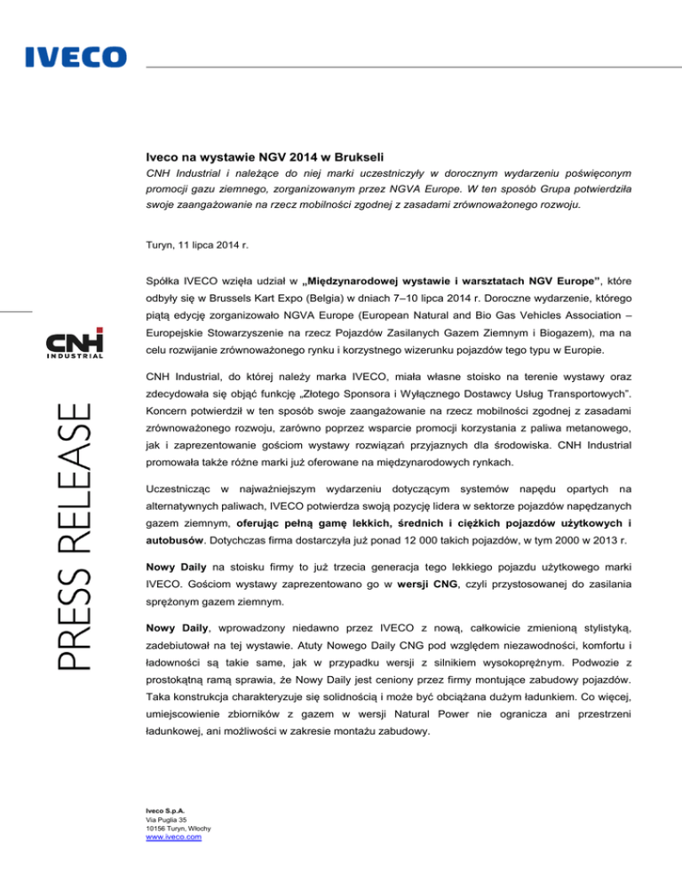 Iveco na wystawie NGV 2014 w Brukseli CNH Industrial i należące do niej marki uczestniczyły w dorocznym wydarzeniu poświęconym promocji gazu ziemnego, zorganizowanym przez NGVA Europe. W ten sposób Grupa potwierdziła swoje zaangażowanie na rzecz mobilności zgodnej z zasadami zrównoważonego rozwoju. Turyn, 11 lipca 2014 r. Spółka IVECO wzięła udział w „Międzynarodowej wystawie i warsztatach NGV Europe”, które odbyły się w Brussels Kart Expo (Belgia) w dniach 7–10 lipca 2014 r. Doroczne wydarzenie, którego piątą edycję zorganizowało NGVA Europe (European Natural and Bio Gas Vehicles Association – Europejskie Stowarzyszenie na rzecz Pojazdów Zasilanych Gazem Ziemnym i Biogazem), ma na celu rozwijanie zrównoważonego rynku i korzystnego wizerunku pojazdów tego typu w Europie. CNH Industrial, do której należy marka IVECO, miała własne stoisko na terenie wystawy oraz zdecydowała się objąć funkcję „Złotego Sponsora i Wyłącznego Dostawcy Usług Transportowych”. Koncern potwierdził w ten sposób swoje zaangażowanie na rzecz mobilności zgodnej z zasadami zrównoważonego rozwoju, zarówno poprzez wsparcie promocji korzystania z paliwa metanowego, jak i zaprezentowanie gościom wystawy rozwiązań przyjaznych dla środowiska. CNH Industrial promowała także różne marki już oferowane na międzynarodowych rynkach. Uczestnicząc w najważniejszym wydarzeniu dotyczącym systemów napędu opartych na alternatywnych paliwach, IVECO potwierdza swoją pozycję lidera w sektorze pojazdów napędzanych gazem ziemnym, oferując pełną gamę lekkich, średnich i ciężkich pojazdów użytkowych i autobusów. Dotychczas firma dostarczyła już ponad 12 000 takich pojazdów, w tym 2000 w 2013 r. Nowy Daily na stoisku firmy to już trzecia generacja tego lekkiego pojazdu użytkowego marki IVECO. Gościom wystawy zaprezentowano go w wersji CNG, czyli przystosowanej do zasilania sprężonym gazem ziemnym. Nowy Daily, wprowadzony niedawno przez IVECO z nową, całkowicie zmienioną stylistyką, zadebiutował na tej wystawie. Atuty Nowego Daily CNG pod względem niezawodności, komfortu i ładowności są takie same, jak w przypadku wersji z silnikiem wysokoprężnym. Podwozie z prostokątną ramą sprawia, że Nowy Daily jest ceniony przez firmy montujące zabudowy pojazdów. Taka konstrukcja charakteryzuje się solidnością i może być obciążana dużym ładunkiem. Co więcej, umiejscowienie zbiorników z gazem w wersji Natural Power nie ogranicza ani przestrzeni ładunkowej, ani możliwości w zakresie montażu zabudowy. Iveco S.p.A. Via Puglia 35 10156 Turyn, Włochy www.iveco.com Na stoisku IVECO wystawiono również przedstawiciela wagi ciężkiej w ofercie marki: model Stralis Natural Power Euro VI z silnikiem przystosowanym do zasilania skroplonym gazem ziemnym (LNG). Była to pierwsza publiczna prezentacja pojazdu z nowym zbiornikiem spełniającym wymogi regulaminu nr 110 EKG ONZ, obowiązującego od 10 czerwca 2014 r. i po raz pierwszy dopuszczającego homologację pojazdów zasilanych LNG. To ważny, nowy etap dla sektora oraz sygnał intensywnej ekspansji rynku ciężkich pojazdów zasilanych LNG przeznaczonych do eksploatacji na średnich trasach. Zasięg Stralisa LNG Euro VI przekracza 750 kilometrów. Ciągnik AT440S33T/P LNG w konfiguracji standardowej jest wyposażony w cztery 70-litrowe zbiorniki CNG oraz 510-litrowy kriogeniczny zbiornik LNG. Gaz ziemny jest zmagazynowany w stanie ciekłym w temperaturze -130°C i pod ciśnieniem 10 barów, a przed wtryskiem do silnika następuje przywrócenie lotnej postaci paliwa. Liczne zalety pojazdu dotyczą zarówno parametrów ekologicznych, jak i rentowności. Pod względem emisji silniki zasilane gazem ziemnym są dużo bardziej przyjazne dla środowiska niż ich wysokoprężne odpowiedniki spełniające normę Euro VI. Gaz ziemny to paliwo całkowicie czyste dzięki radykalnemu obniżeniu emisji cząstek stałych (-95% w porównaniu z silnikiem Diesla) oraz tlenków azotu (-35%). Ponadto pojazdy te umożliwiają ograniczenie emisji CO2 od 10% nawet do 100% – jeżeli wykorzystuje się biometan. Zasilane gazem silniki pracują również ciszej; obniżenie poziomu hałasu o 5 decybeli w porównaniu z silnikami wysokoprężnymi ma szczególne znaczenie w przypadku wywozu śmieci i realizacji dostaw w porze nocnej. Pod względem ekologicznym pojazd umożliwia zmniejszenie TCO (całkowitego kosztu posiadania i użytkowania) nawet o 10%. Gaz ziemny jest również tańszy od oleju napędowego, co pozwala obniżyć koszty paliwa – stanowiące najważniejszy składnik TCO – nawet o 40%. CNH Industrial i zasady polityki dotyczącej gazu ziemnego W związku z wystawą niedawno mianowany dyrektor ds. relacji z instytucjami w CNH Industrial EMEA (Europa, Bliski Wschód, Afryka) wygłosił przemówienie na warsztatach zatytułowanych „Successful Policies” („Skuteczna polityka”). W trakcie spotkania dyskutowano o potrzebie opracowania spójnych zasad polityki w zakresie rozwijania napędu opartego na gazie ziemnym oraz zintegrowanego podejścia poszczególnych podmiotów zaangażowanych w te kwestie. Spotykanie było również okazją do wymiany pomysłów między CNH Industrial, podmiotami z branży 2 zainteresowanymi wykorzystaniem gazu w transporcie i sektorze motoryzacyjnym oraz przedstawicielami instytucji europejskich. IVECO IVECO jest marką CNH Industrial N.V., spółki będącej globalnym liderem w sektorze dóbr kapitałowych, notowanej na Giełdzie Papierów Wartościowych w Nowym Jorku (NYSE: CNHI) oraz na Mercato Telematico Azionario Giełdy Włoskiej (MI: CNHI). IVECO projektuje, produkuje i wprowadza na rynek szeroką gamę pojazdów, w tym: lekkie, średnie i ciężkie auta użytkowe, pojazdy przeznaczone do eksploatacji poza utwardzonymi drogami, autobusy miejskie i dalekobieżne, a także samochody do zadań specjalnych, takie jak wozy straży pożarnej czy pojazdy do misji te