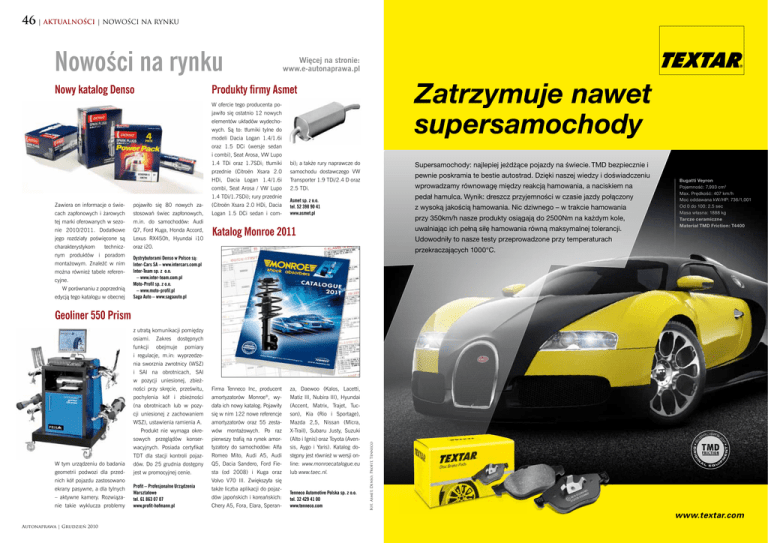 46 | AKTUALNOŚCI | NOWOŚCI NA RYNKU Nowości na rynku Nowy katalog Denso Więcej na stronie: www.e-autonaprawa.pl Zatrzymuje nawet supersamochody Produkty firmy Asmet W ofercie tego producenta po jawiło się ostatnio 12 nowych elementów układów wydecho wych. Są to: tłumiki tylne do modeli Dacia Logan 1.4/1.6i oraz 1.5 DCi (wersje sedan i combi), Seat Arosa, VW Lupo 1.4 TDi oraz 1.7SDi; tłumiki bi); a także rury naprawcze do przednie (Citroën Xsara 2.0 samochodu dostawczego VW HDi, Dacia Logan 1.4/1.6i Transporter 1.9 TDi/2.4 D oraz combi, Seat Arosa / VW Lupo 2.5 TDi. 1.4 TDi/1.7SDi); rury przednie Zawiera on informacje o świe pojawiło się 80 nowych za (Citroën Xsara 2.0 HDi, Dacia cach zapłonowych i żarowych stosowań świec zapłonowych, Logan 1.5 DCi sedan i com tej marki oferowanych w sezo m.in. do samochodów: Audi nie 2010/2011. Dodatkowe Q7, Ford Kuga, Honda Accord, jego rozdziały poświęcone są Lexus RX450h, Hyundai i10 charakterystykom oraz i20. technicz nym produktów i poradom montażowym. Znaleźć w nim można również tabele referen cyjne. W porównaniu z poprzednią edycją tego katalogu w obecnej Supersamochody: najlepiej jeżdżące pojazdy na świecie. TMD bezpiecznie i pewnie poskramia te bestie autostrad. Dzięki naszej wiedzy i doświadczeniu wprowadzamy równowagę między reakcją hamowania, a naciskiem na pedał hamulca. Wynik: dreszcz przyjemności w czasie jazdy połączony Asmet sp. z o.o. tel. 52 398 90 41 www.asmet.pl z wysoką jakością hamowania. Nic dziwnego – w trakcie hamowania przy 350km/h nasze produkty osiągają do 2500Nm na każdym kole, Katalog Monroe 2011 uwalniając ich pełną siłę hamowania równą maksymalnej tolerancji. Bugatti Veyron Pojemność: 7,993 cm3 Max. Prędkość: 407 km/h Moc oddawana kW/HP: 736/1,001 Od 0 do 100: 2.5 sec Masa własna: 1888 kg Tarcze ceramiczne Materiał TMD Friction: T4400 Udowodniły to nasze testy przeprowadzone przy temperaturach przekraczających 1000°C. Dystrybutorami Denso w Polsce są: Inter-Cars SA – www.intercars.com.pl Inter-Team sp. z o.o. – www.inter-team.com.pl Moto-Profil sp. z o.o. – www.moto-profil.pl Saga Auto – www.sagaauto.pl Geoliner 550 Prism z utratą komunikacji pomiędzy osiami. Zakres funkcji obejmuje dostępnych pomiary i regulacje, m.in: wyprzedze nia sworznia zwrotnicy (WSZ) i SAI na obrotnicach, SAI ności przy skręcie, prześwitu, Firma Tenneco Inc, producent za, Daewoo (Kalos, Lacetti, pochylenia kół i zbieżności amortyzatorów Monroe®, wy Matiz III, Nubira III), Hyundai (na obrotnicach lub w pozy dała ich nowy katalog. Pojawiły (Accent, Matrix, Trajet, Tuc cji uniesionej z zachowaniem się w nim 122 nowe referencje son), Kia (Rio i Sportage), WSZ), ustawienia ramienia A. amortyzatorów oraz 55 zesta Mazda 2,5, Nissan (Micra, Produkt nie wymaga okre wów montażowych. Po raz X-Trail), Subaru Justy, Suzuki sowych przeglądów konser pierwszy trafią na rynek amor (Alto i Ignis) oraz Toyota (Aven wacyjnych. Posiada certyfikat tyzatory do samochodów: Alfa sis, Aygo i Yaris). Katalog do TDT dla stacji kontroli pojaz Romeo Mito, Audi A5, Audi stępny jest również w wersji on W tym urządzeniu do badania dów. Do 25 grudnia dostępny Q5, Dacia Sandero, Ford Fie line: www.monroecatalogue.eu geometrii podwozi dla przed jest w promocyjnej cenie. sta (od 2008) i Kuga oraz lub www.taec.nl. nich kół pojazdu zastosowano ekrany pasywne, a dla tylnych – aktywne kamery. Rozwiąza nie takie wyklucza problemy Autonaprawa | Grudzień 2010 Profit – Profesjonalne Urządzenia Warsztatowe tel. 61 863 07 07 www.profit-hofmann.pl Volvo V70 III. Zwiększyła się także liczba aplikacji do pojaz dów japońskich i koreańskich: Chery A5, Fora, Elara, Speran Tenneco Automotive Polska sp. z o.o. tel. 32 429 41 00 www.tenneco.com Fot. Asmet, Denso, Profit, Tenneco w pozycji uniesionej, zbież www.textar.com
